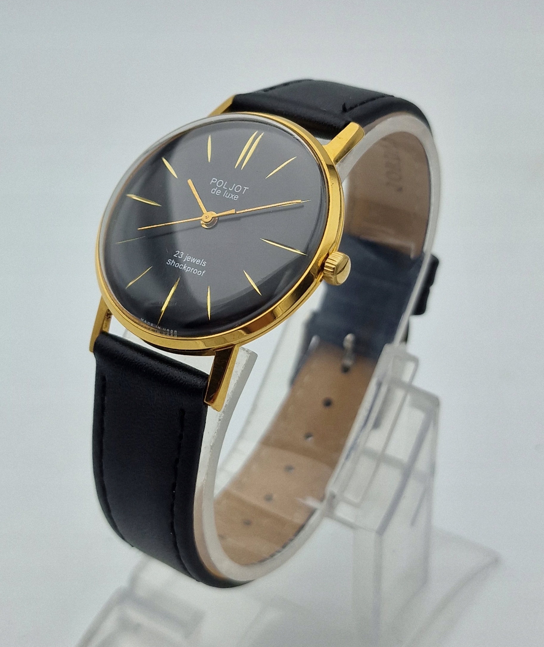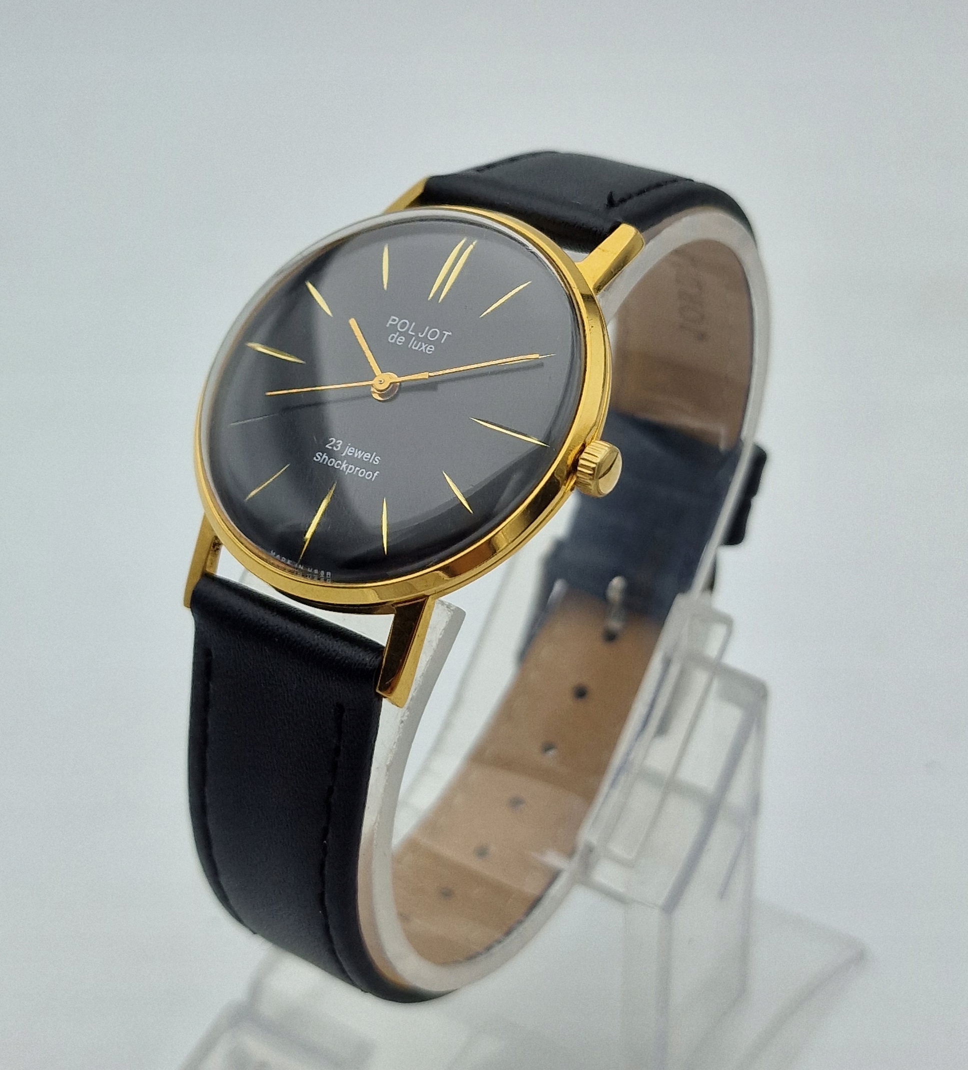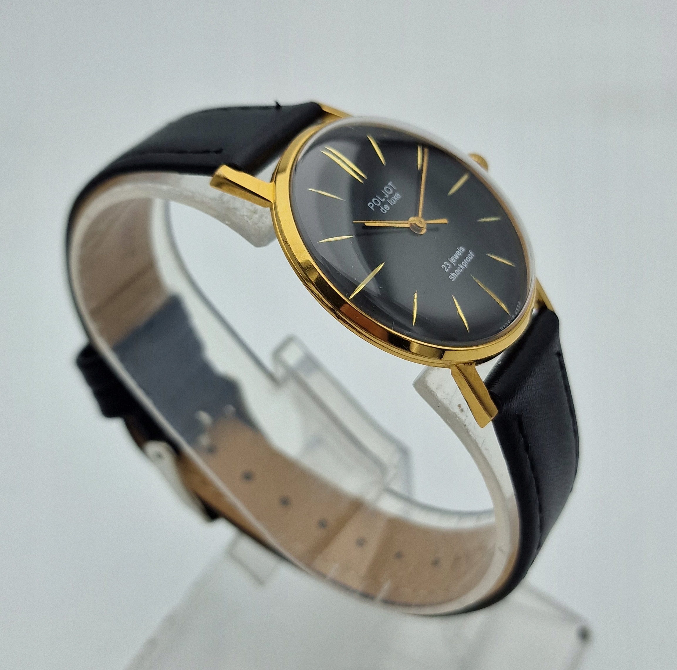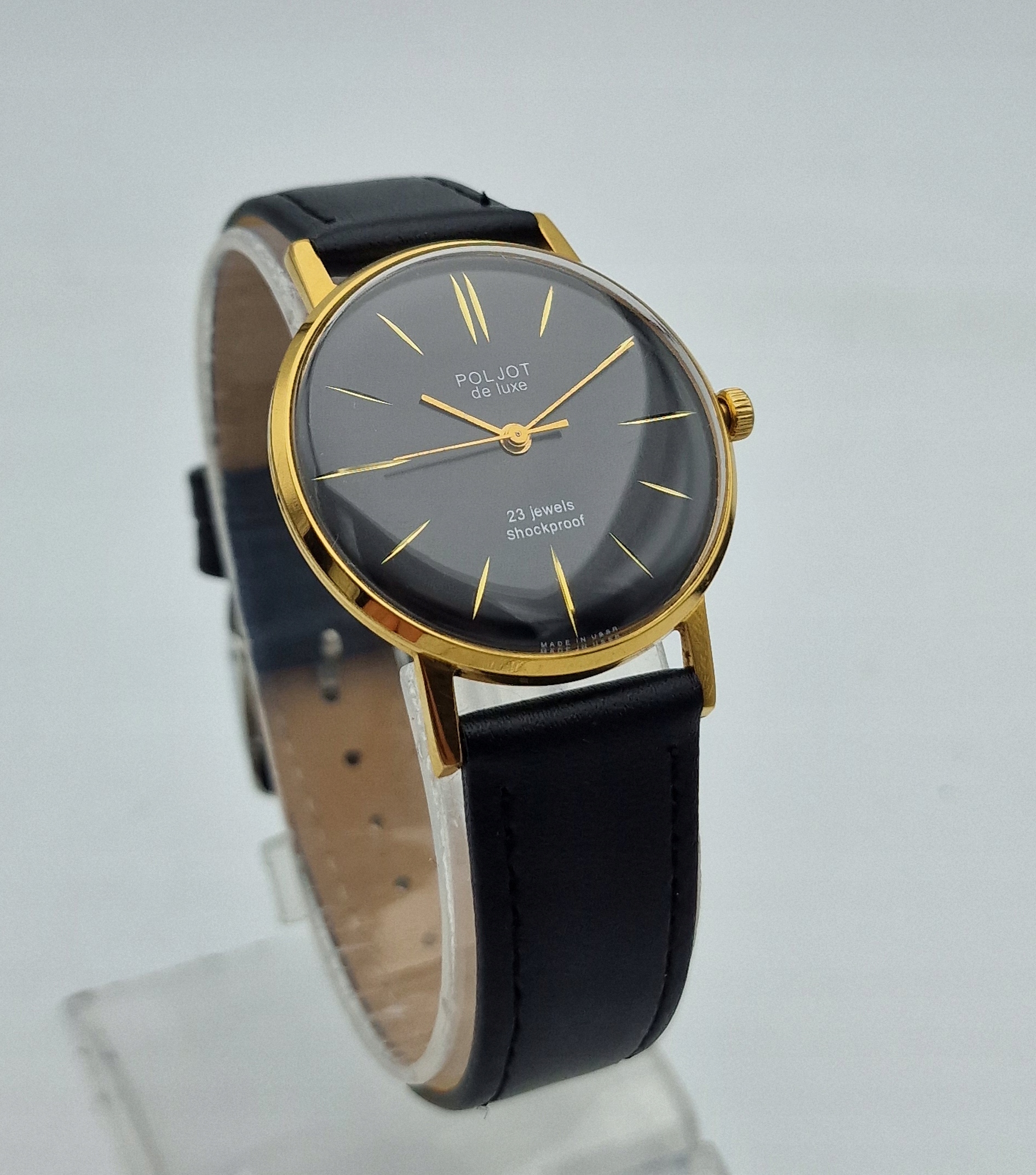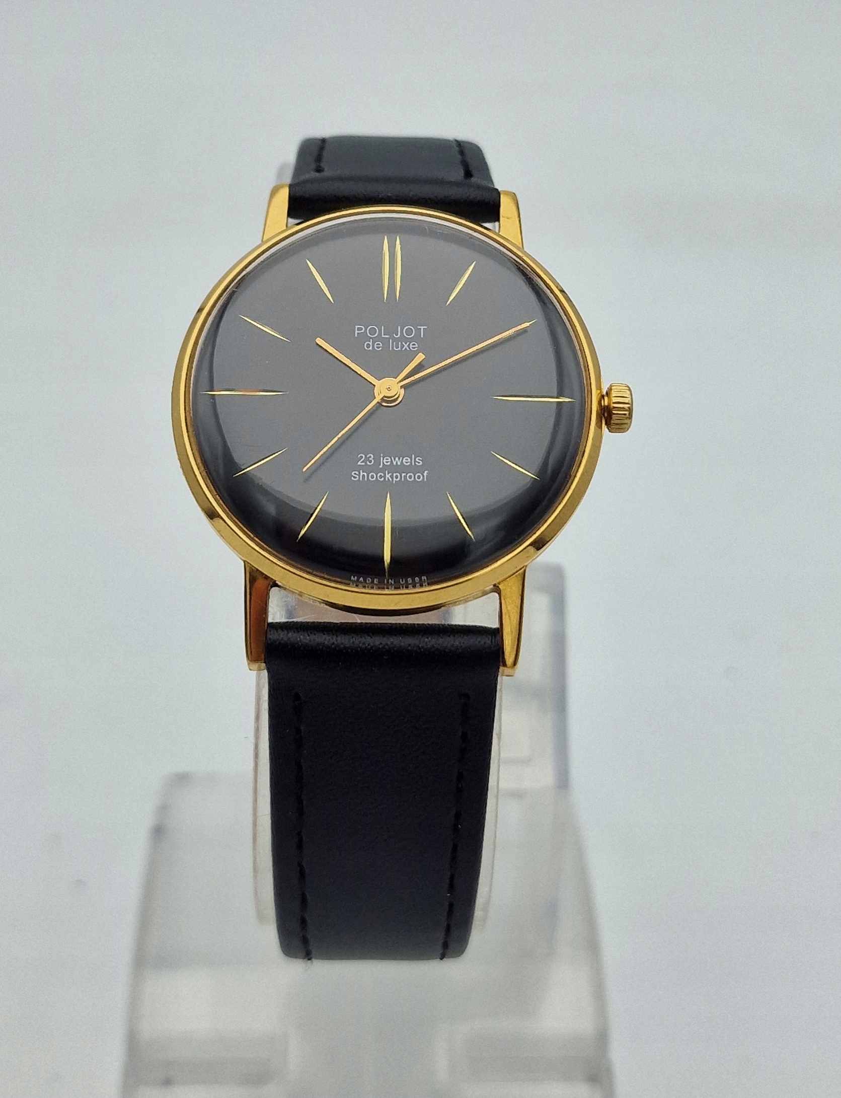 - чорний металевий диск із золотими мітками. Підписаний щит: " poljot de luxe, 23 коштовності, ударах, виготовлені в СРСР ". Щит у ідеальному стані.