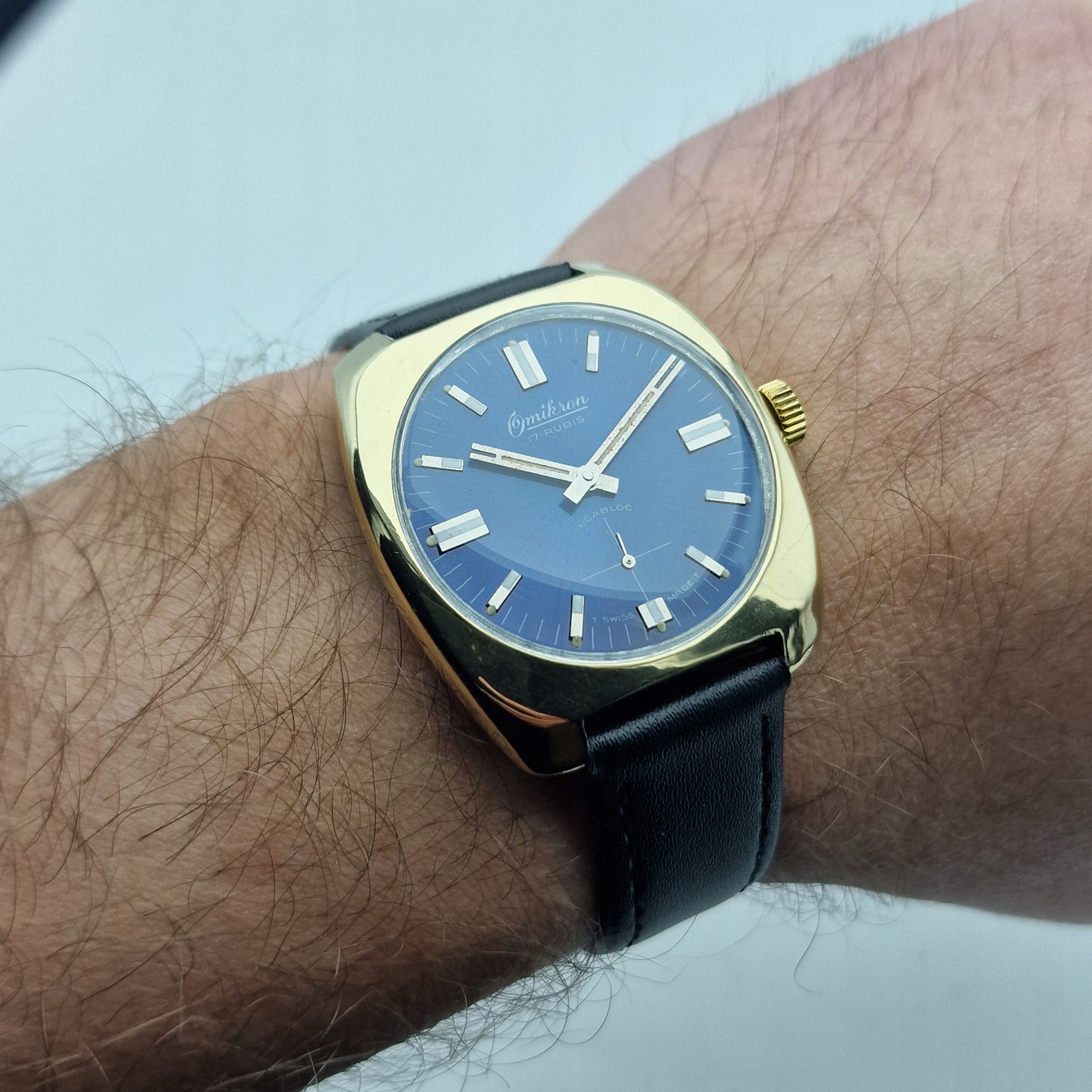 - Синій металевий циферблат з окремою секундною стрілкою на шостій годині. Оригінальний циферблат із підписом: «OMIKRON, 17 RUBIS, INCABLOC, SWISS MADE». Циферблат майже в ідеальному стані, видно на фото.