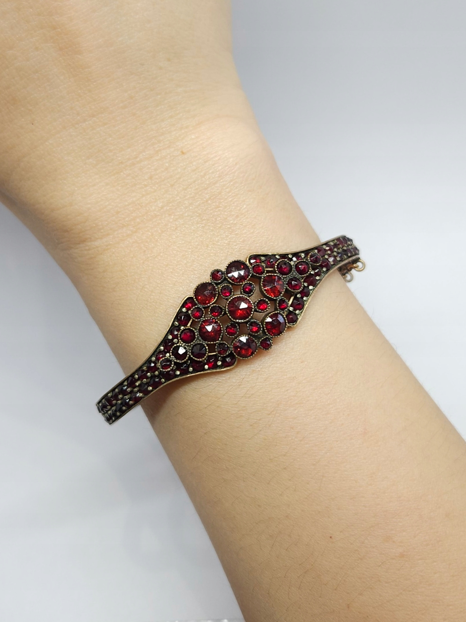 Позолочений жорсткий браслет з гранатами, 19 ст., отвір, окружність 18,0 см.
