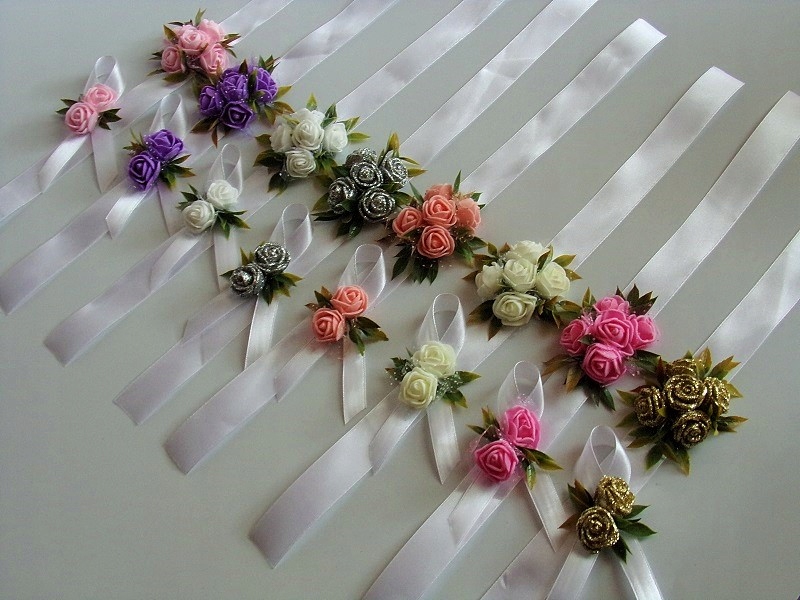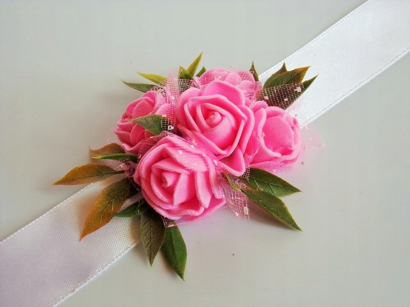 Штифт виготовлений з пінопластових троянд, зеленого листя та білої атласної стрічки з шириною близько 12 мм. Одяг.