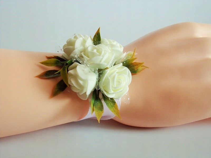 Шпилька виготовлена з поролону, кремових троянд, зеленого листя та білого атласу. стрічка шириною приблизно 12 мм.
