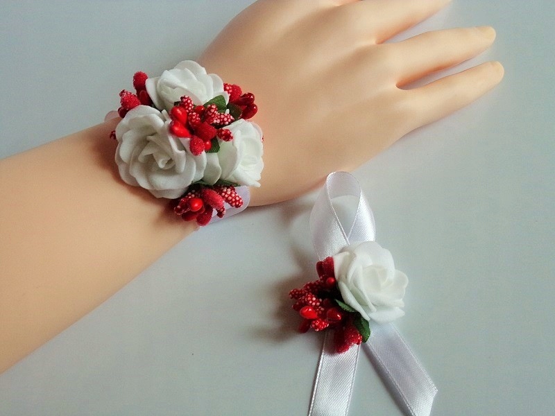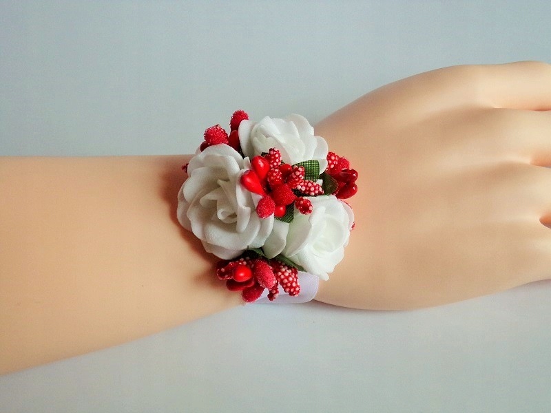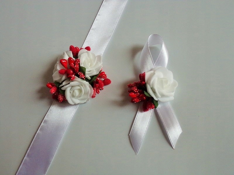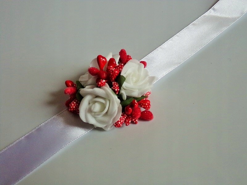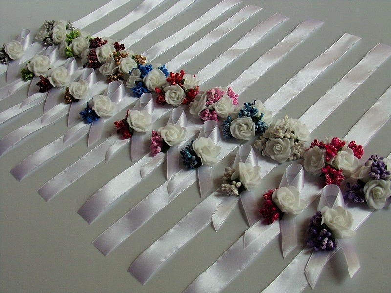 Шпилька виготовлена з білої пінопластової троянди, кольорової фурнітури та білого атласу. стрічка шириною приблизно 12 мм.