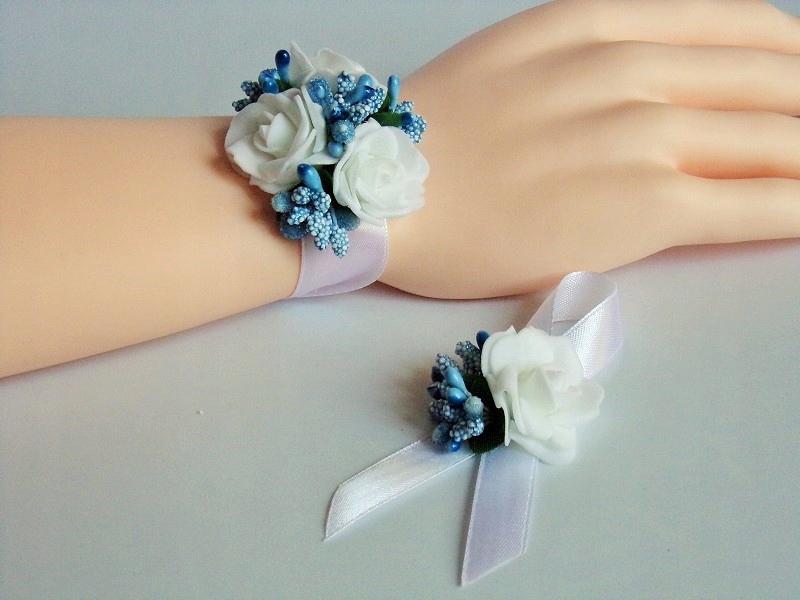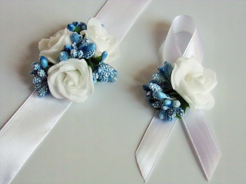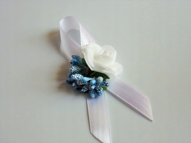 Шпилька виготовлена з білої пінопластової троянди, кольорової фурнітури та білого атласу. стрічка шириною приблизно 12 мм.