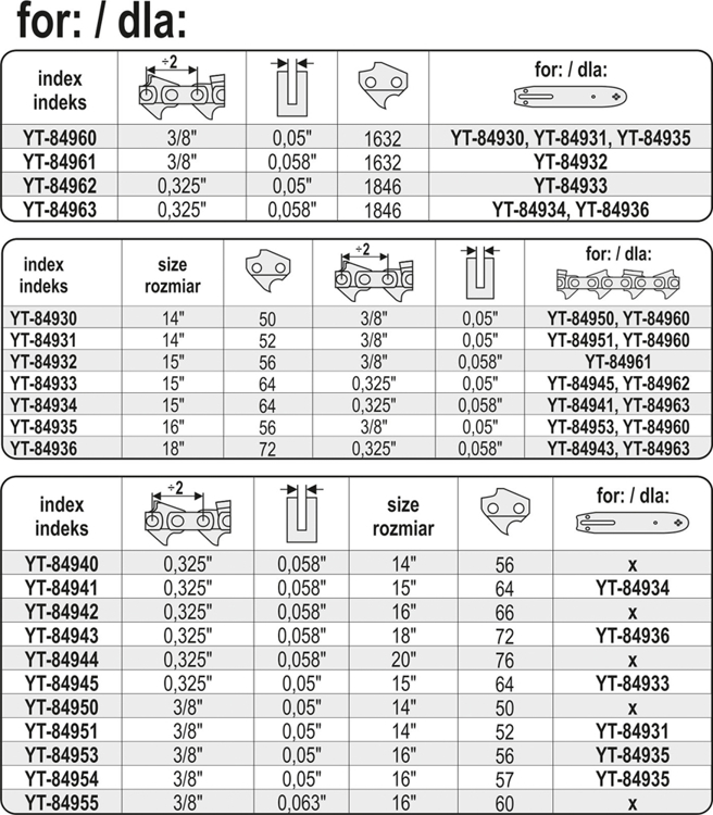- Шкала ланцюга: 1/4 "(6,35 мм), 0,325" (8,255 мм), 3/8 "(9,525 мм), 0,404" (10,26 мм), 90-91