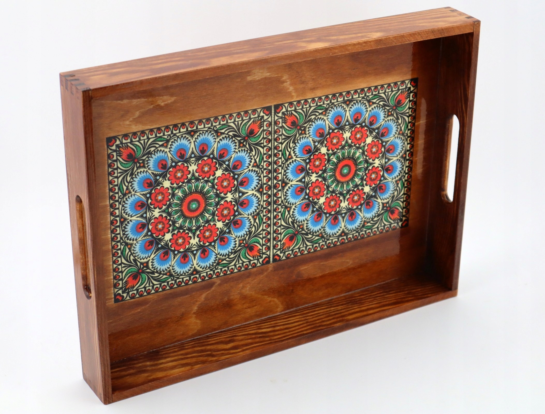 Ця унікальна таця була прикрашена методом декупаж з фольклорними мотивами. візерунок, що надає йому унікальний характер. Квітковий орнамент додає ніжності та свіжості.