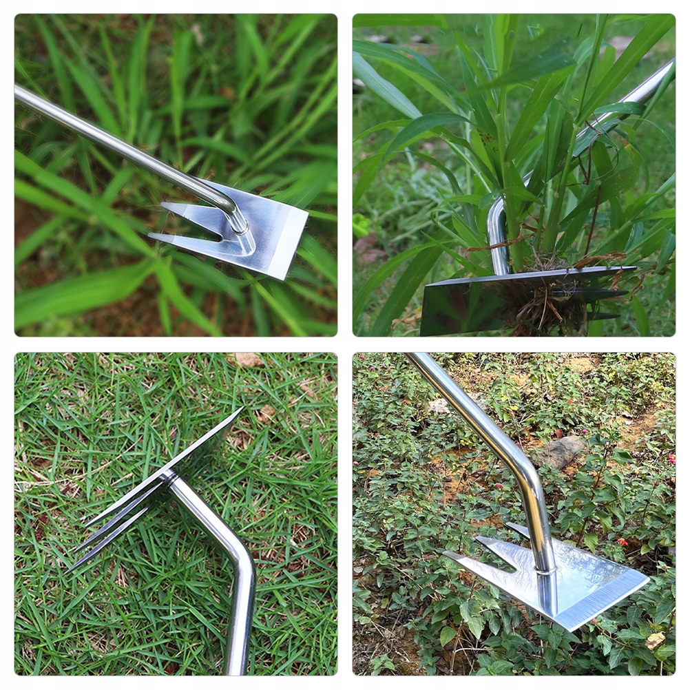Міцні V-подібні наконечники вил просто покладіть вигнуту металеву основу на землю та обкопайте коріння, щоб витягнути. Використовуйте гострі кінчики вил, щоб викопати та відкрити коріння, стебла та листя.