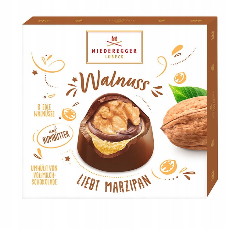 Праліне зі справжнім марципаном і цілими волоськими горіхами, вкриті смачним молочним шоколадом. Ідеальна пропозиція для любителів солодкого в ексклюзивному виданні.