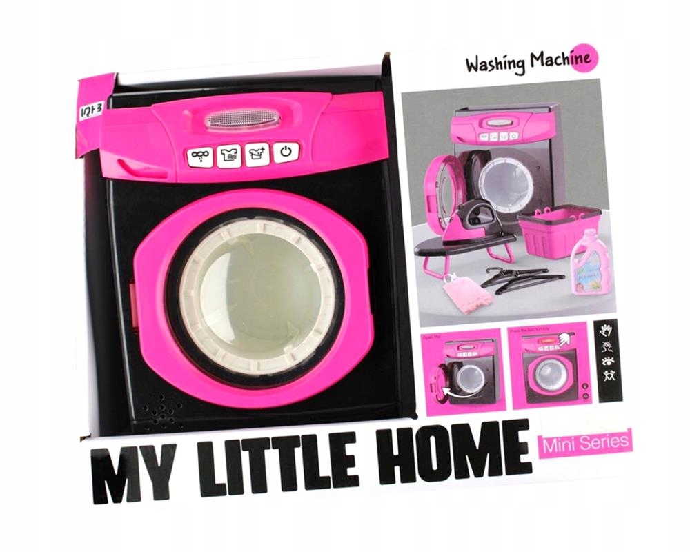 У набір входить: функціональна пральна машина, кошик для білизни, 2 вішалки для білизни, прасувальна дошка, праска та пляшка пральної рідини. Виріб із пластику.
