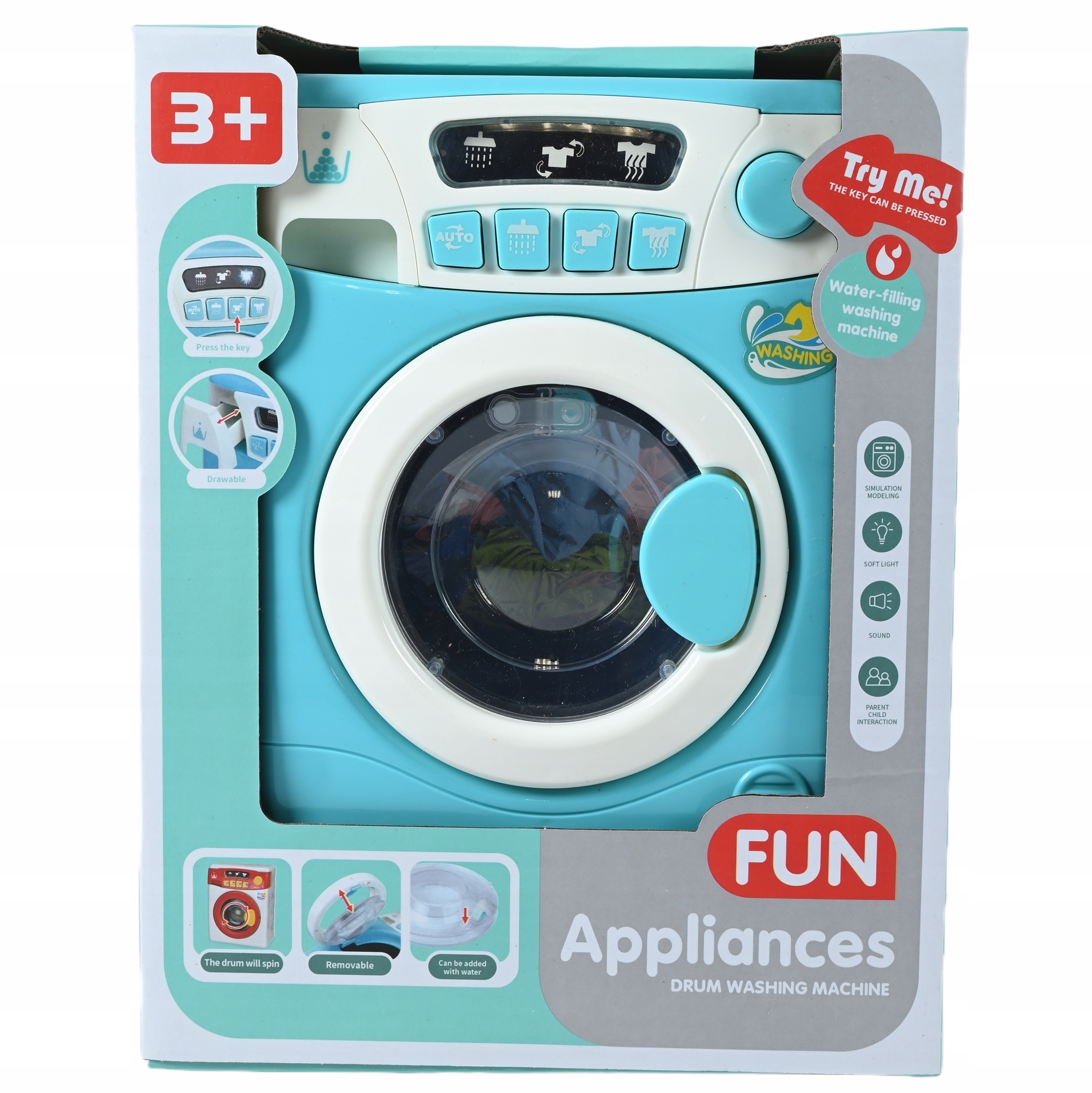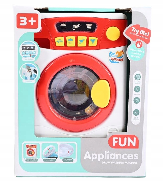 Пральна машина з живленням від батареї — чудовий інструмент для розваги з братами і сестрами, друзями чи батьками. Діти можуть удавати, що прають пральню або ведуть власне господарство, взаємодіючи та виконуючи ролі.