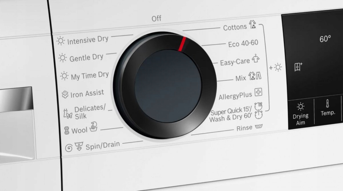 - Програми та опції сушіння:Делікатне (м’яке),Інтенсивне,IronAssist , My Time,Wash&Dry60