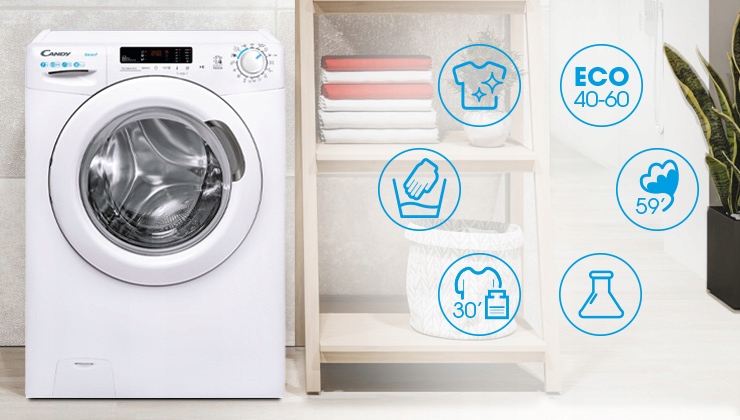 Найкраще поєднання часу та ефективності. Пральні машини Candy дозволяють вибирати між не менше ніж чотирма циклами, які тривають менше години, але є 100% ефективними.