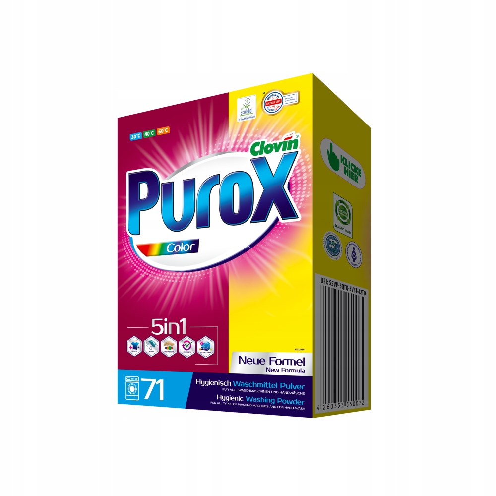 Пральний порошок Purox Color - універсальний засіб, ефективний у всіх видах прання. Також ідеально підходить для ручного прання, ефективний і екологічно чистий.