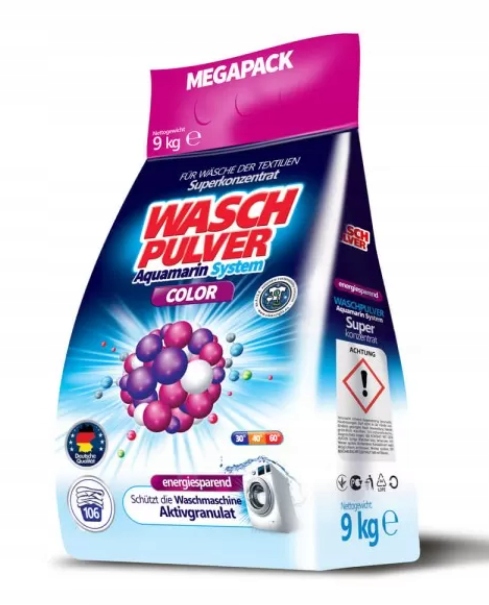 Порошок WaschPulver 9 кг фольга Color Aquamarin - це високоякісний ефективний німецький пральний порошок місткістю до 9 кг. Дуже ефективний, вистачає до 106 прань! Він має інтенсивний запах і дуже добре розчиняється у воді, видаляючи навіть найгірші плями та відновлюючи колір одягу.