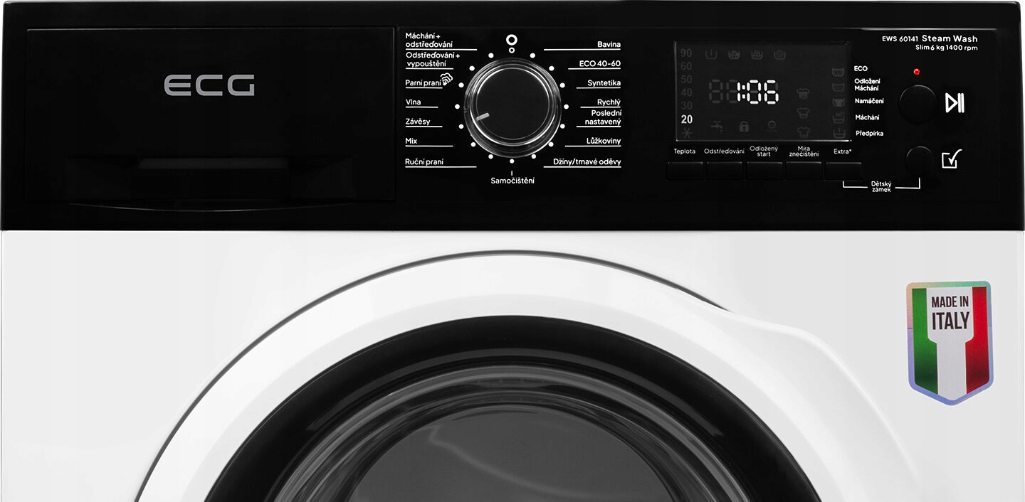 Тонка парова пральна машина з фронтальним завантаженням, 6 кг, 1400 об./хв., енерг. клас А, споживання води в еталонній програмі 40 л, електродвигун BLDC, енергоспоживання на 100 циклів 42 кВт*год, рівень шуму 75 дБ, 15 програм, інтелектуальна програма - остання встановлена програма, програма самоочищення,