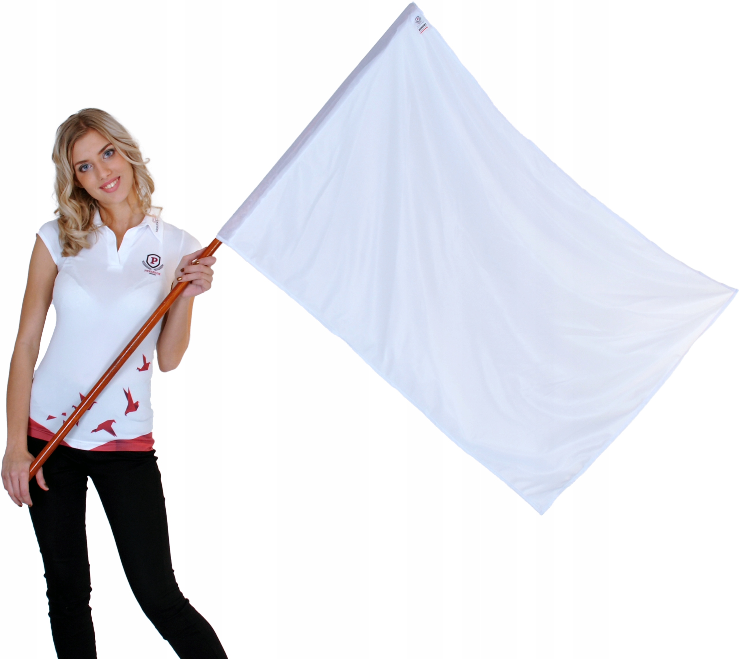 - Білий прапор 112x70 см з древком 120 см (комплект) - наноситься маркером, спреєм або будь-якою іншою фарбою - нанесення на тканину власного гасла чи малюнка, чи оригіналу. Прапор підготовлений для вивішування на древку.