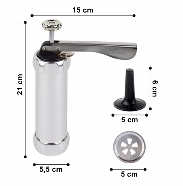 Прес для тортів - ідеальний продукт, який повинен бути на кожній кухні. Пристрій має сталевий поршневий шток і важіль.
