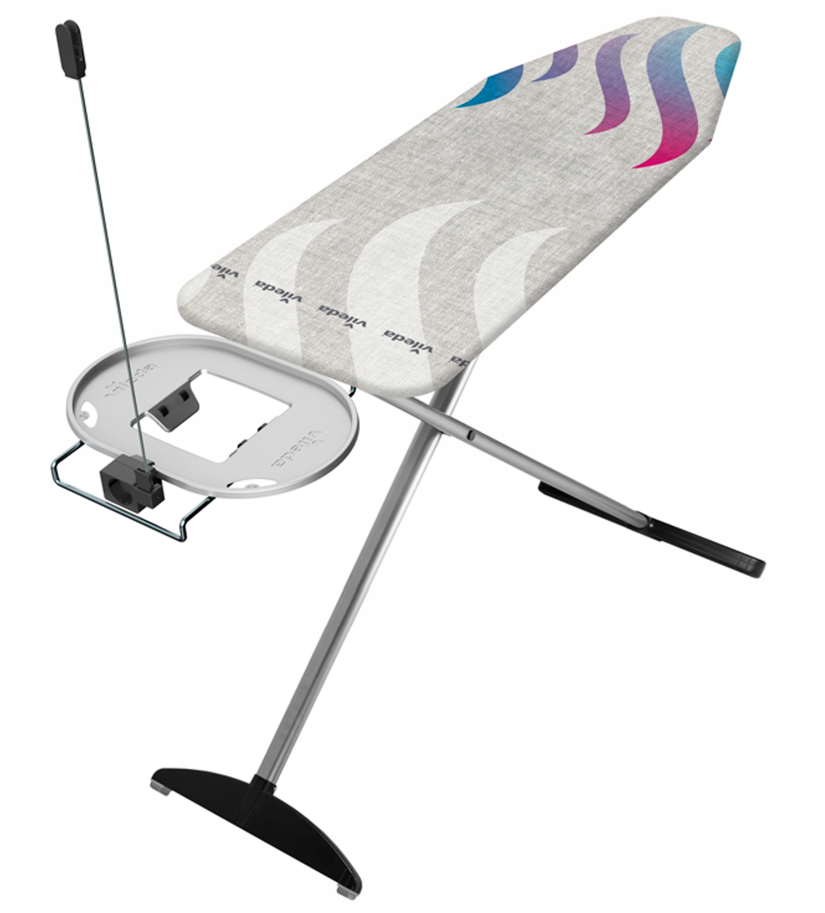 Дошка VILEDA має вбудований подовжувач, який дозволяє легко підключити праску без необхідності використання додаткових кабелів. Велика підставка для праски або парової станції забезпечує зручне місце для розміщення пристрою.
