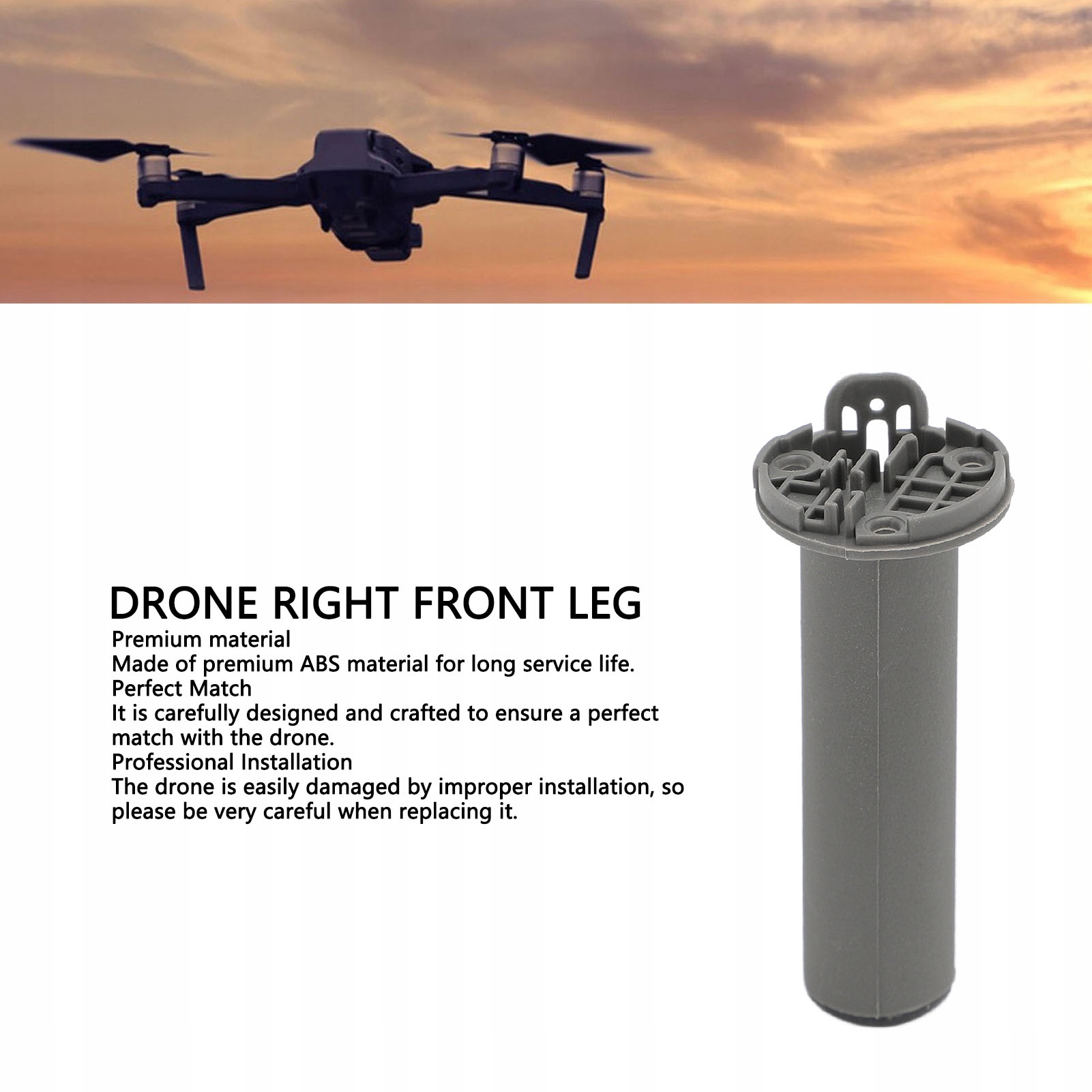 1. СУМІСНІСТЬ: Права передня посадкова опора дрона розроблена для Mavic 2. Якщо праву передню посадкову опору випадково пошкоджено або її потрібно замінити, ремонт можна завершити вчасно, щоб відновити працездатність.