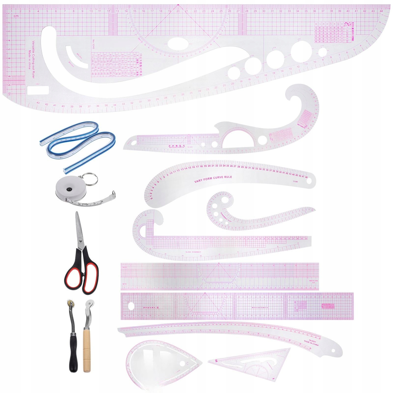 ✅ 1 лінійка для різання, 1 лінійка для пахв, 1 лінійка для одягу, 1 гнучка лінійка, 1 трикутна лінійка, 1 лінійка з комою, 1 лінійка, 1 лінійка, 1 лінійка, 1 лінійка біла, 1 лінійка, 1 x ножиці, 1 x колесо для малювання з дерев’яною ручкою, 1 x колесо для малювання з пластиковою ручкою, 1 x овальна лінійка