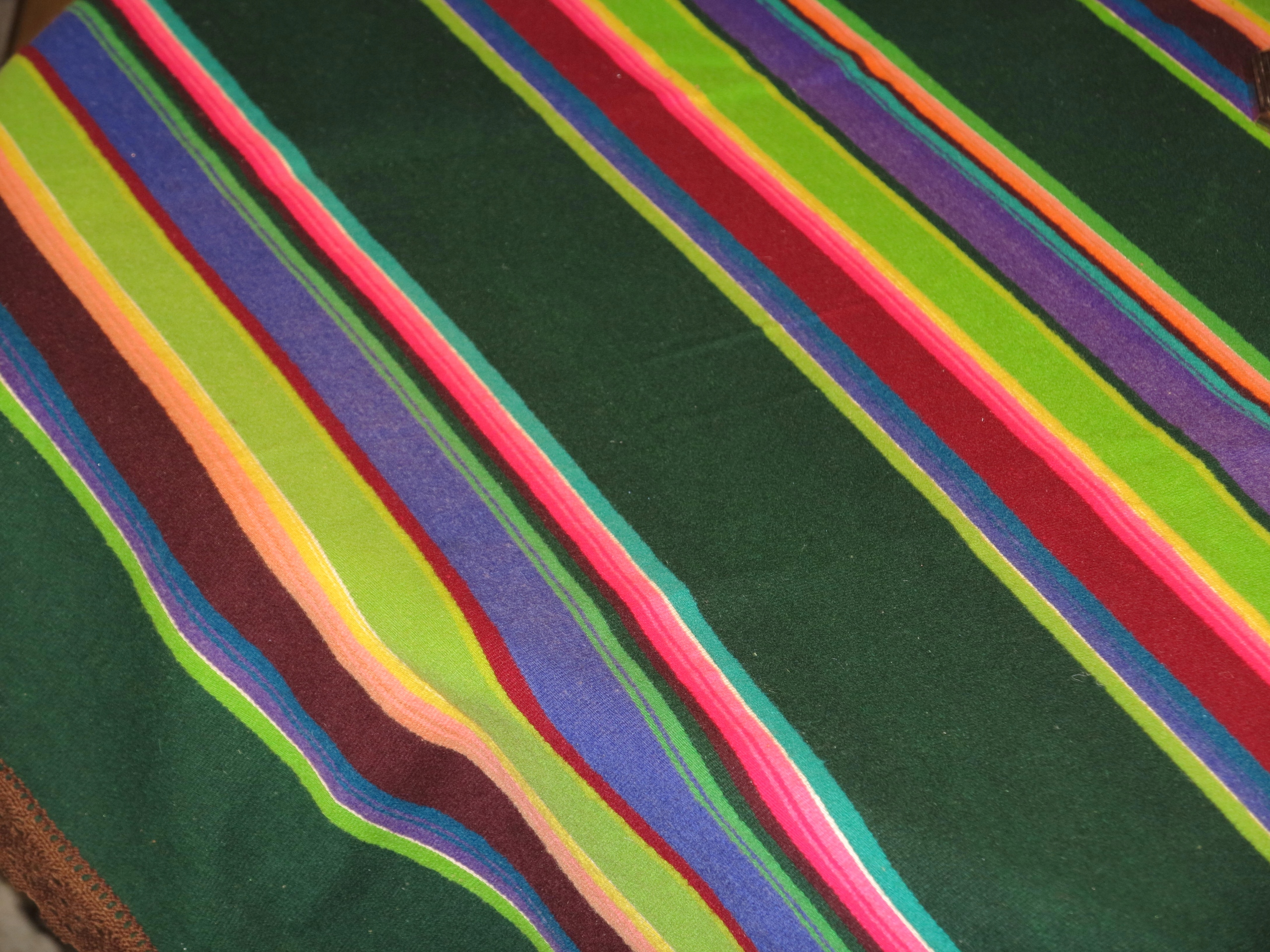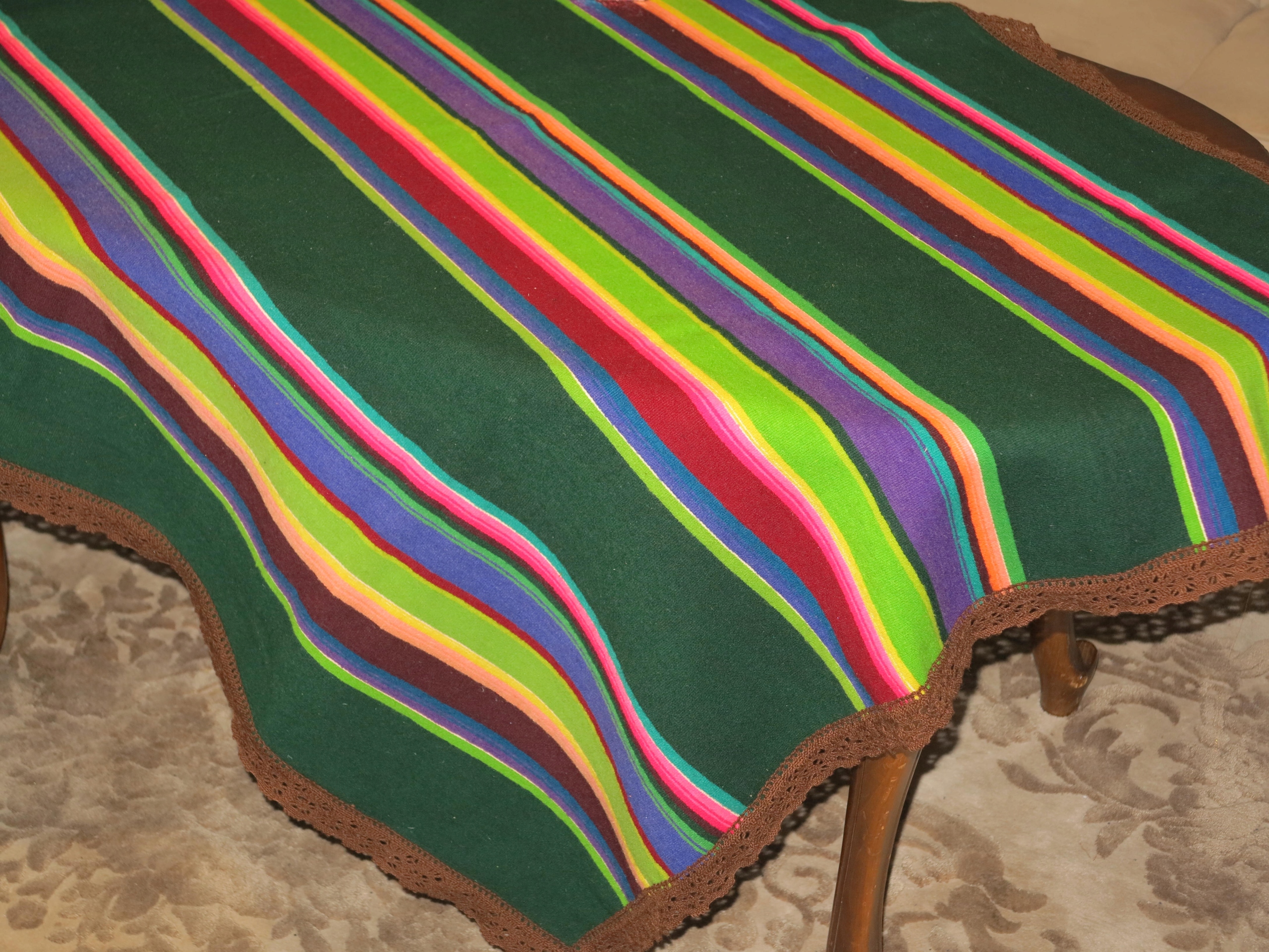 Прекрасна народна вовняна вовняна вовняна скатерна. Зелений фон, ремені веселки. Приблизно за товстим мереживом, закінченим