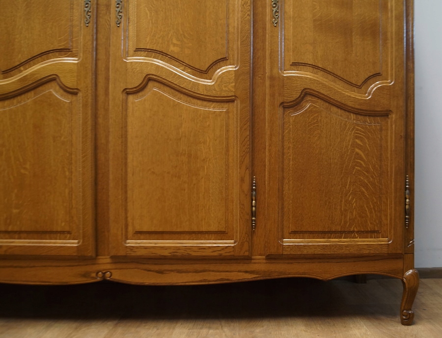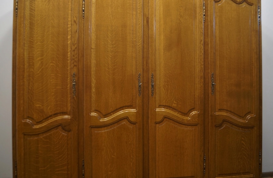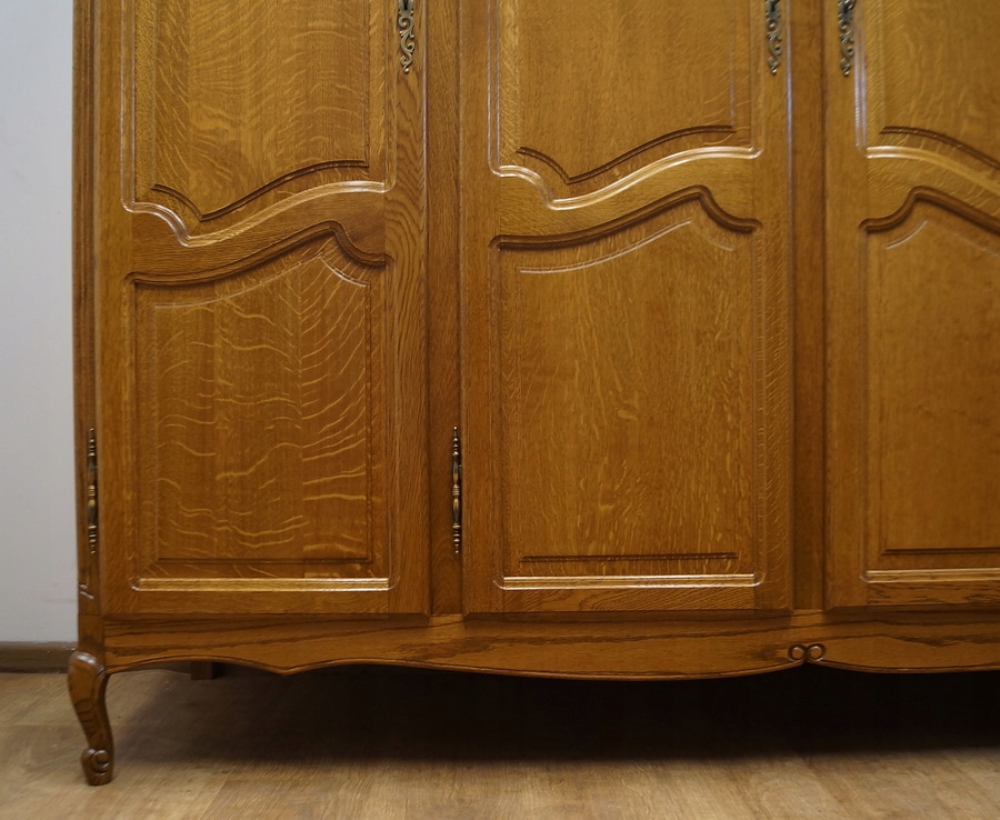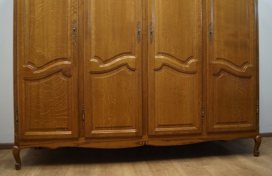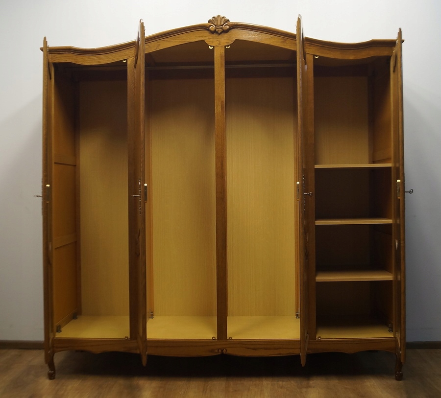 Шафа чотиридверна. Предмет меблів прикрашений декоративними панелями і спирається на красиві ніжки кабріола. Арочна гора, увінчана різьбленою раковиною.