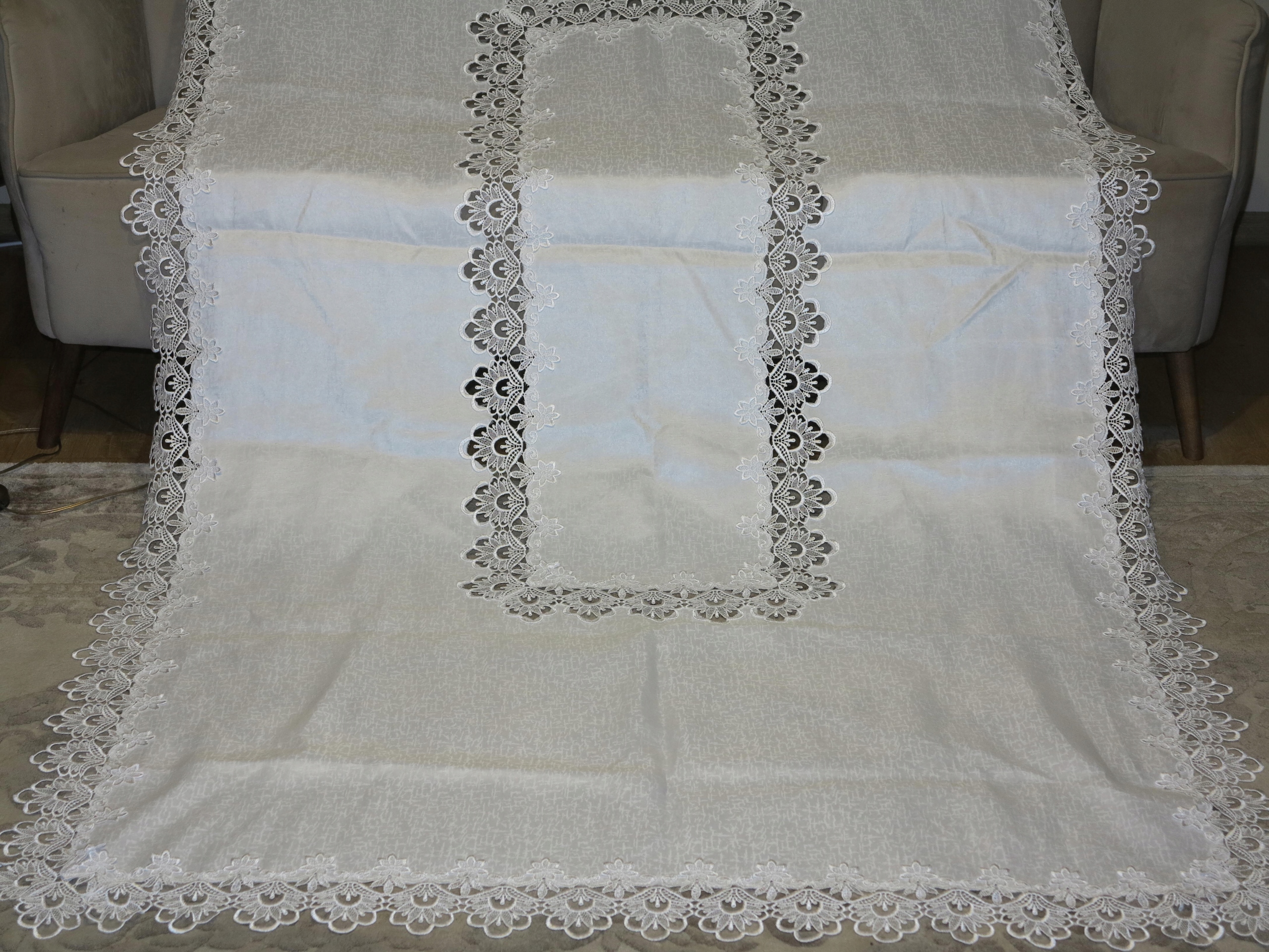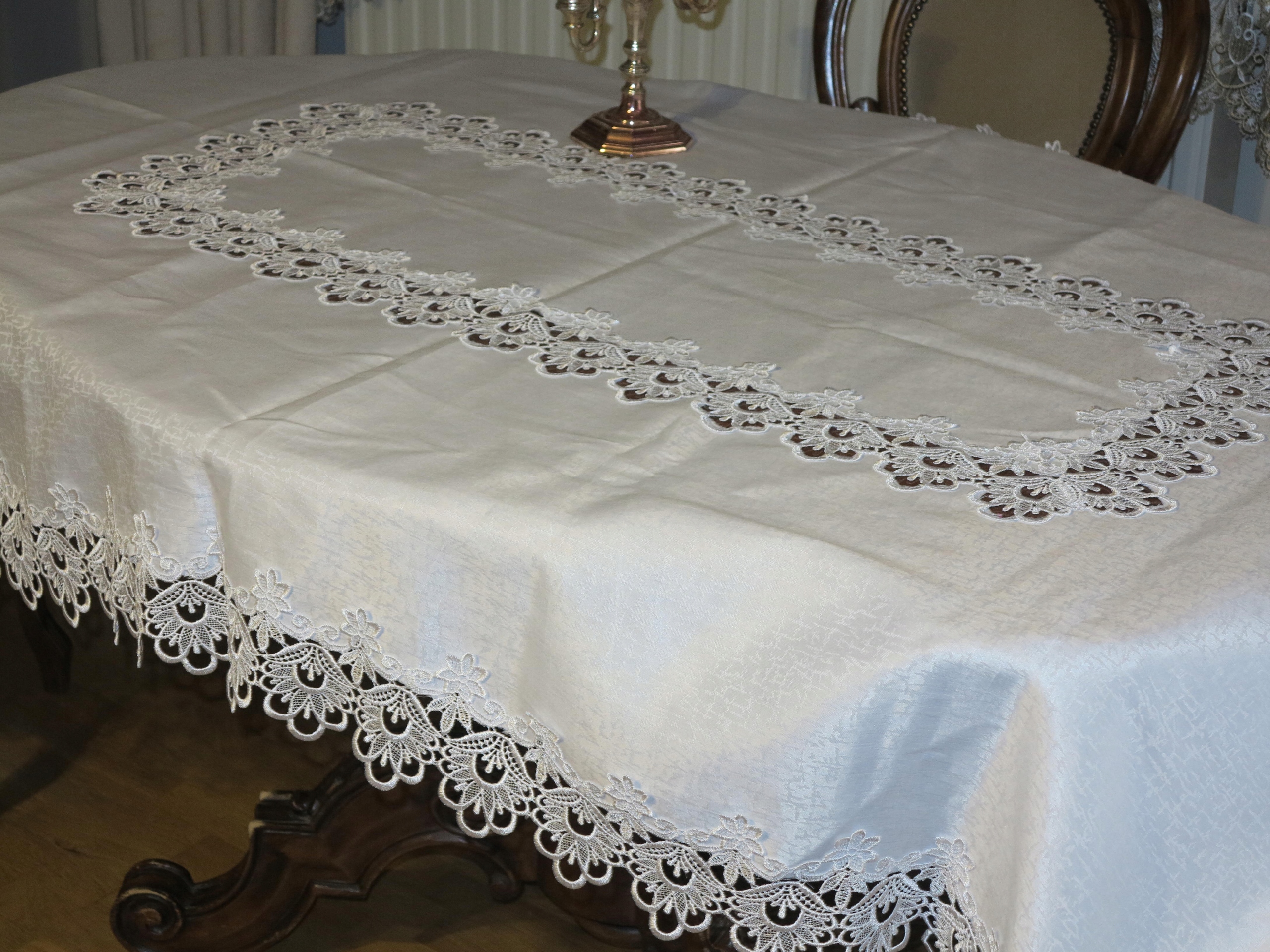 красива, білосніжня дуже велика скатертина, прикрашена декоративною гіпурсом