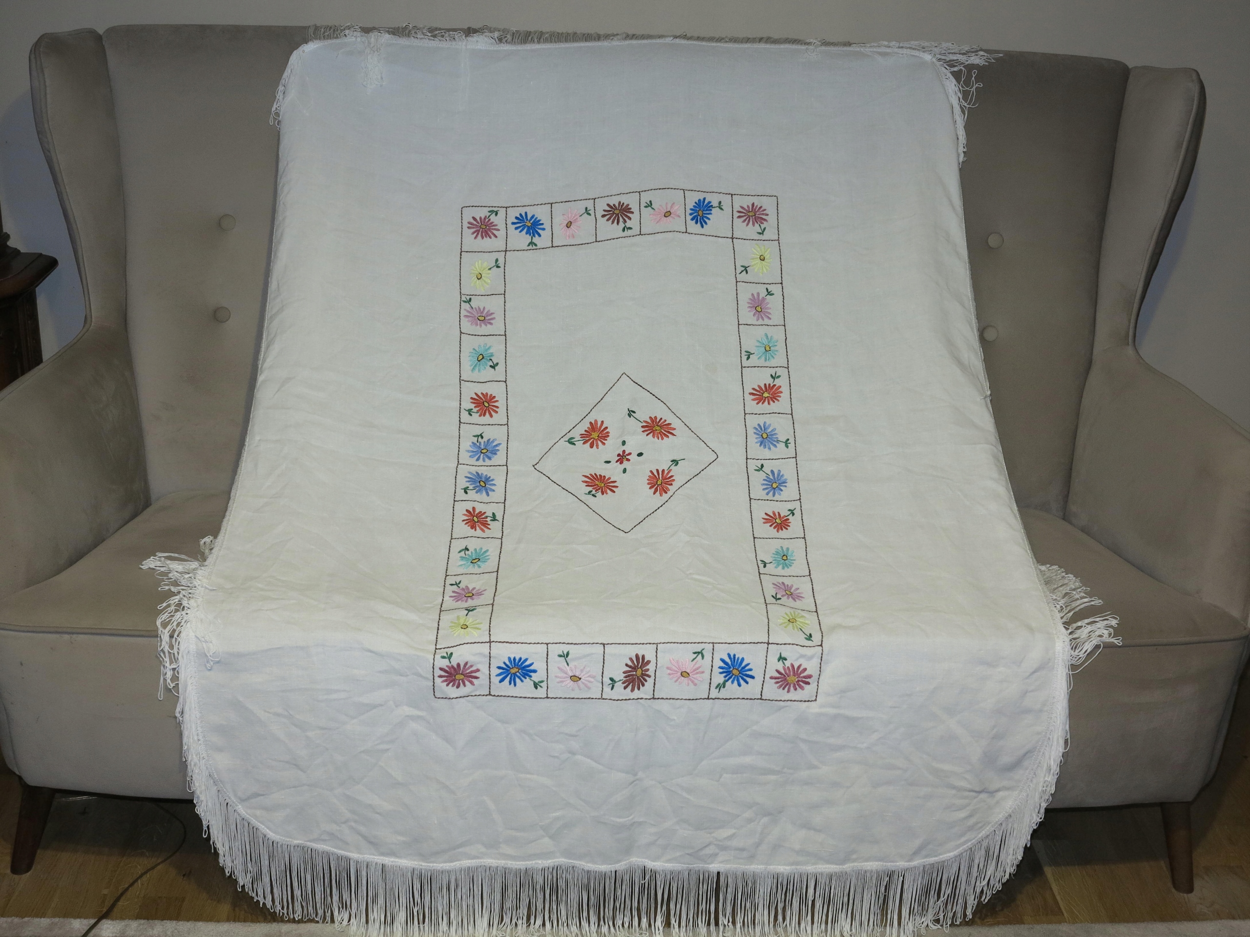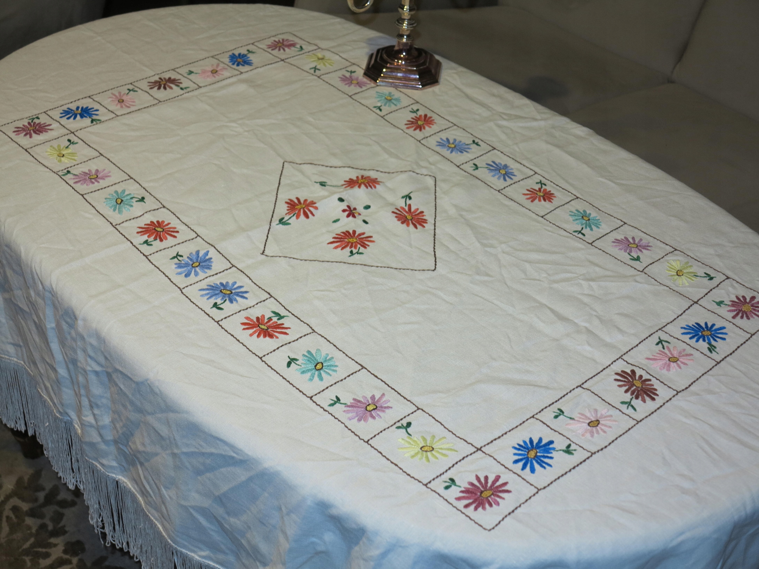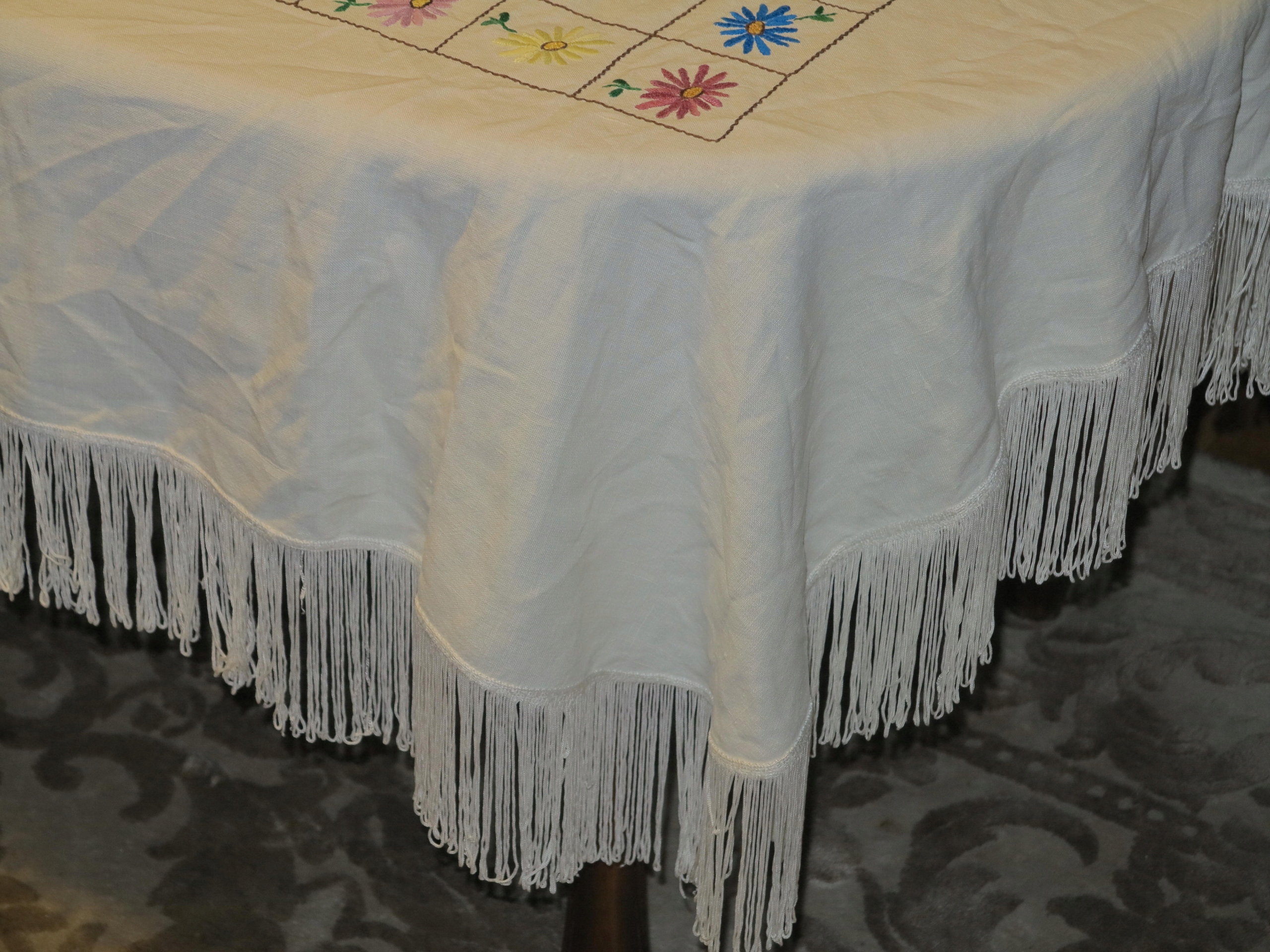 Прекрасна вікова лляна скатертина рука вишивка довгі бахроми, що виливають 141/108+12