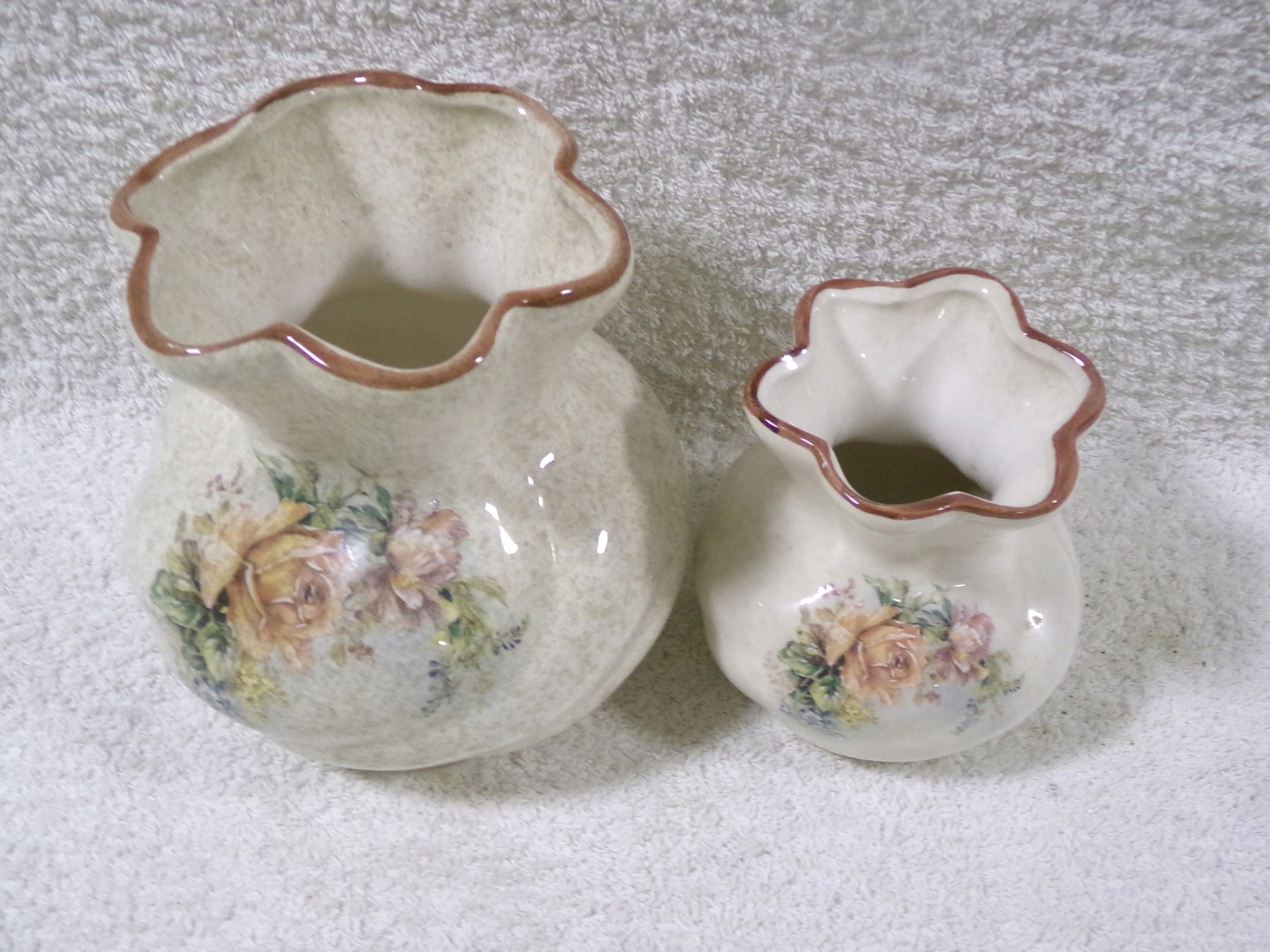 Керамічні вази з висотою 14 і 10 см, діаметром центру 10,5 та 7,5 см, вагою 0,74 кг. Дуже хороший стан збережений, без пошкоджень.