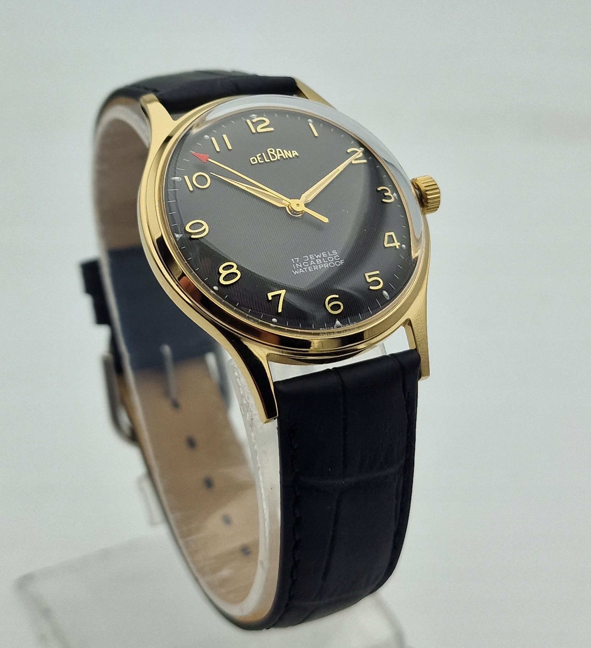 - золотий металевий диск з прекрасними гільськими та золотими арабськими номерами. Оригінальний щит, підписаний: " delbana, 17 коштовностей, інфлолок, водонепроникний, швейцарський зроблений ". Щит у ідеальному стані, показаний на знімках.
