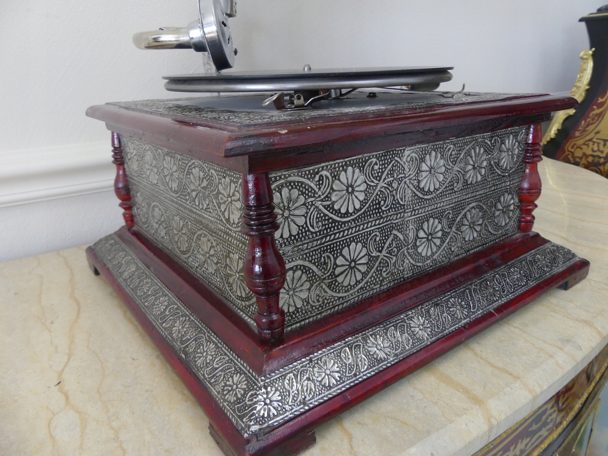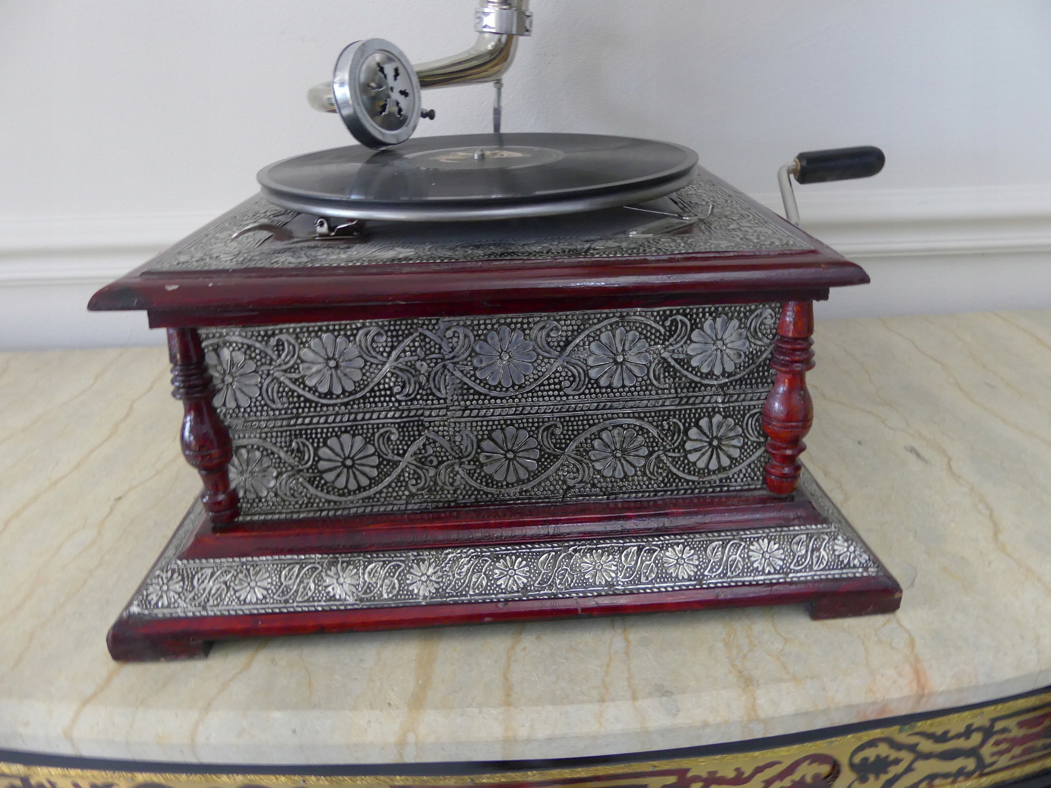 - Гарно оформлений патефон – поєднання срібної трубки з дерев’яною квадратною основою