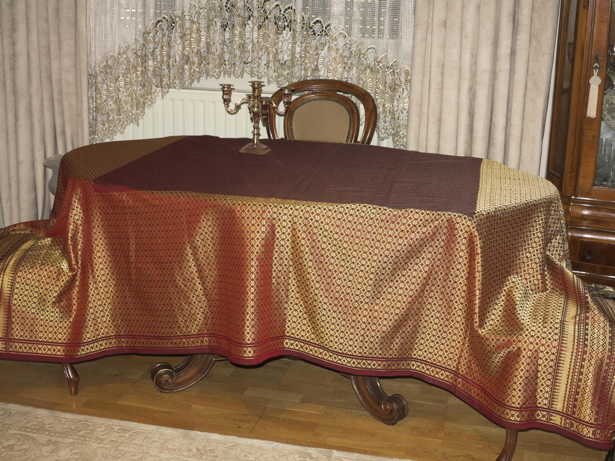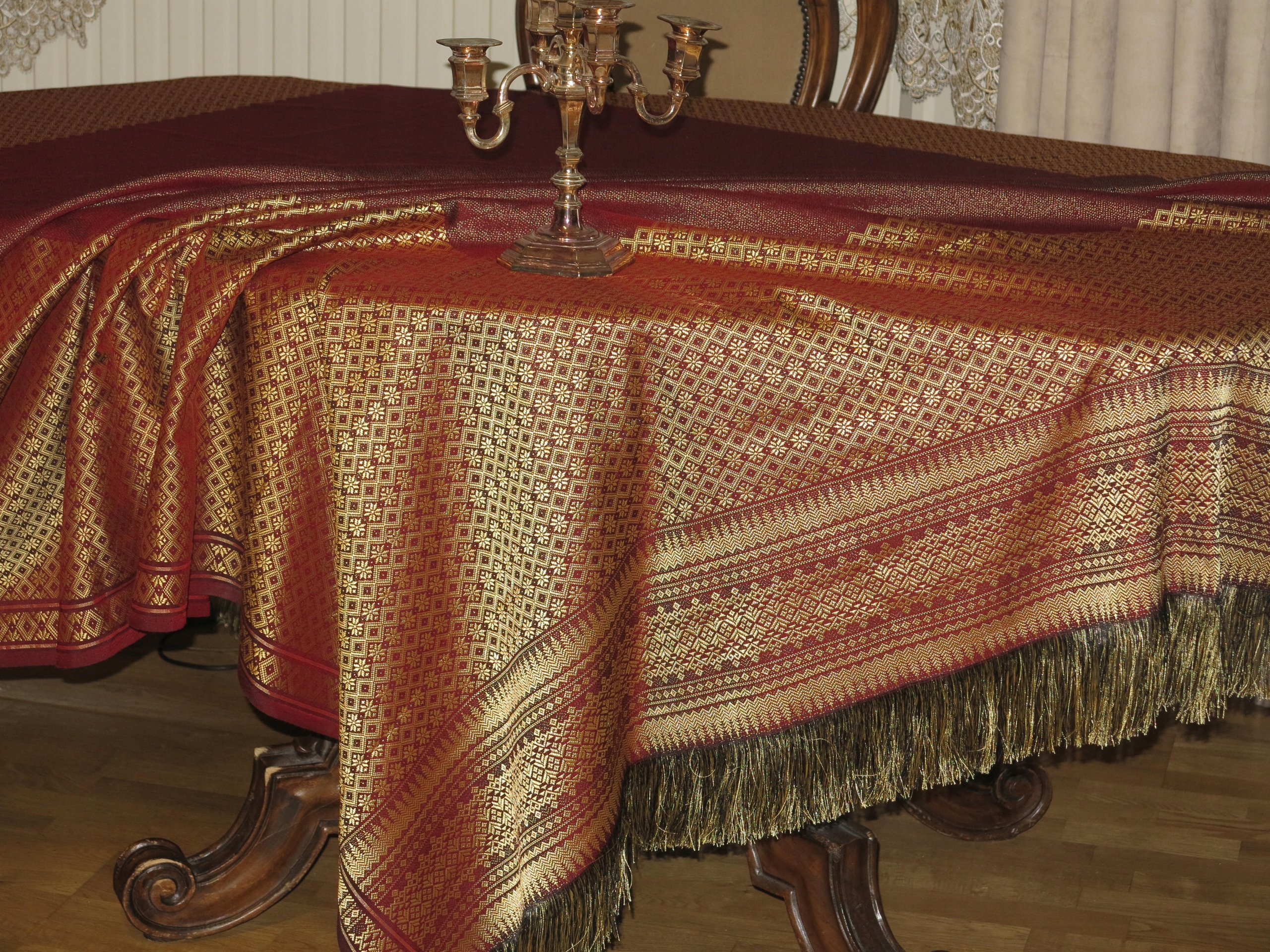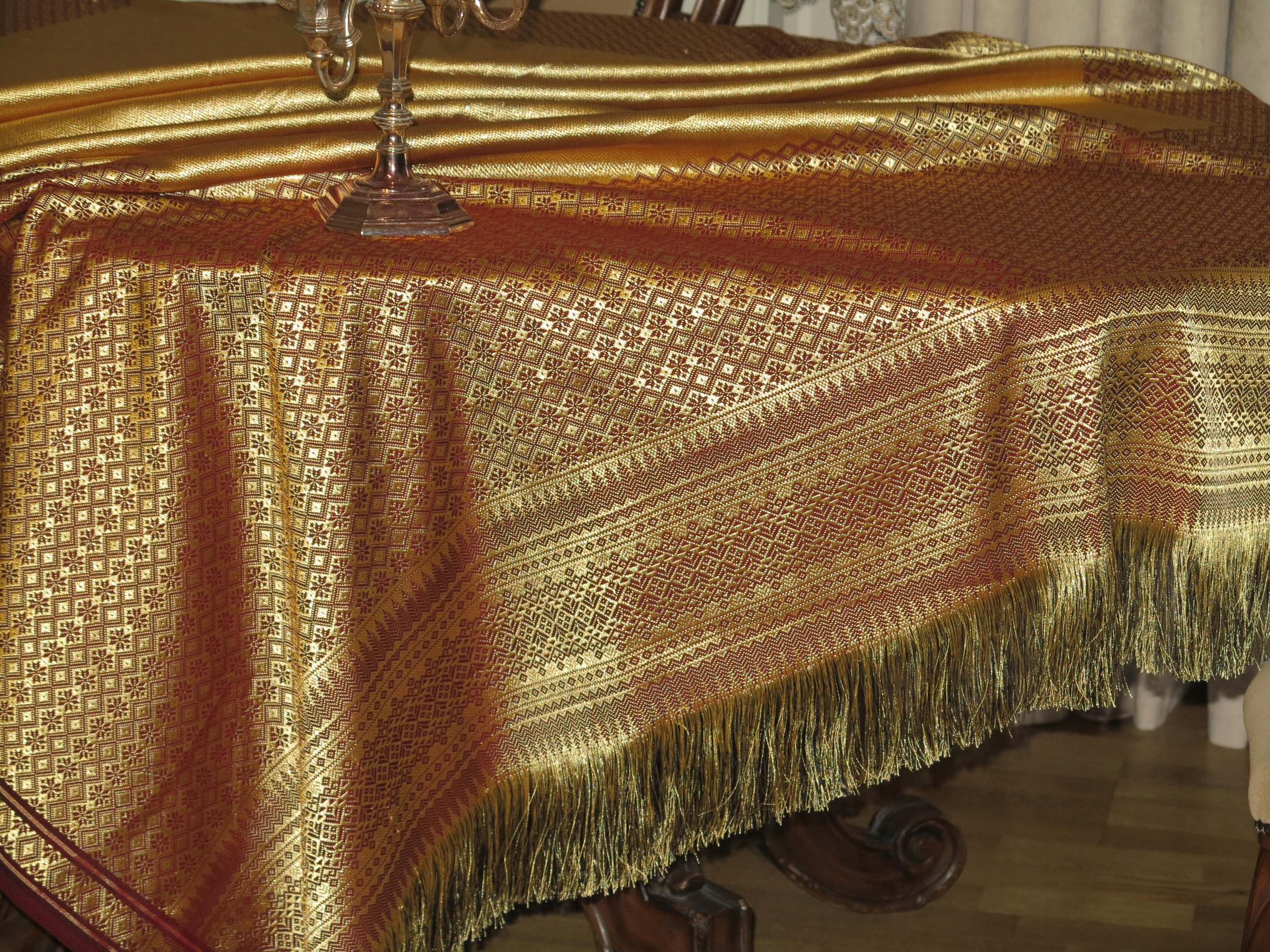 Прекрасні двосторонні стильні величезні скатертини-синтетичні шовкові нитки, в кольорах борда та старого золота. На двох кінцях щільних бахрома