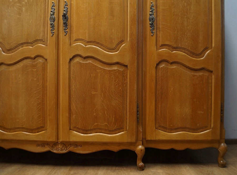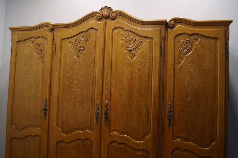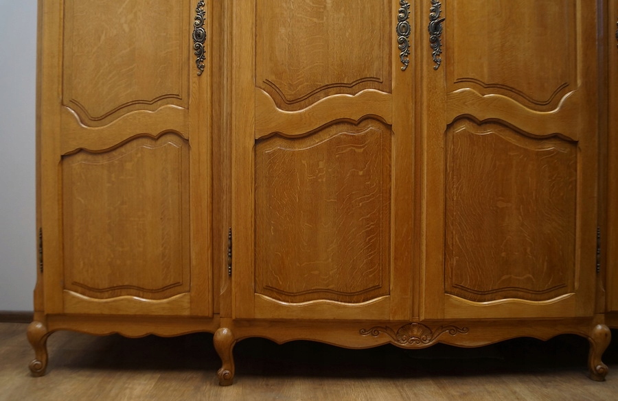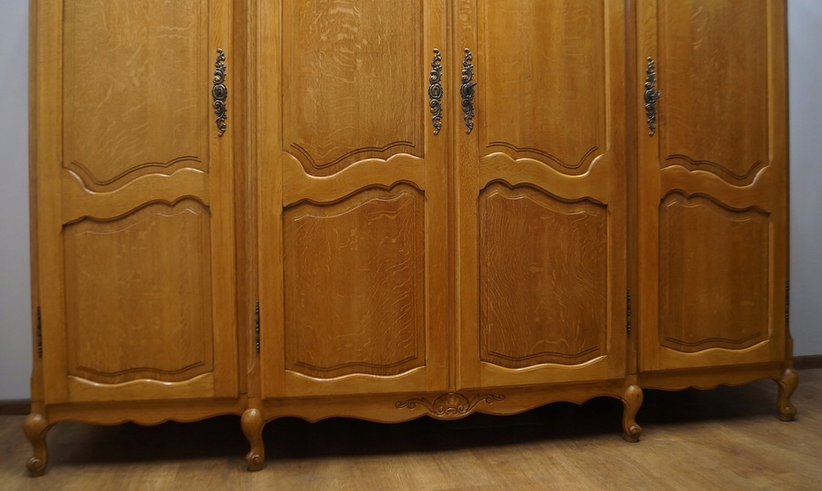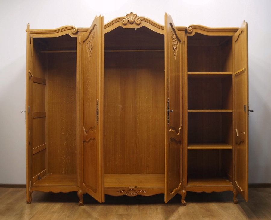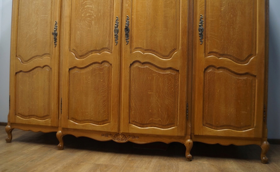 У гардеробу є чотири двері. Меблі, прикрашені декоративними панелями та чудовою різьбою, спирається на красиві кабріолетні ноги. Верхній верх верху з різьбленою оболонкою.