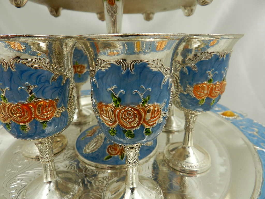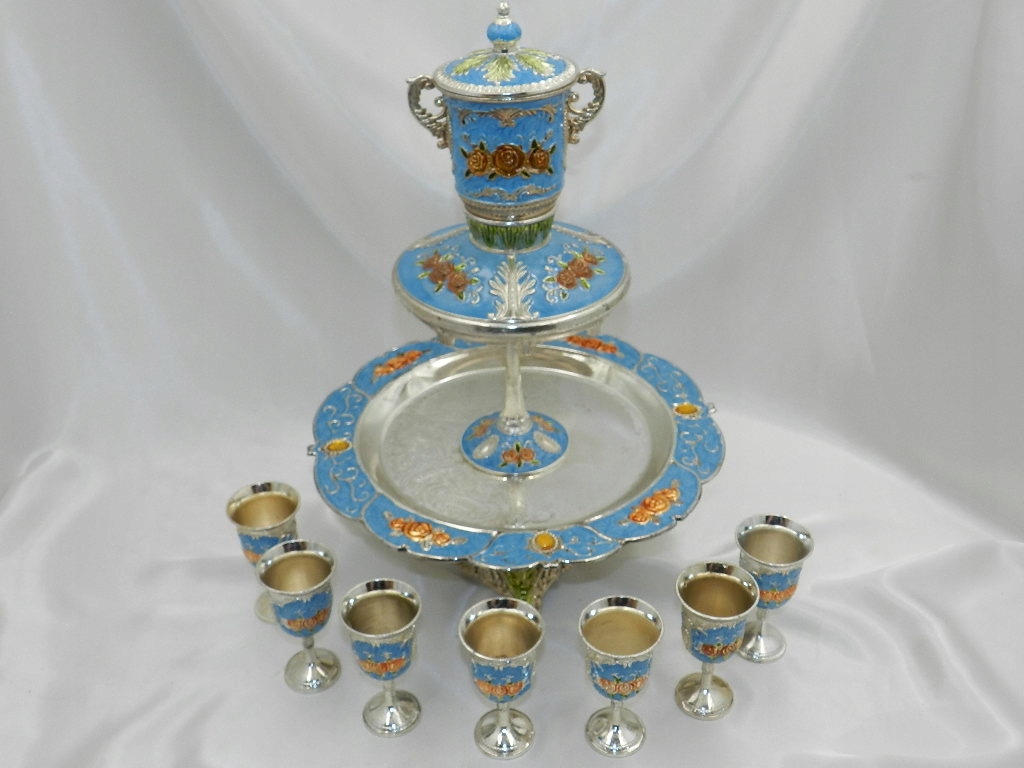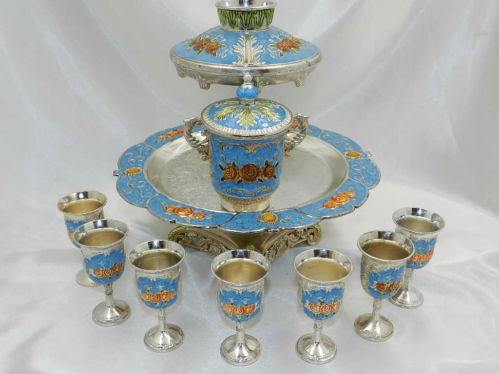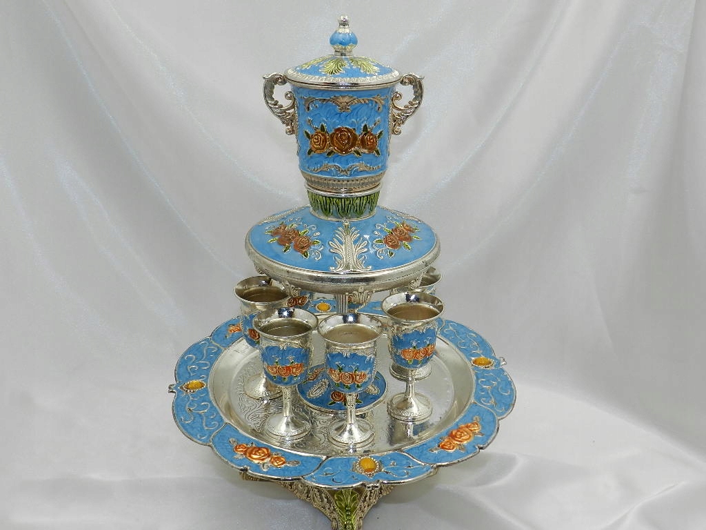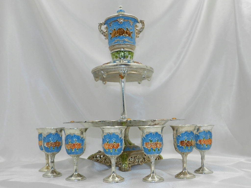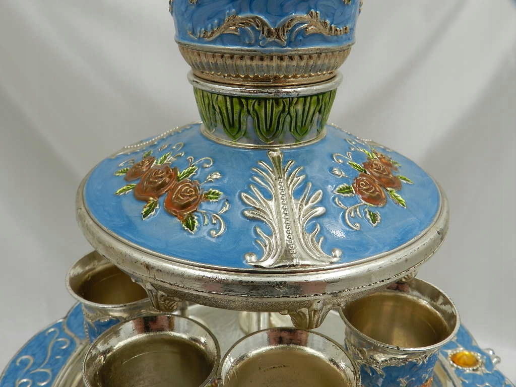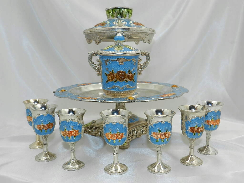 Ласкаво просимо. Смуги, зроблені з увагою до найменших деталей та деталей. 4 предмет та ефект, що виникає під час використання. А саме, з чашкою з кришкою, розміщеною у верхній частині фонтану, бажане зілля виливається в основу, яка, використовуючи крани, розміщені над окулярами, рівномірно розливає до них вибране зілля :) надзвичайно красивий і унікальний ефект :) ідеально підходить як декоративний елемент.