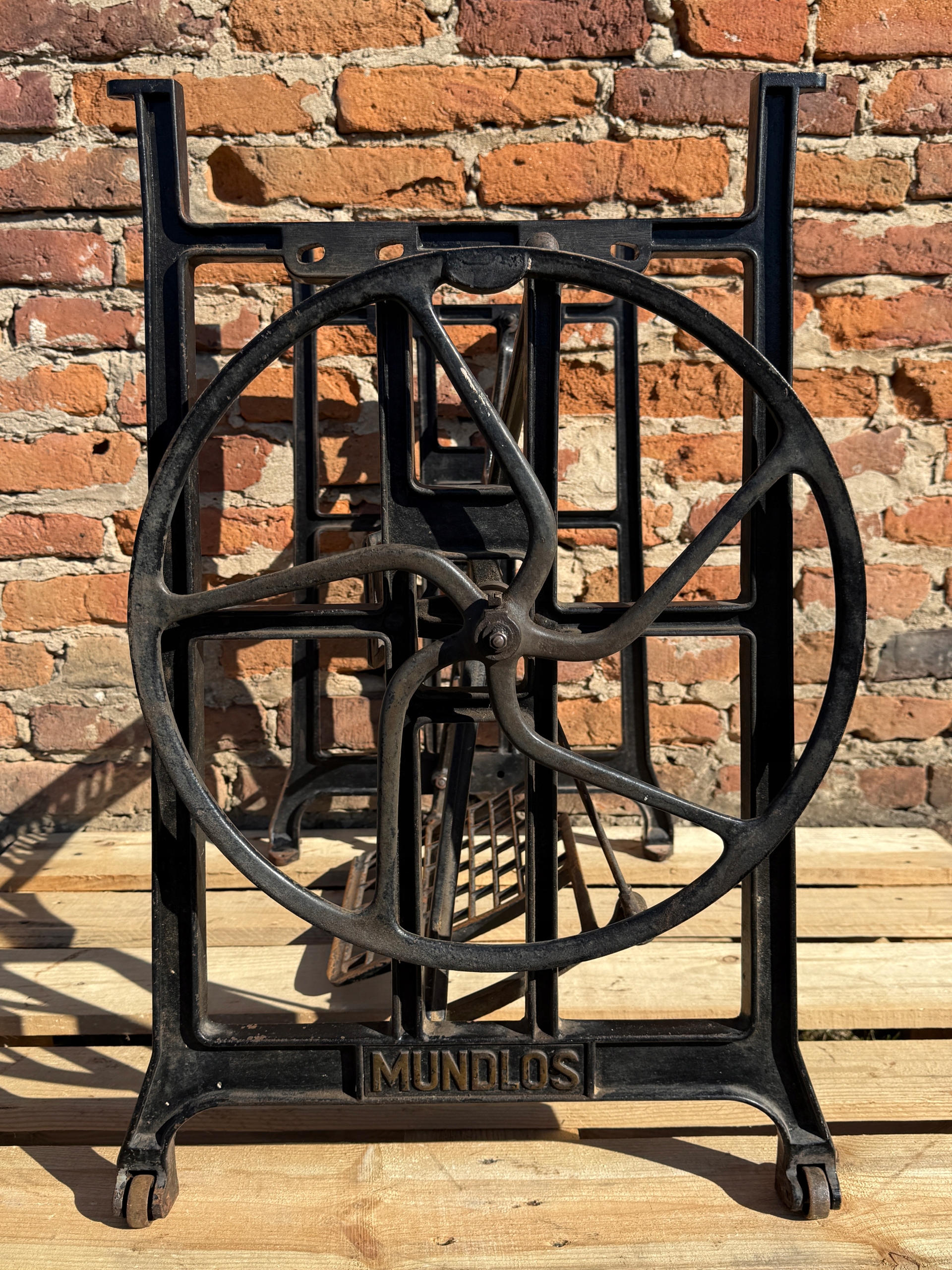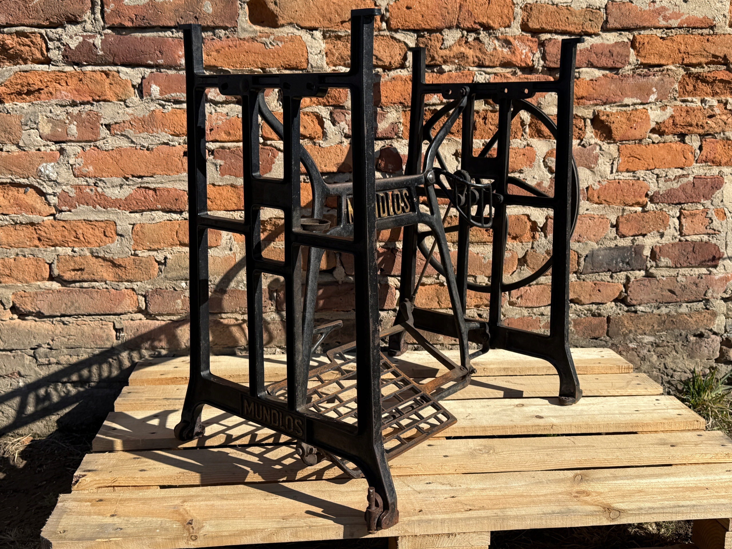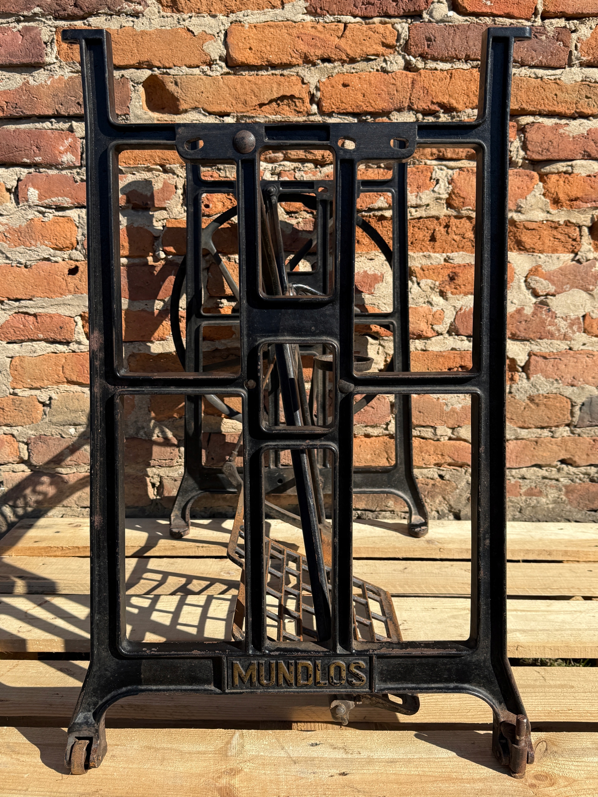Тема продажу - це стара чавунна основа з швейної машини Mundlos. Дуже приємний малюнок - густий, масивний чавун. У ньому є всі колеса в нижній частині. Одна з ніг з можливістю вирівнювання. Додатковою перевагою є металевий елемент, що з'єднує колесо з педалі приводу, завдяки якому ми впевнені, що його не їдять дерев’яними, що можливо в основі з дерев’яним елементом. Після створення стільниці він може виконувати функцію як, наприклад, таблиці таблиці. ( Gł.)