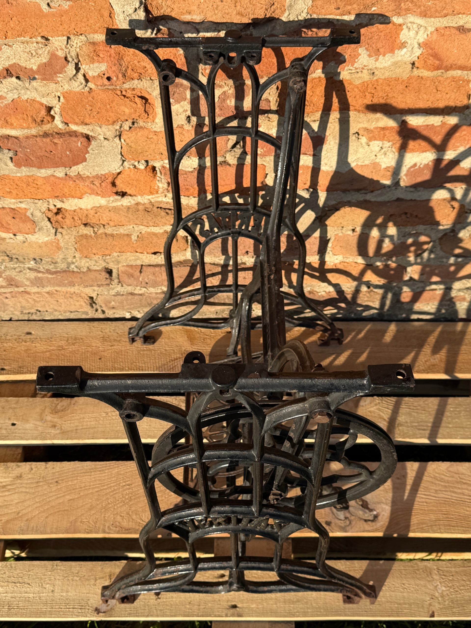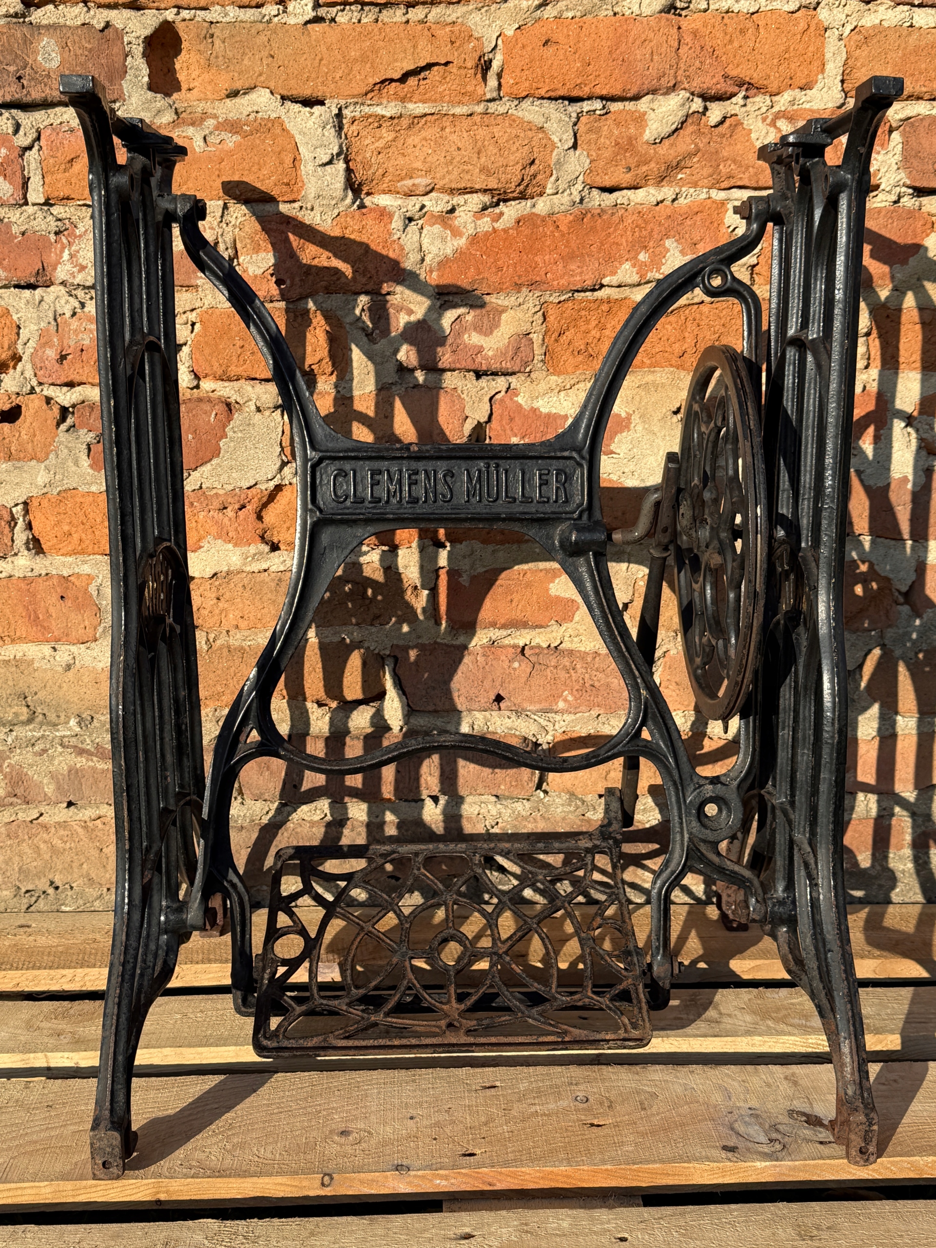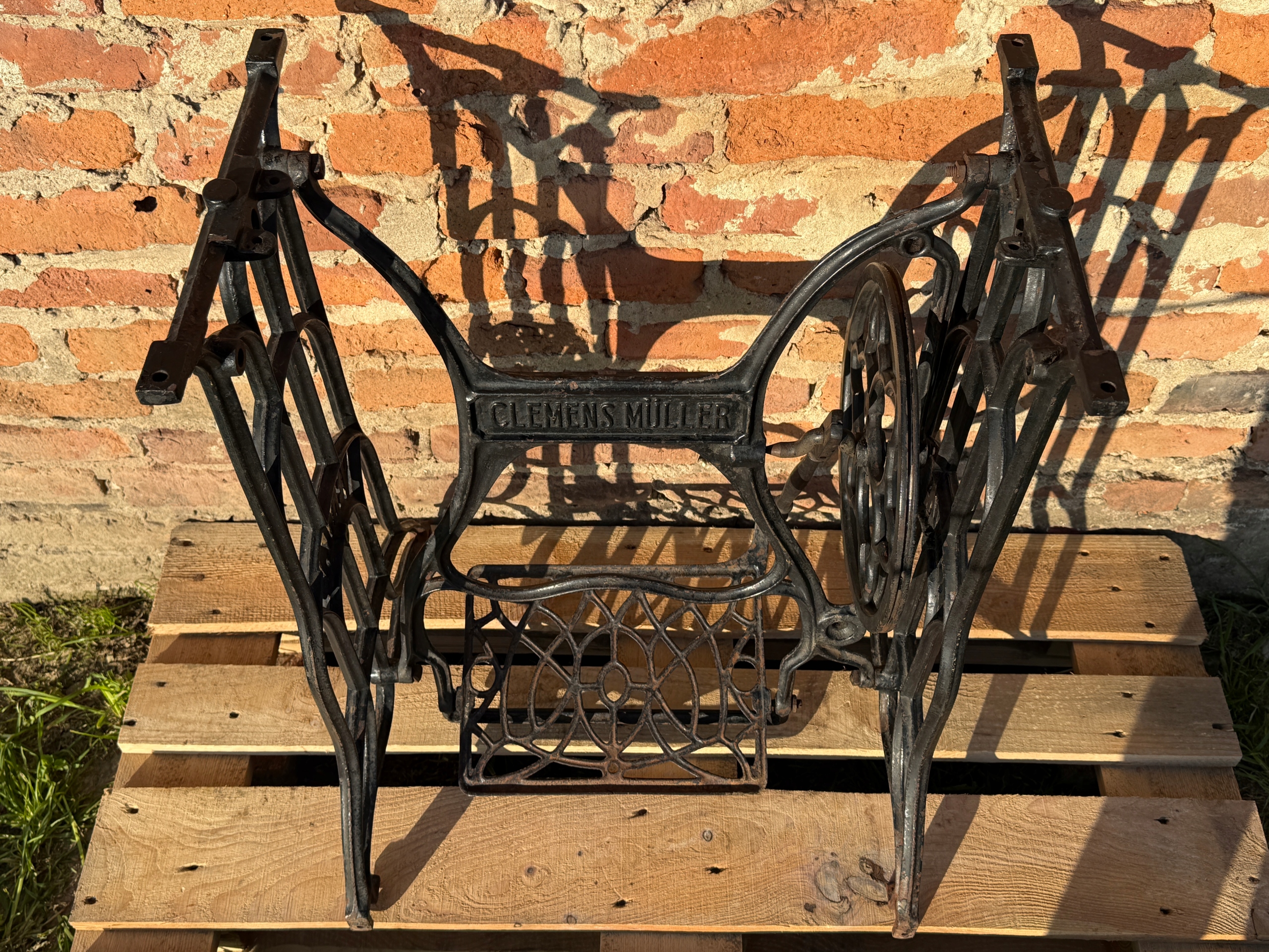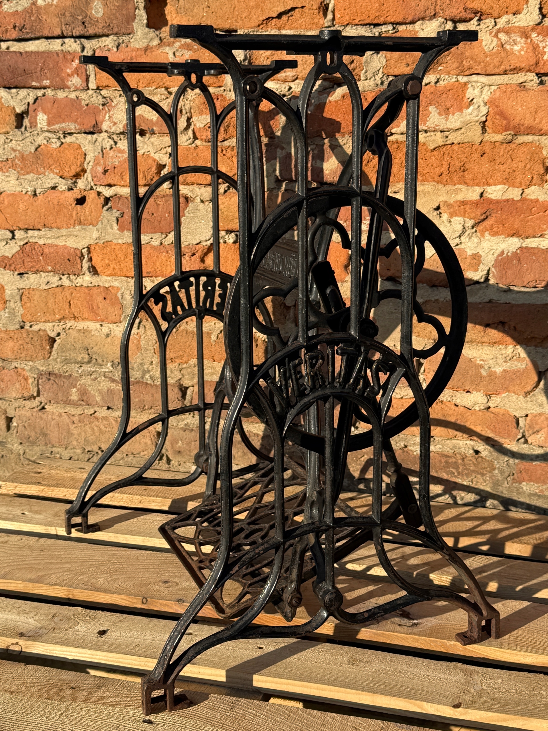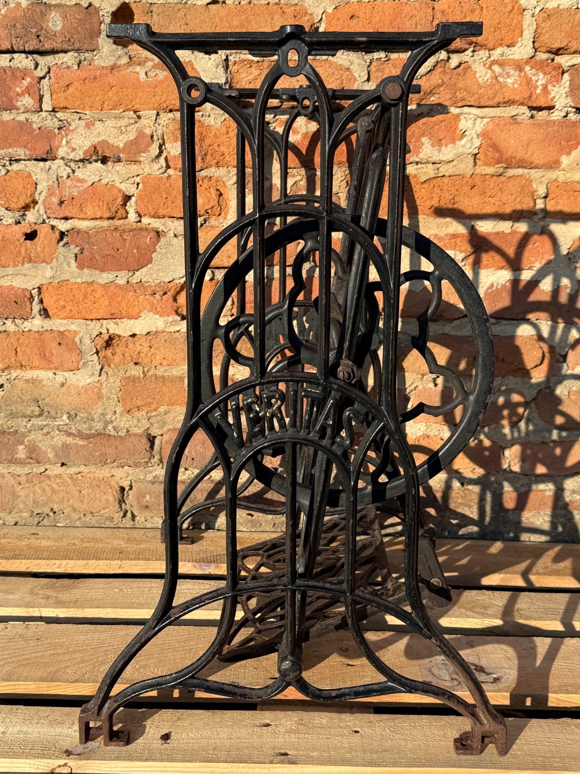 Тема продажу - це стара чавунна основа з швейної машини Veritas - Clemens Muller. Дуже приємний малюнок - рідше. Колеса, розташовані в нижній частині, були зняті так, що таблиця буде більш стабільною, вона не рухається.