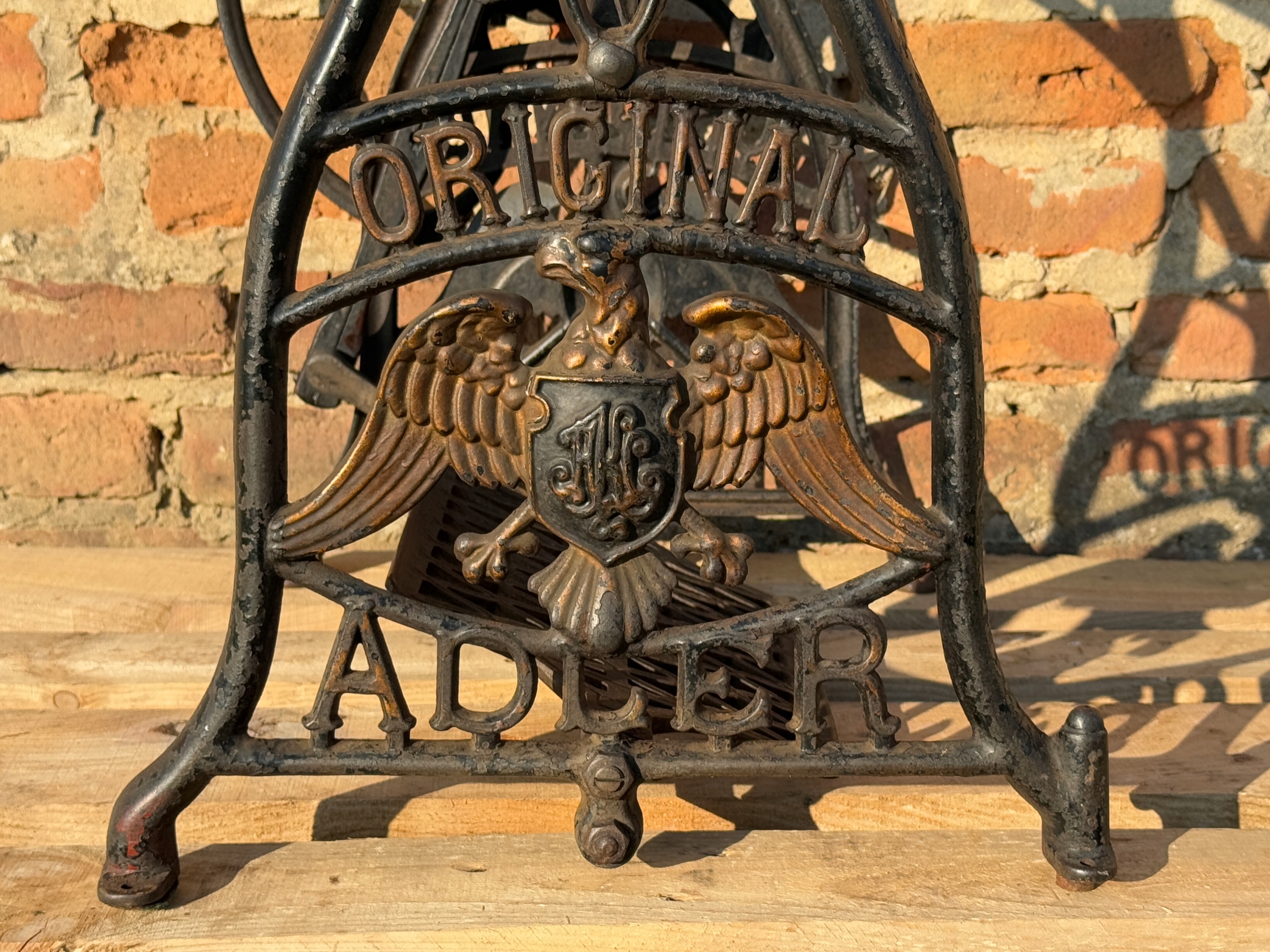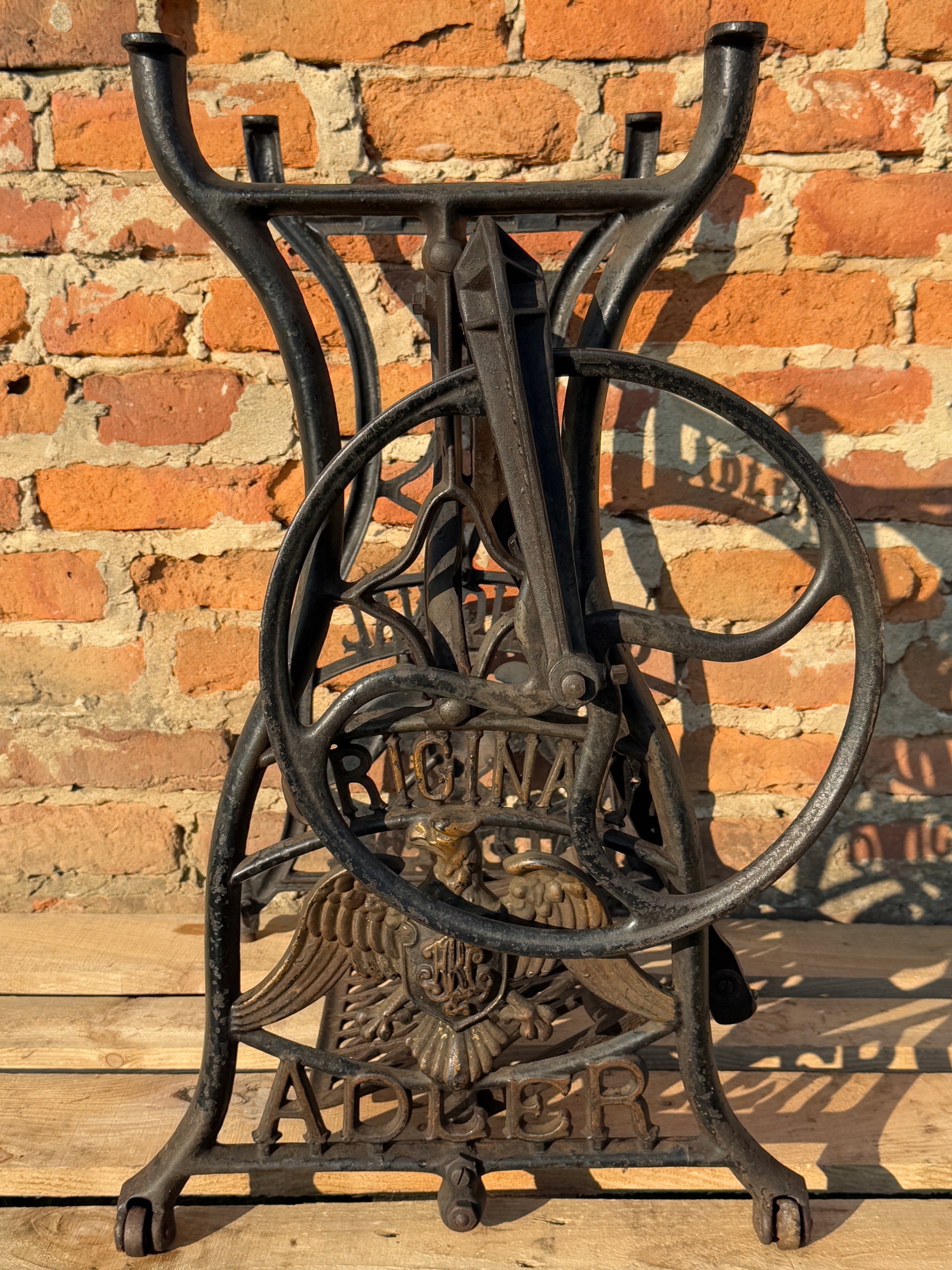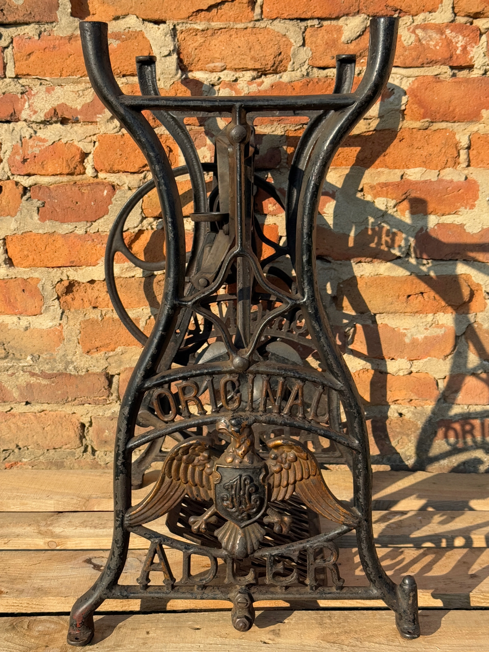 Тема продажу - це стара чавунна основа з оригінальної швейної машини Adler. Дуже приємний малюнок з прекрасними орлами, рідше поширеним через напис посередині та напис D.R.G.M. Написи з логотипом компанії з боків. У ньому є обидва колеса в нижній частині. Знайти основу в такій багатій прикрасі стає важче і важче.