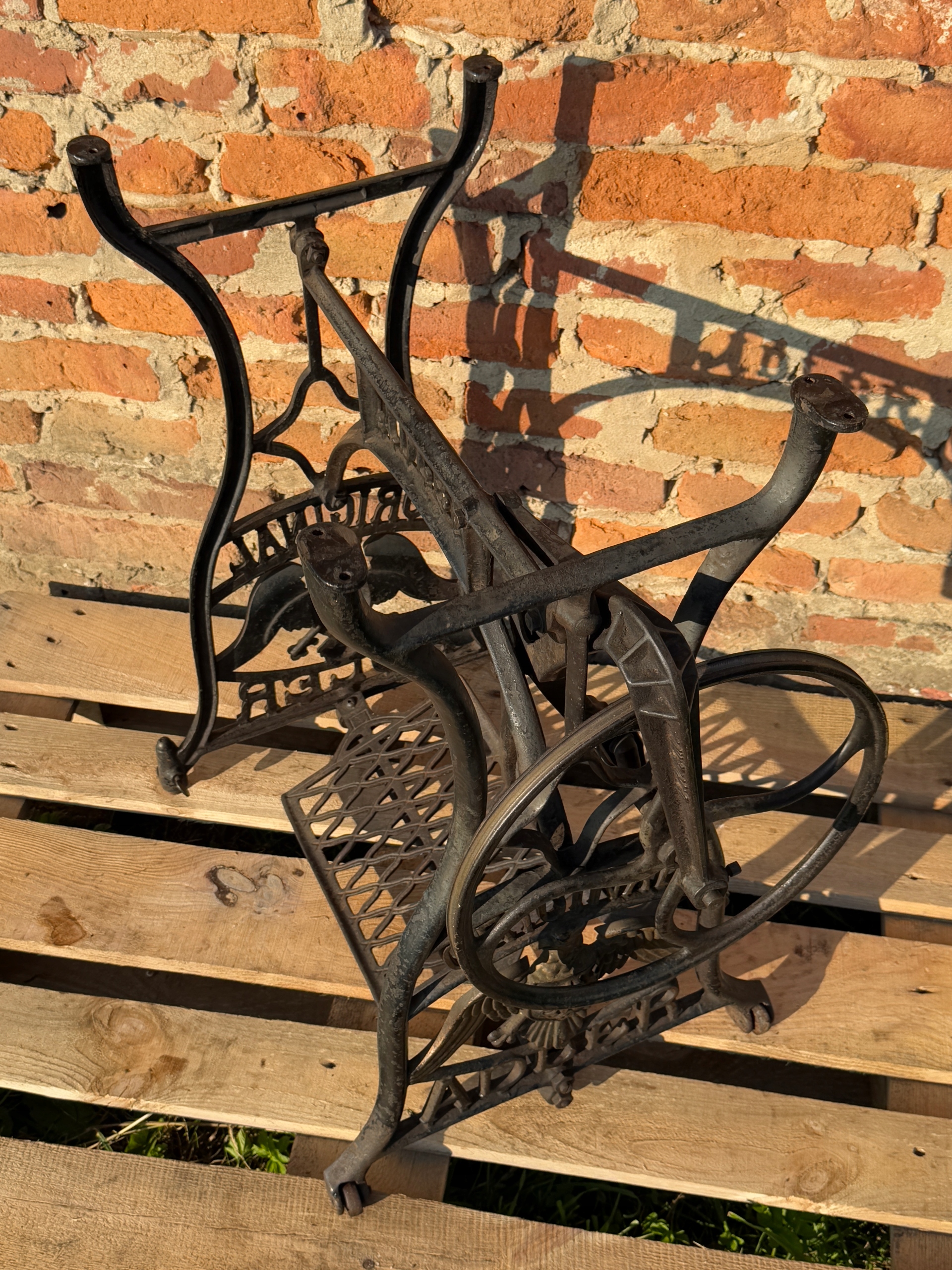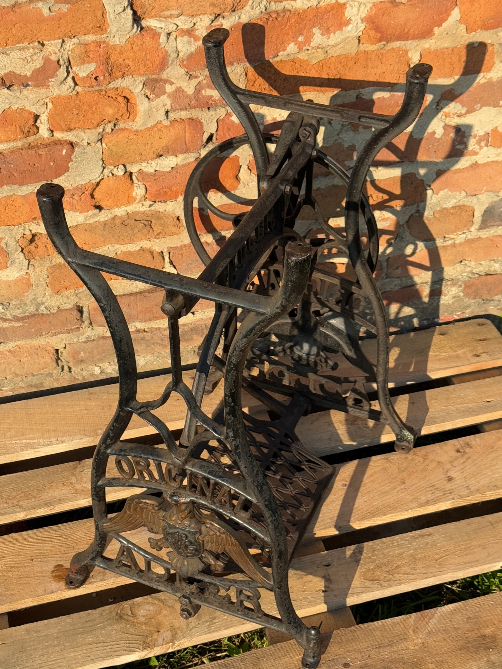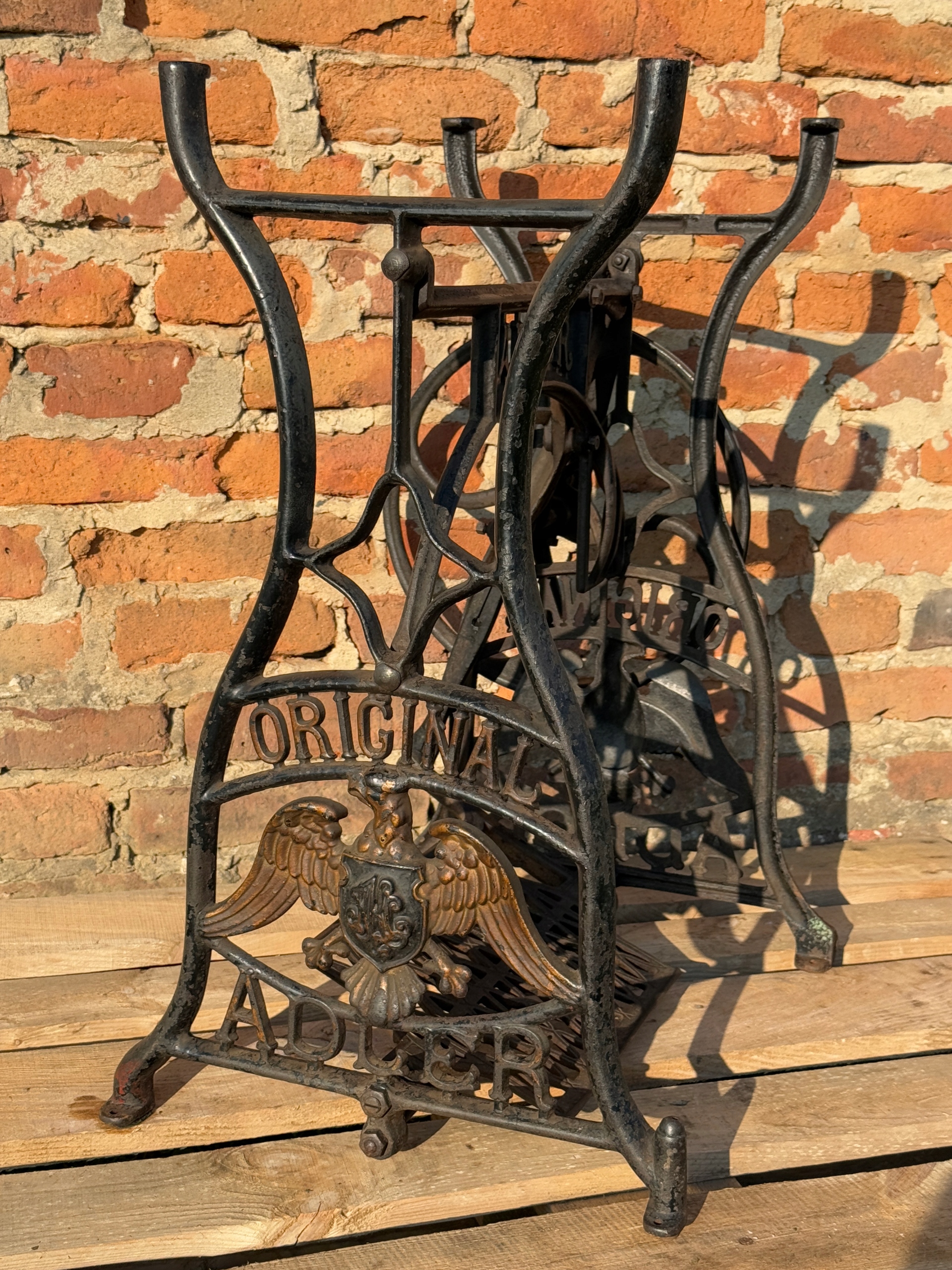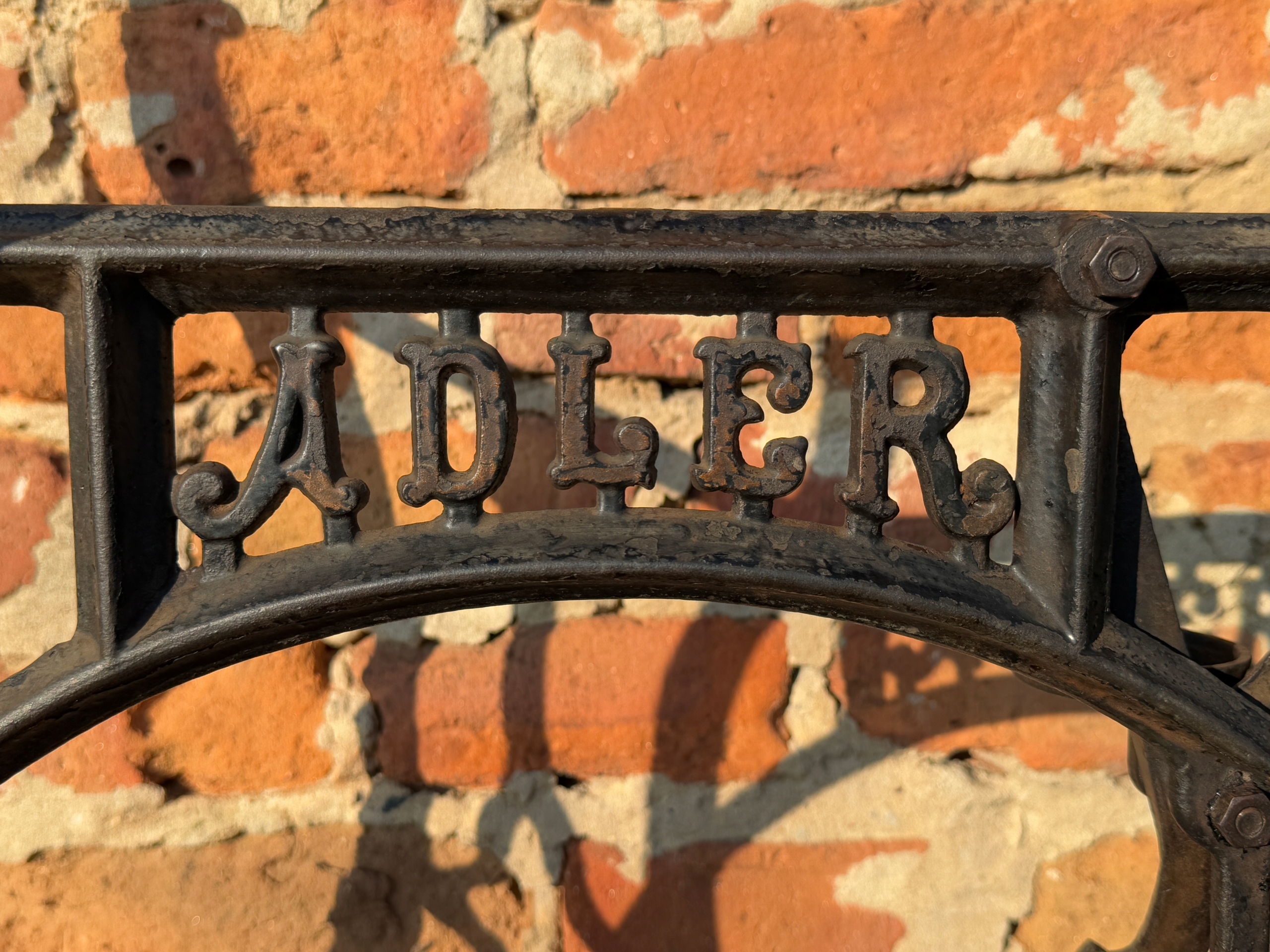 Тема продажу - це стара чавунна основа з оригінальної швейної машини Adler. Дуже приємний малюнок з прекрасними орлами, рідше поширеним через напис посередині та напис D.R.G.M. Написи з логотипом компанії з боків. У ньому є обидва колеса в нижній частині. Знайти основу в такій багатій прикрасі стає важче і важче.