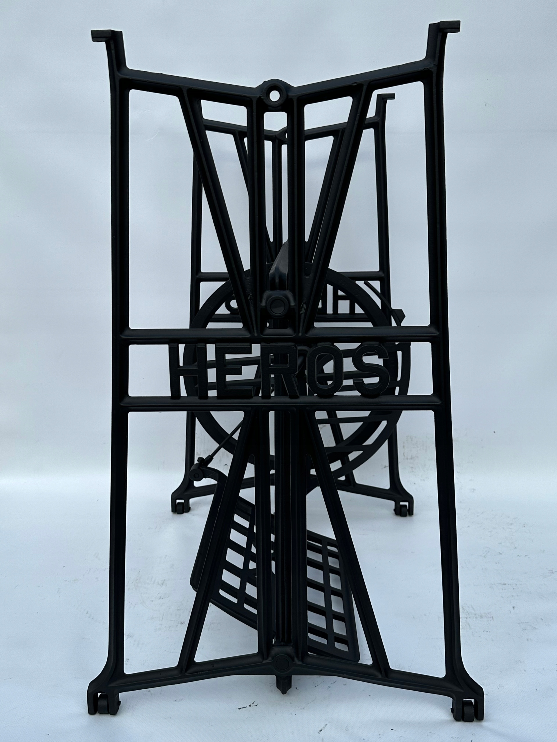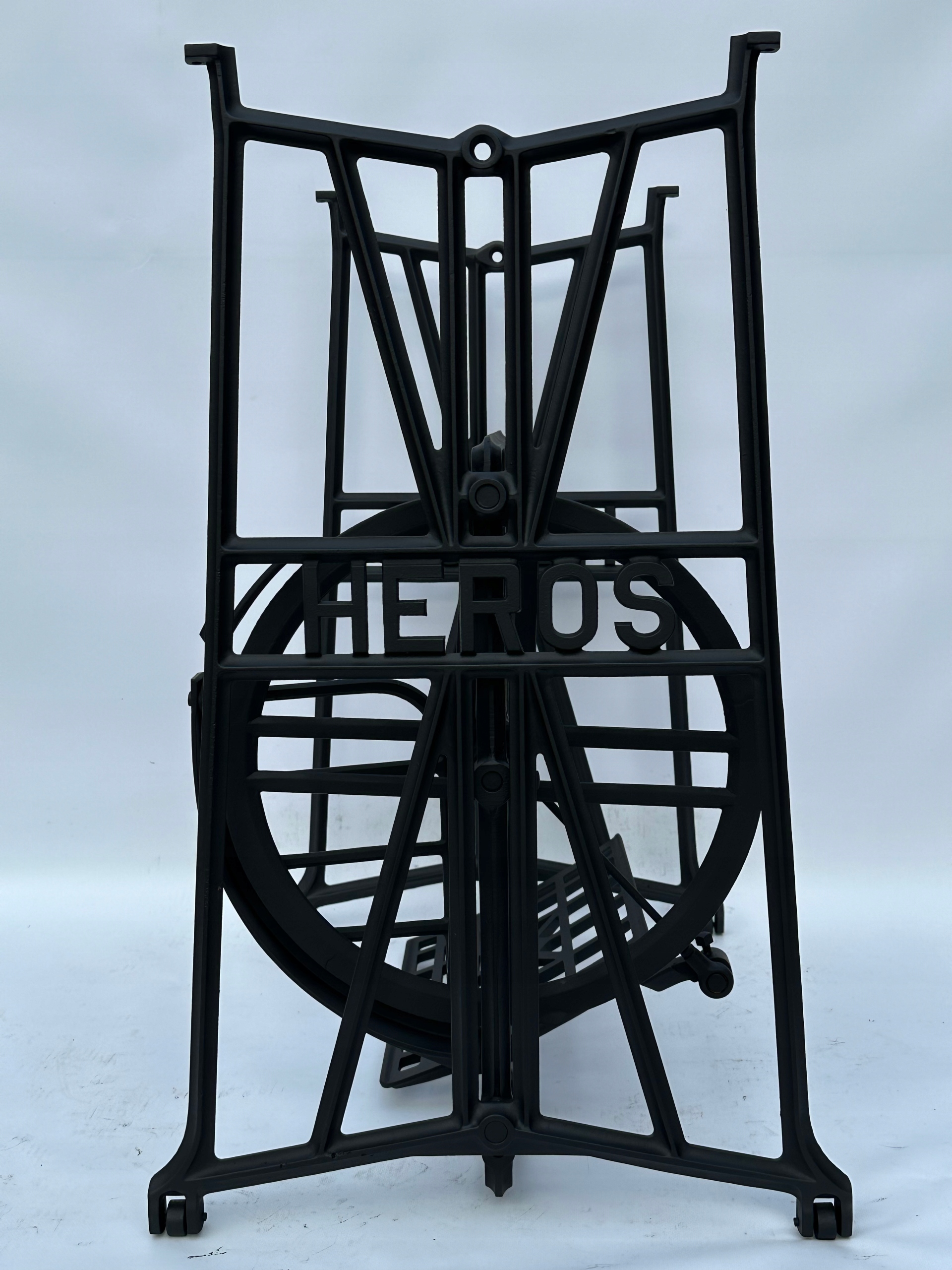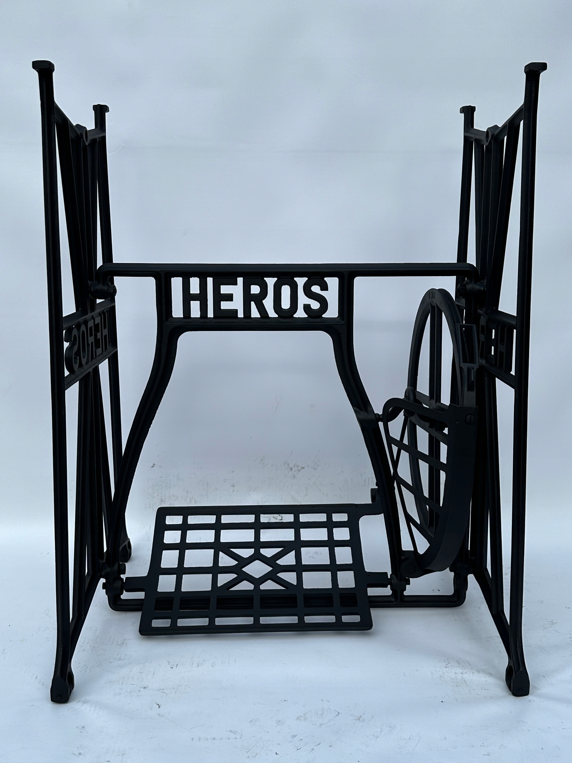 Тема продажу - це стара чавунна основа з швейної машини героя. Дуже приємний малюнок. З боків і в середній частині написи з логотипом компанії. У нього є всі 4 колеса внизу. Додатковою перевагою є металевий елемент, що з'єднує колесо з педалі приводу, завдяки якому ми впевнені, що його не їсть дерев’яними, що можливо в базах з дерев’яним елементом.