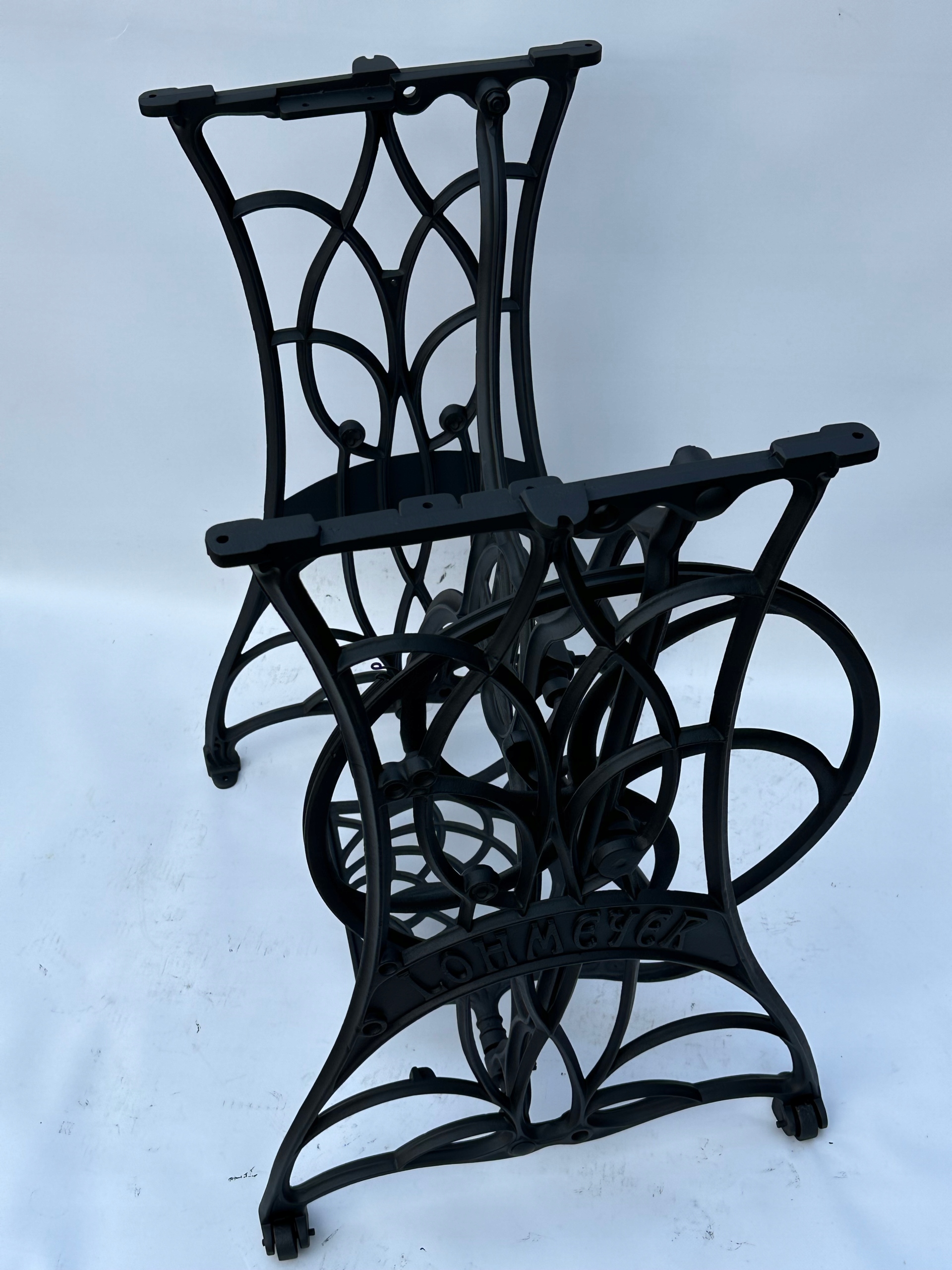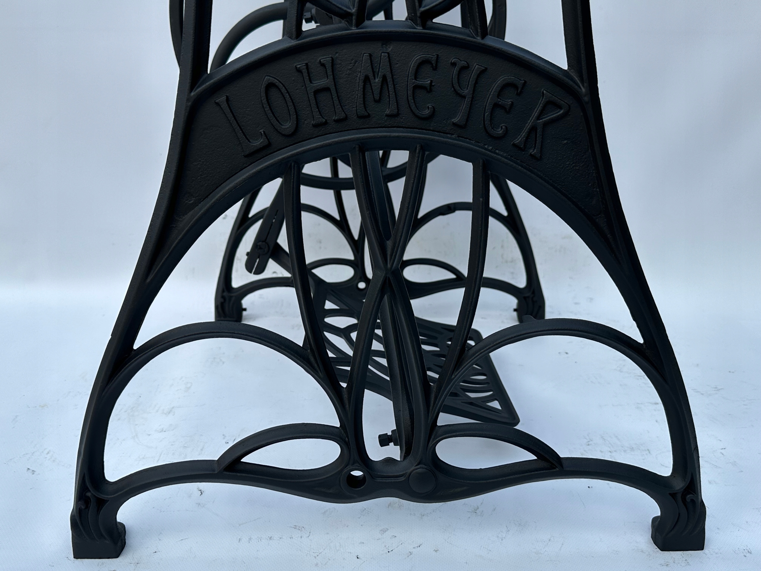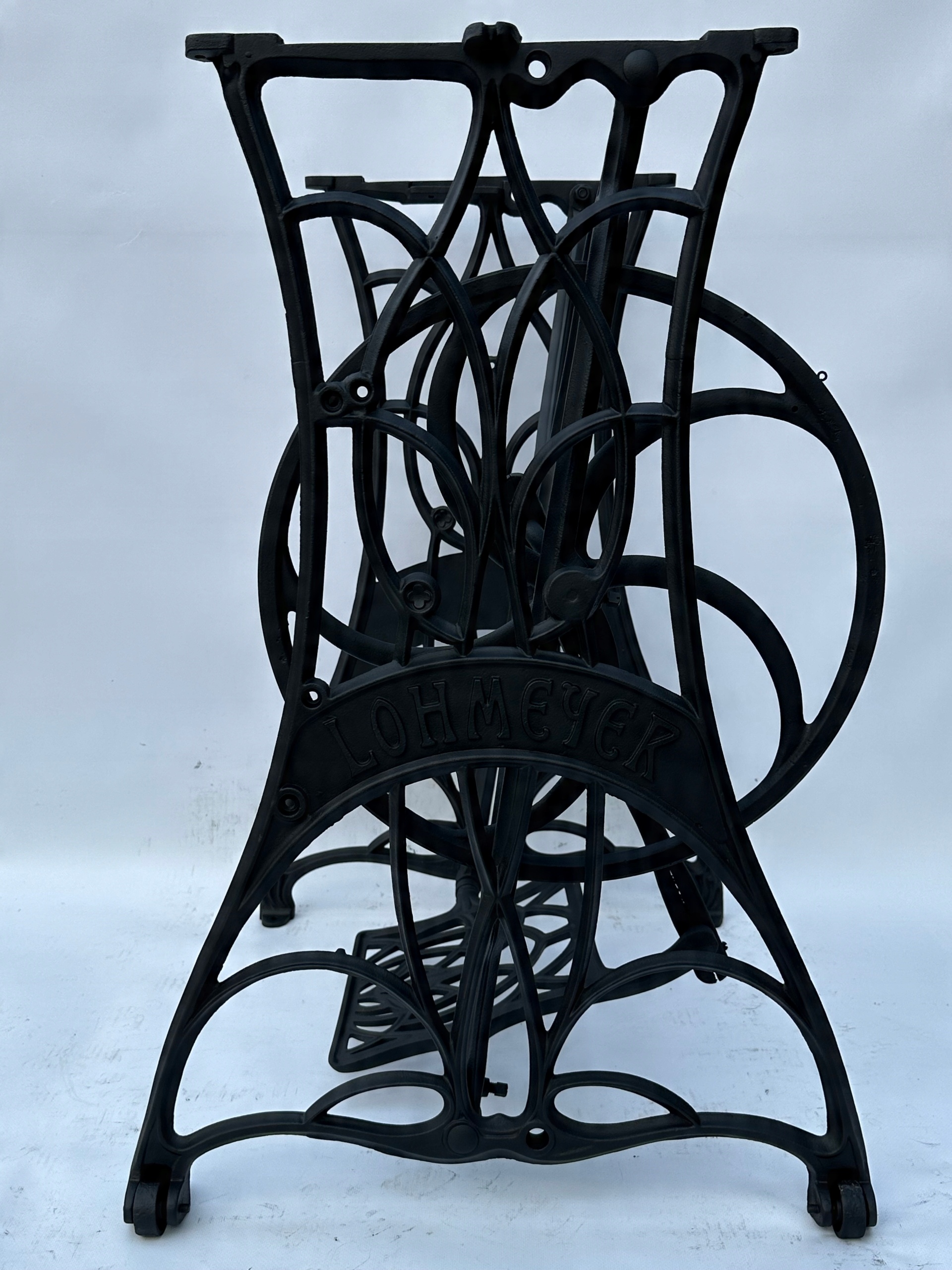 Тема продажу - це стара чавунна основа з швейної машини Lohmeyer. Написи з логотипом компанії з боків. Дуже приємний малюнок, рідше. У ньому є обидва колеса. x 35 см (розміри верхньої частини)