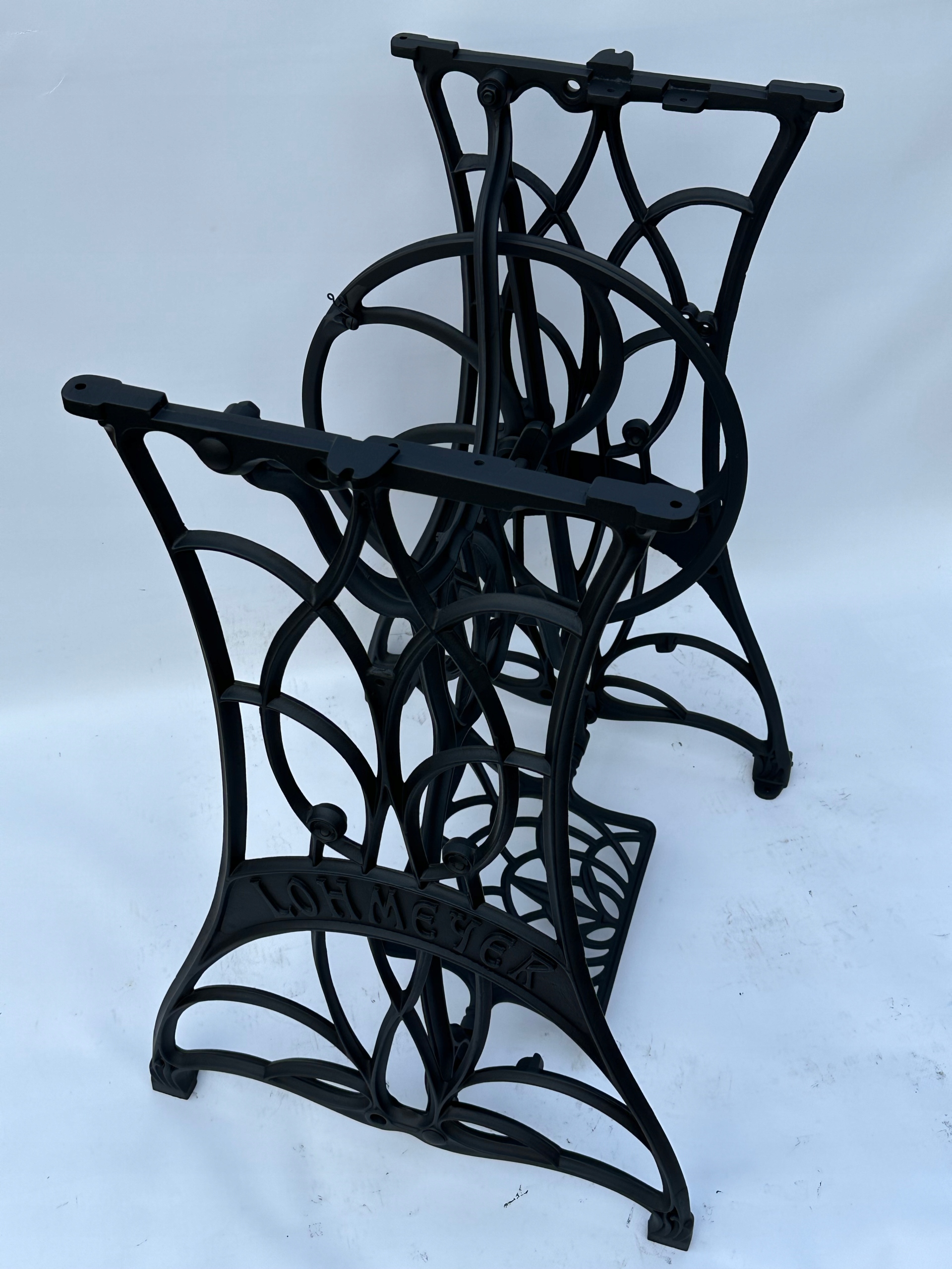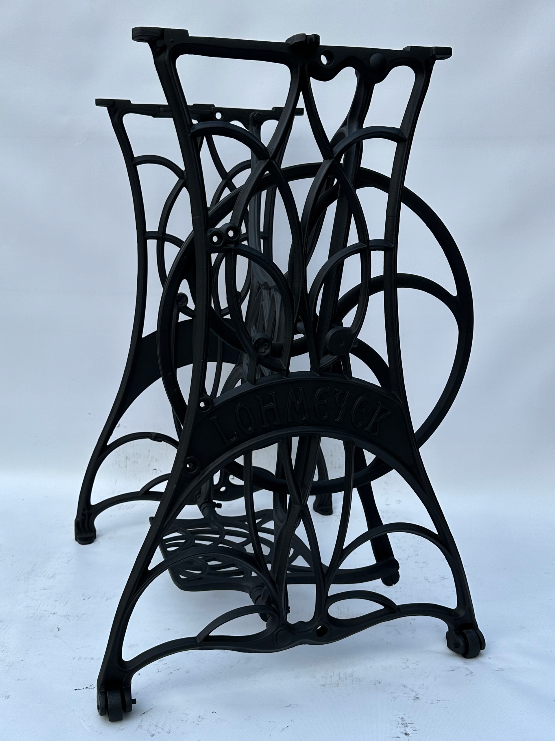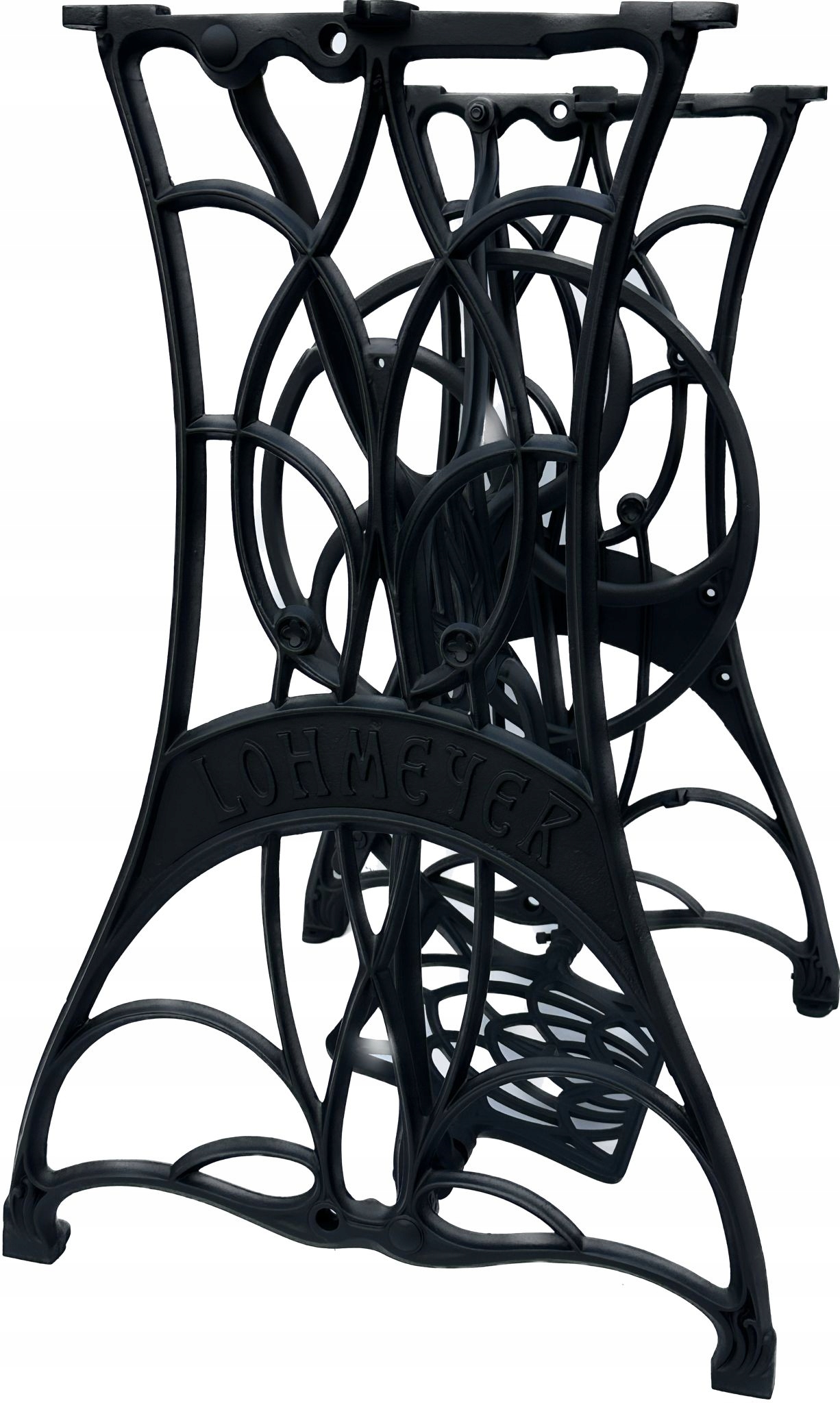 Тема продажу - це стара чавунна основа з швейної машини Lohmeyer. Написи з логотипом компанії з боків. Дуже приємний малюнок, рідше. У ньому є обидва колеса. x 35 см (розміри верхньої частини)