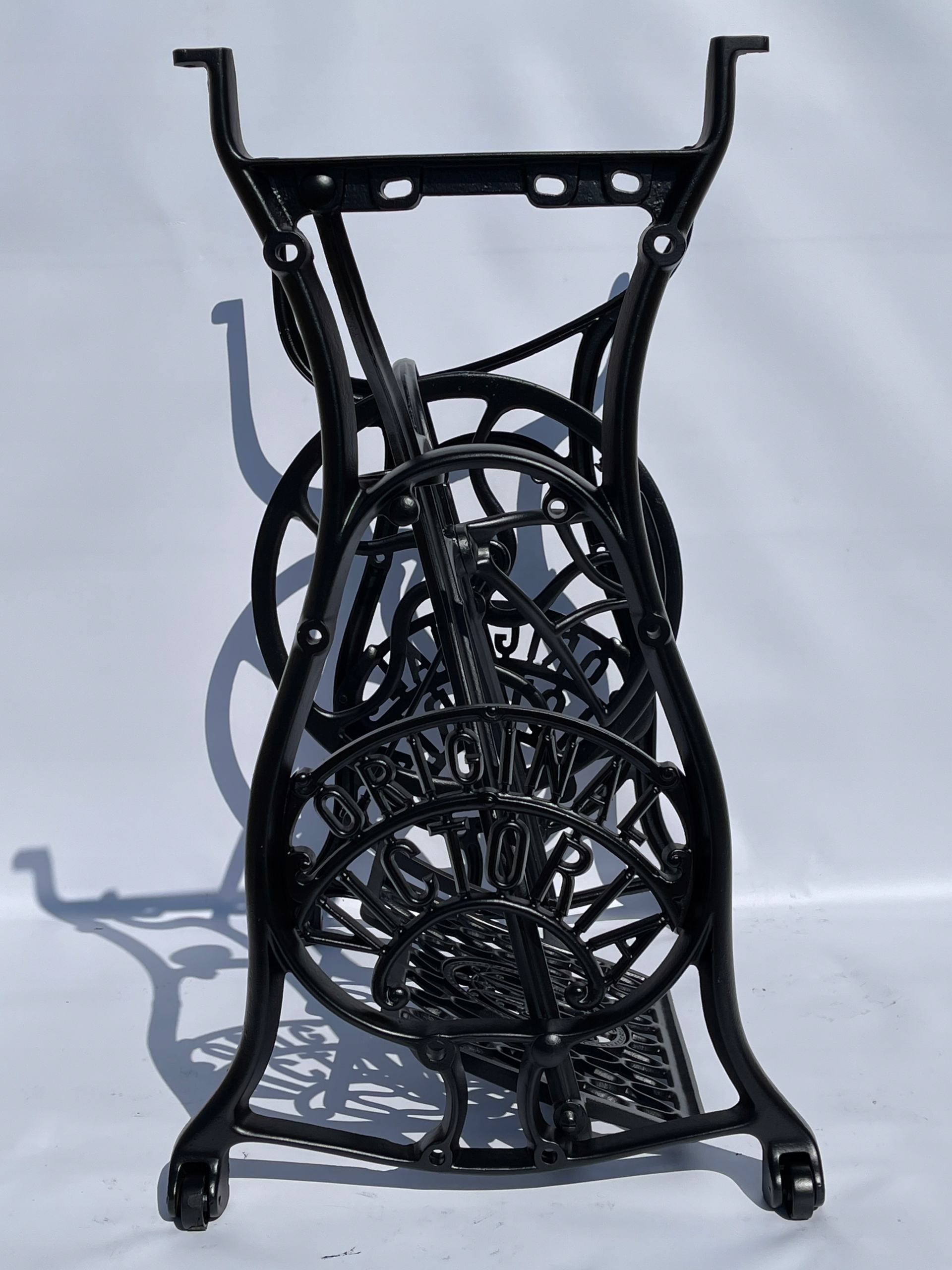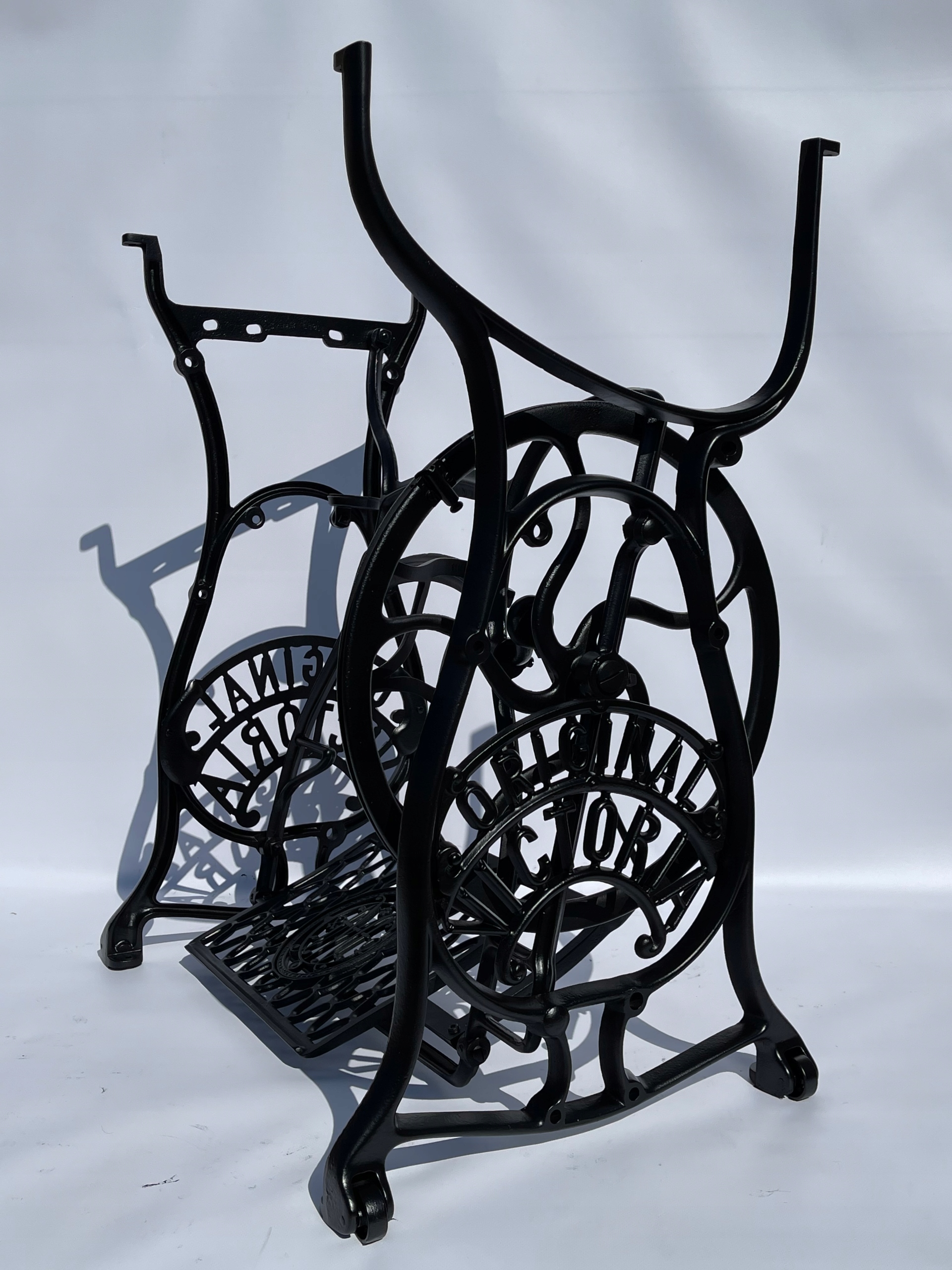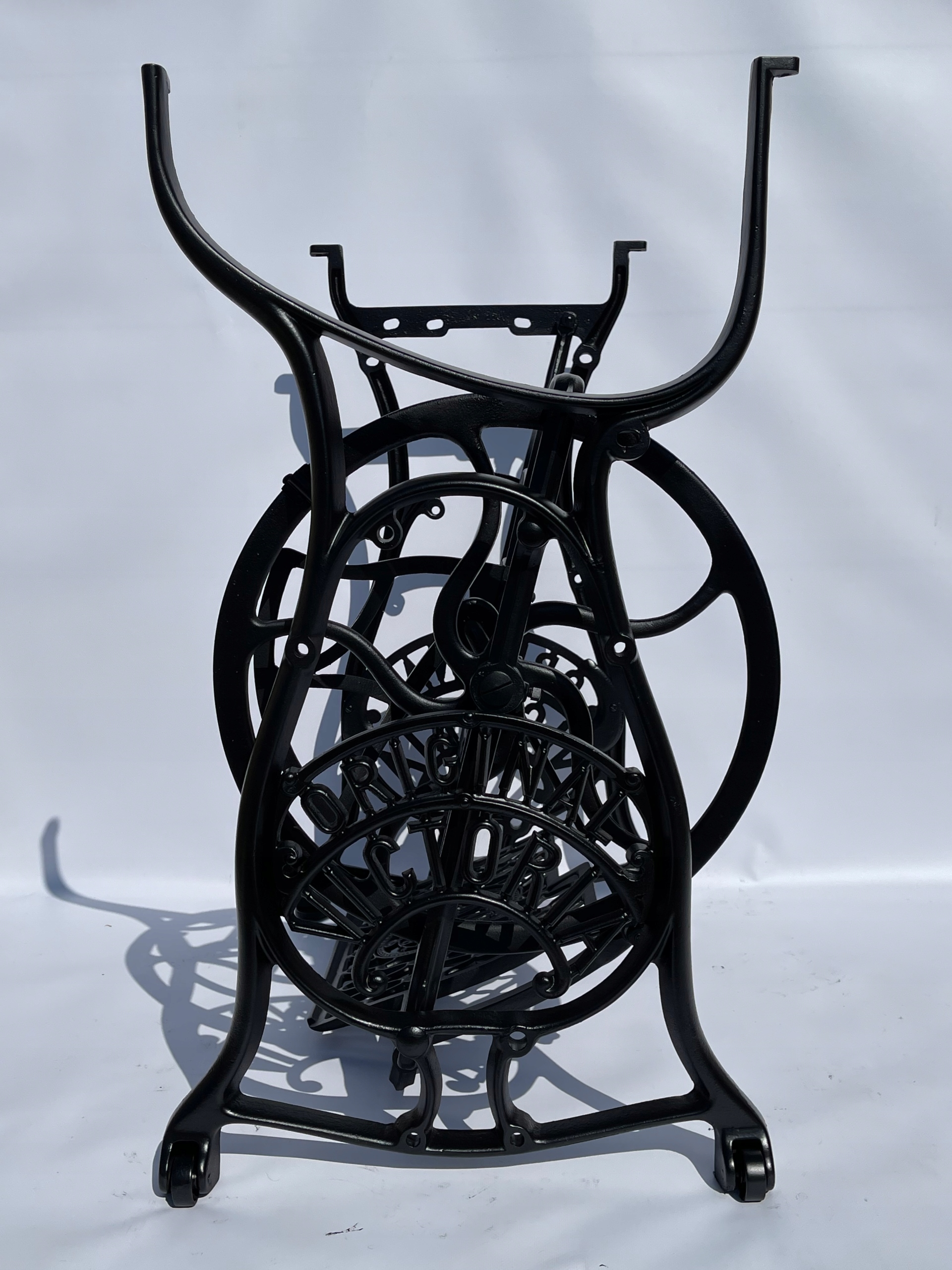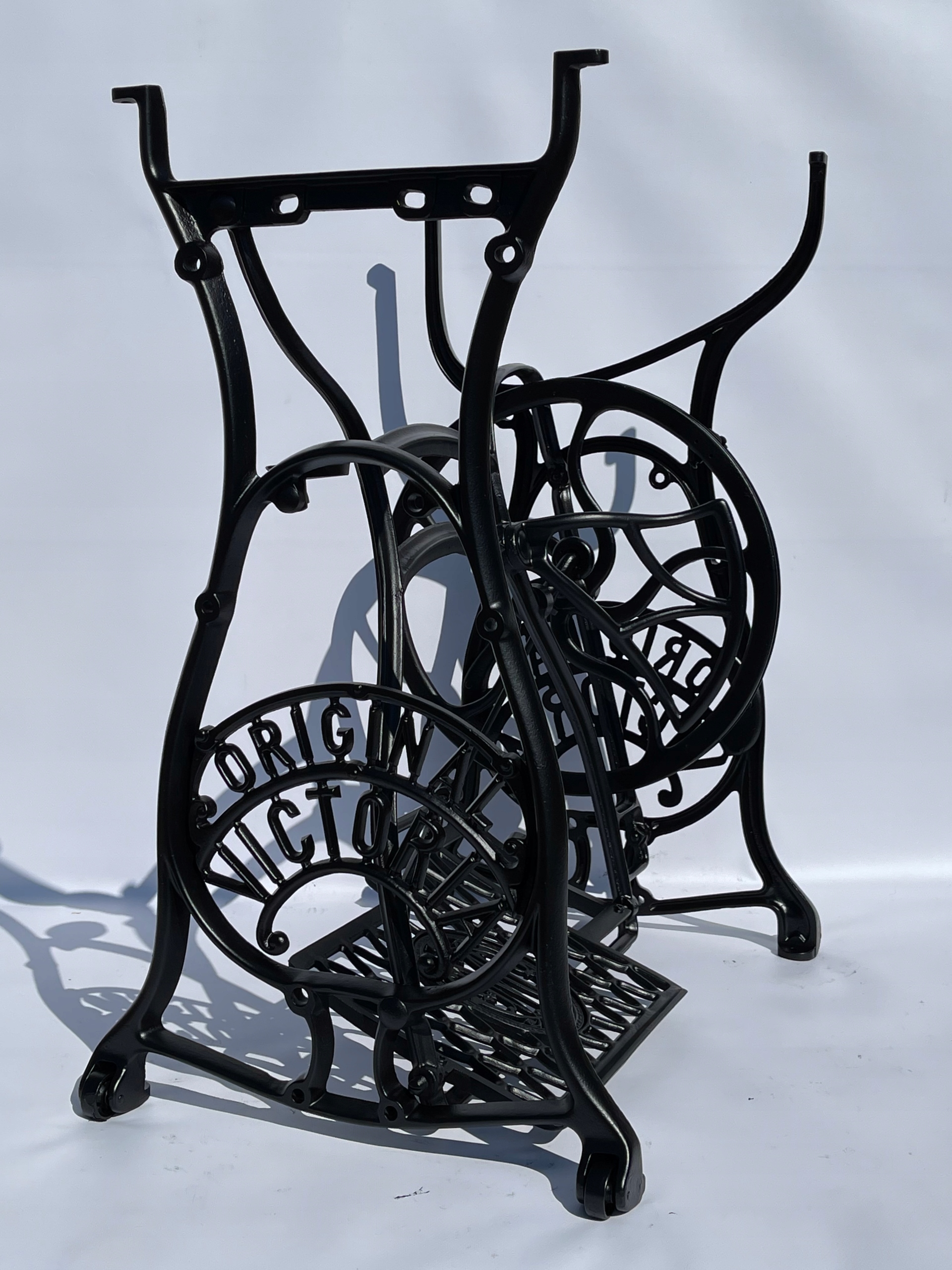 Тема продажу - це стара чавунна основа з оригінальної швейної машини Victoria. Дуже приємний малюнок. Написи з логотипом компанії з боків. У нього є всі 4 колеса внизу. Додатковою перевагою є металевий елемент, що з'єднує колесо з педалі приводу, завдяки якому ми впевнені, що його не їсть дерев’яними, що можливо в базах з дерев’яним елементом. Розміри