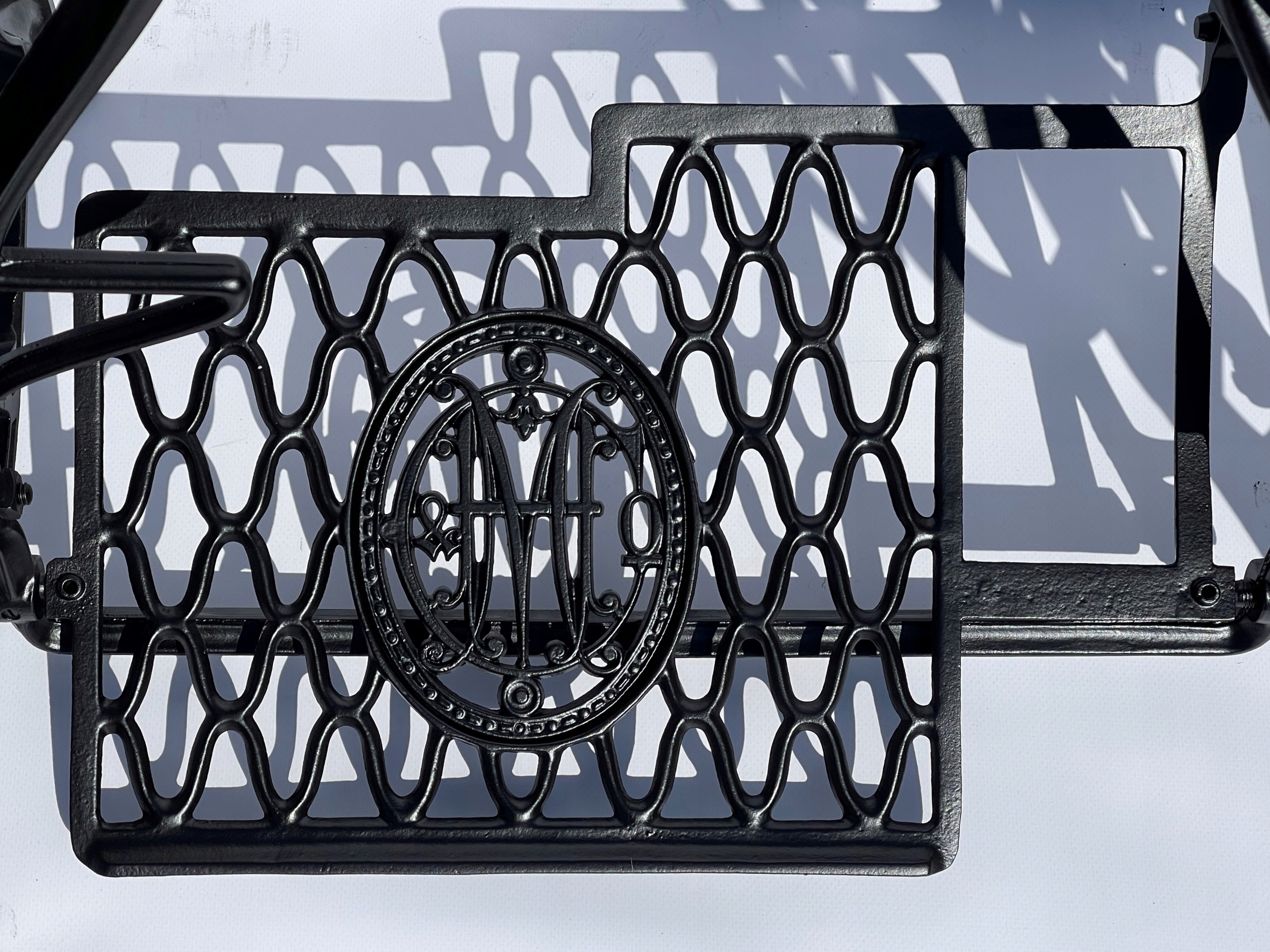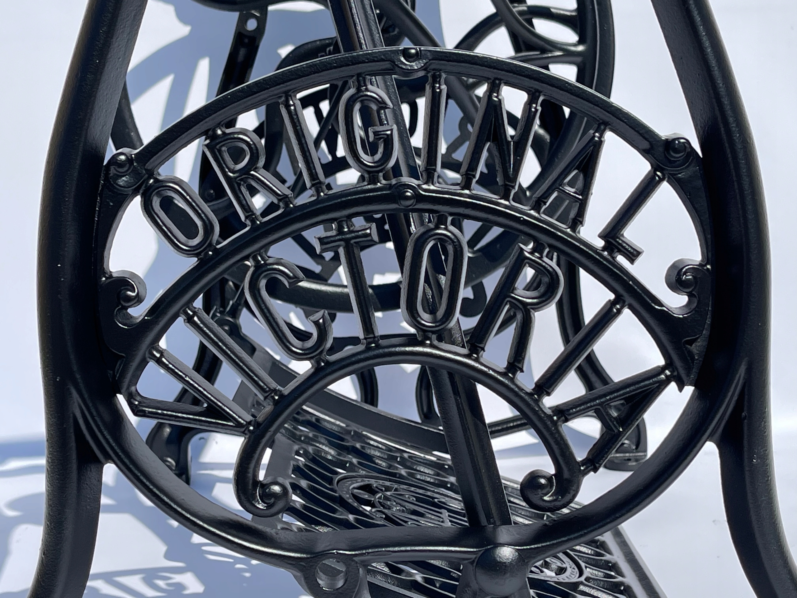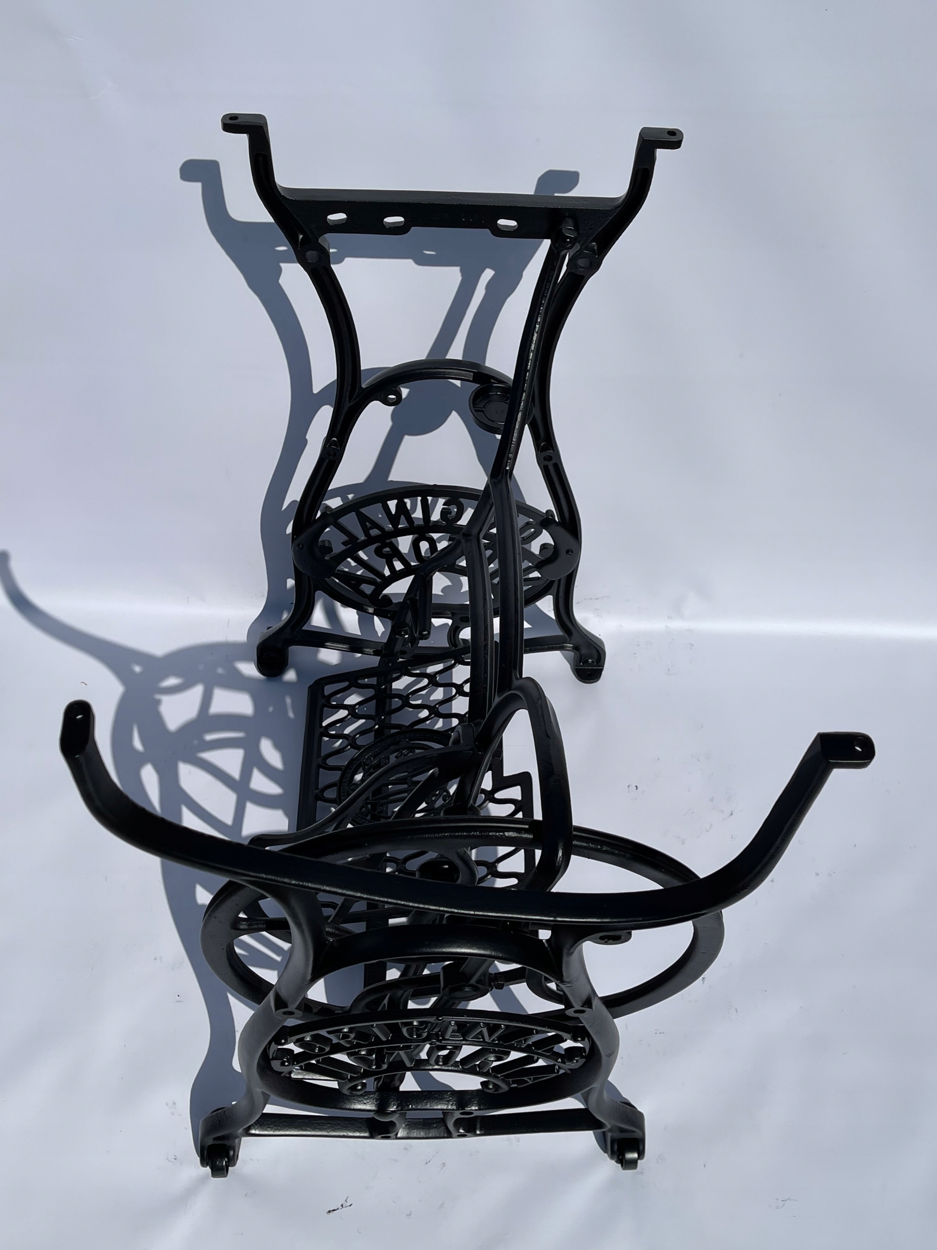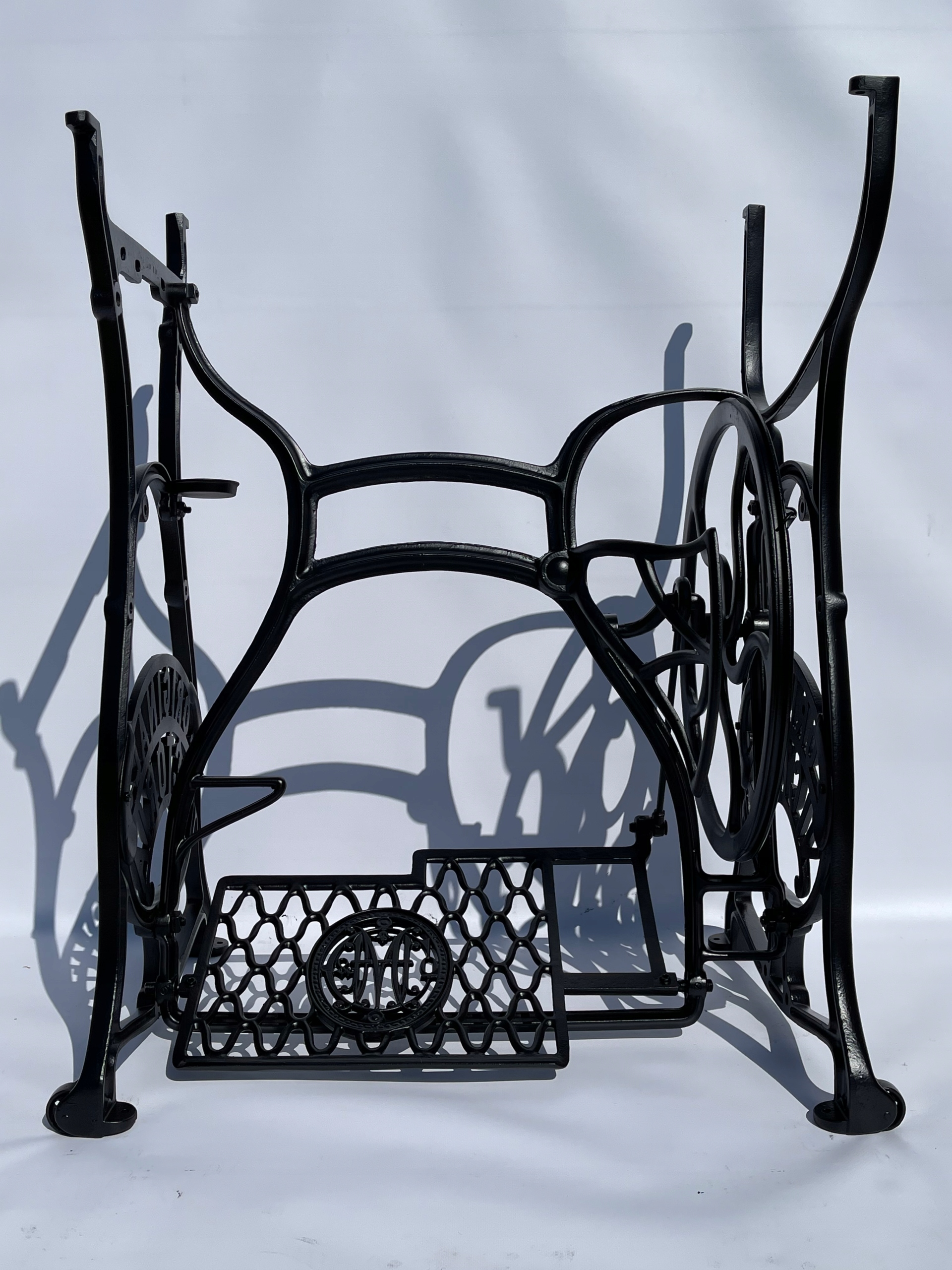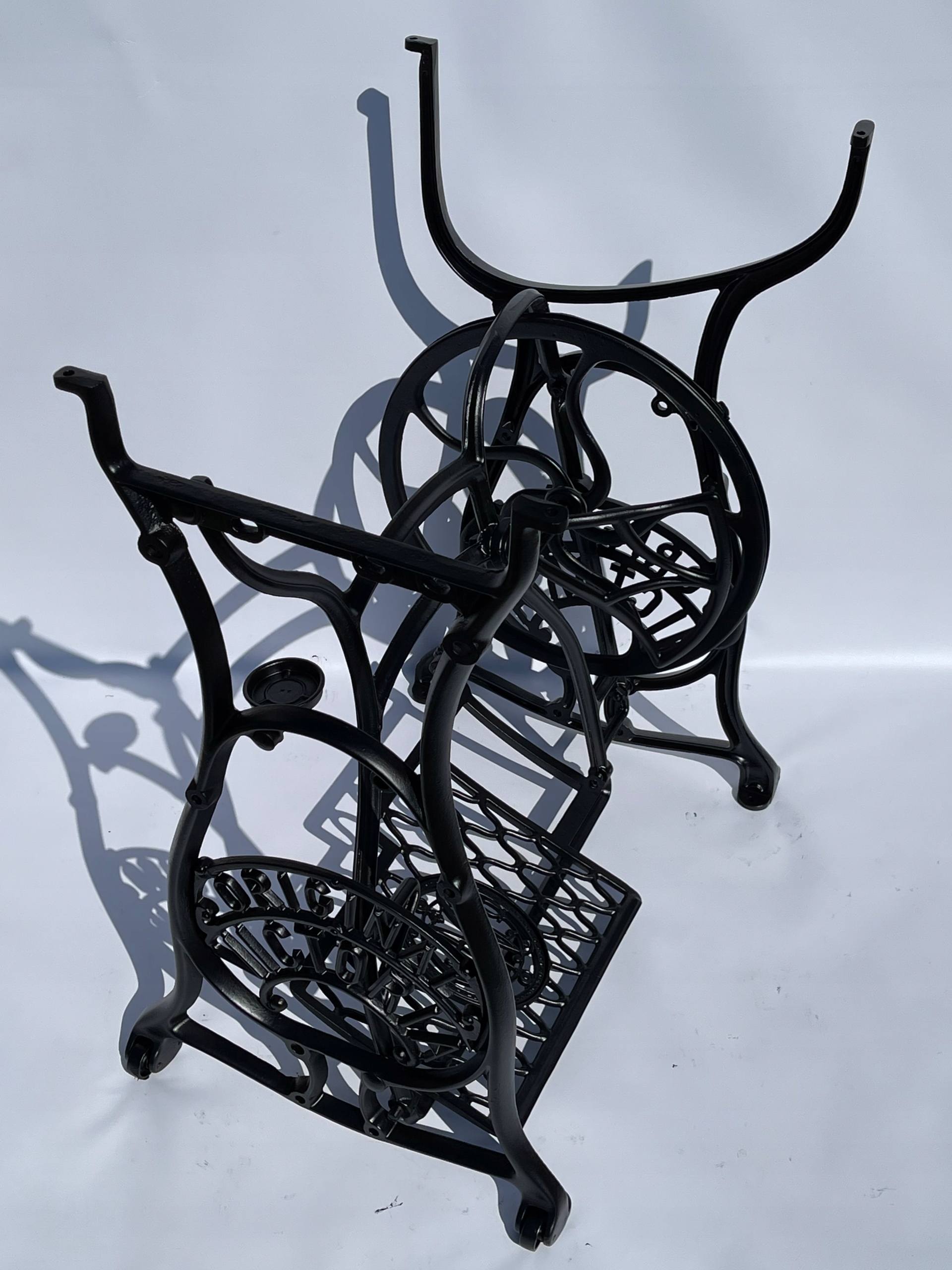 Тема продажу - це стара чавунна основа з оригінальної швейної машини Victoria. Дуже приємний малюнок. Написи з логотипом компанії з боків. У нього є всі 4 колеса внизу. Додатковою перевагою є металевий елемент, що з'єднує колесо з педалі приводу, завдяки якому ми впевнені, що його не їсть дерев’яними, що можливо в базах з дерев’яним елементом. Розміри
