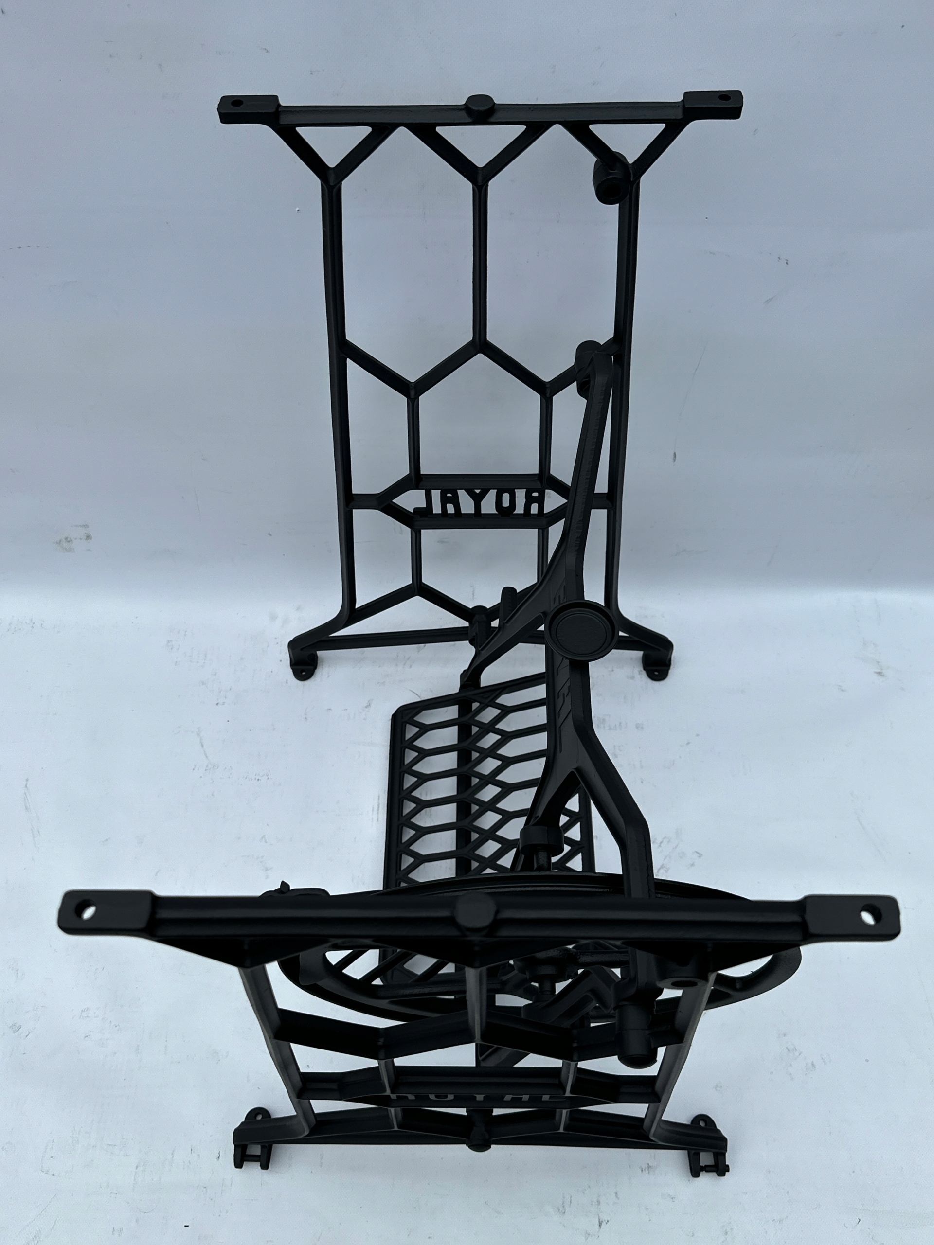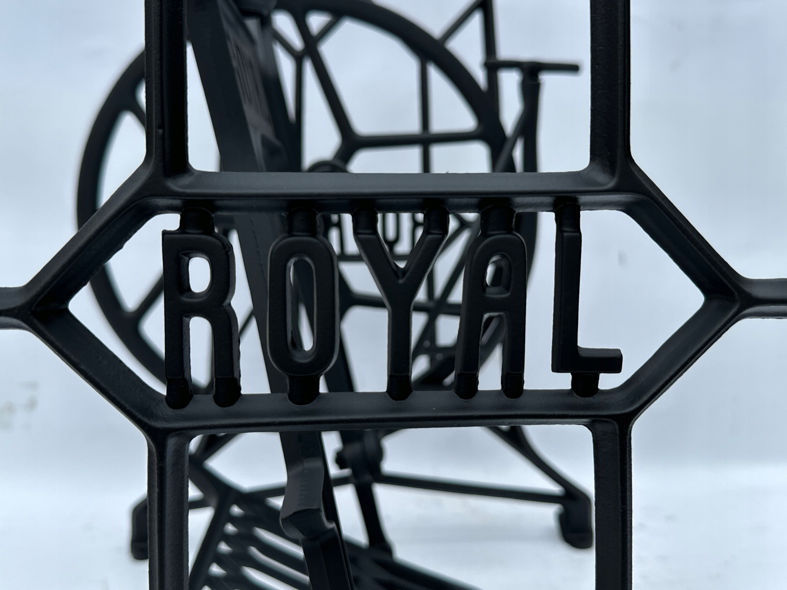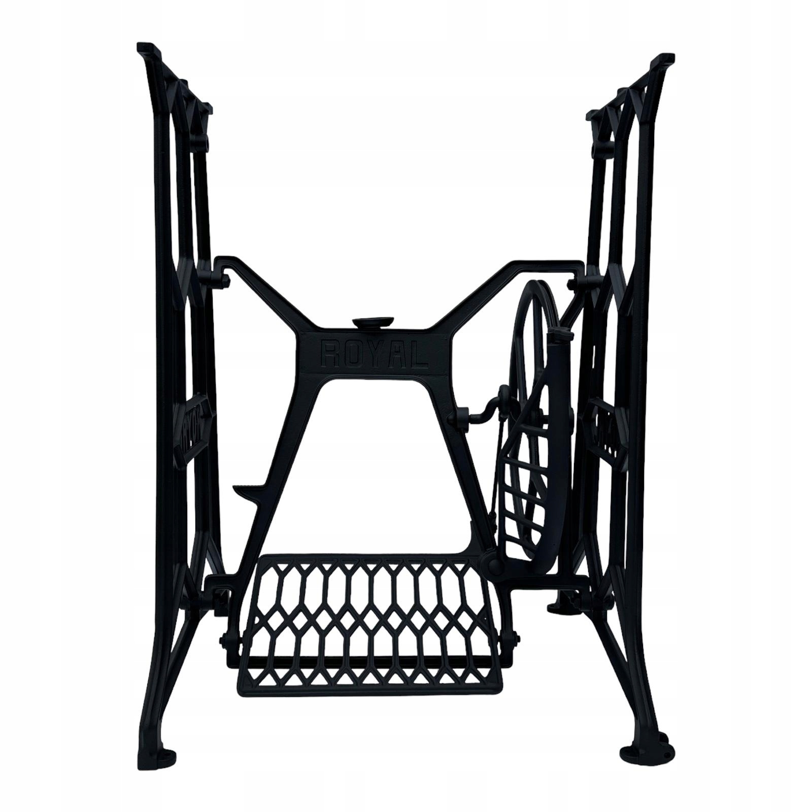 Тема продажу - це стара чавунна основа з королівської швейної машини. Дуже приємний малюнок. З боків і в середній частині написи з логотипом компанії. Колеса, розташовані в нижній частині, були зняті так, що таблиця буде більш стабільною, вона не рухається. Додатковою перевагою є металевий елемент, що з'єднує колесо з педальною приводом, тому ми впевнені, що його не з'їдають дерев’яними ефірами, що можливо в основах з дерев’яним елементом.