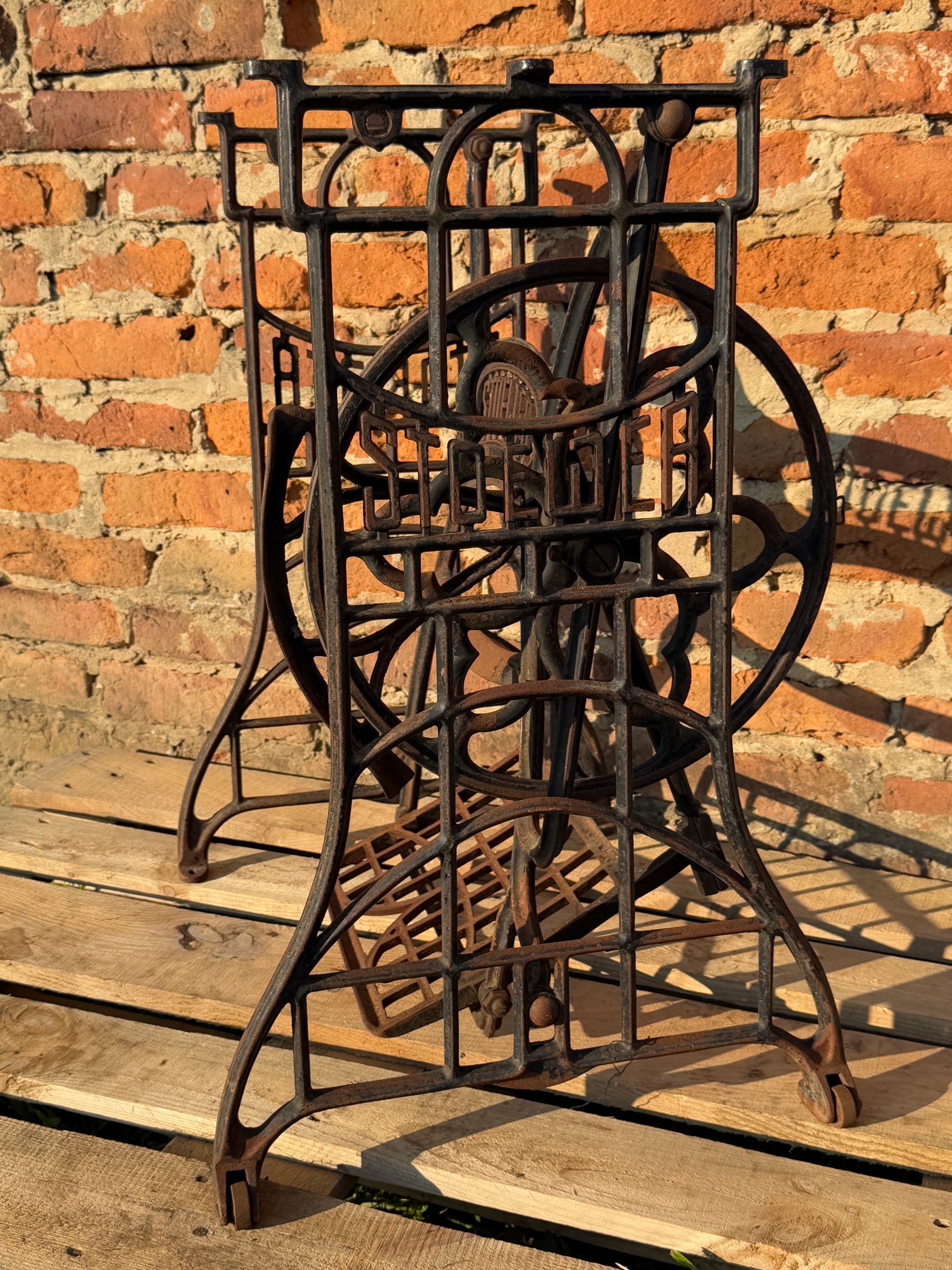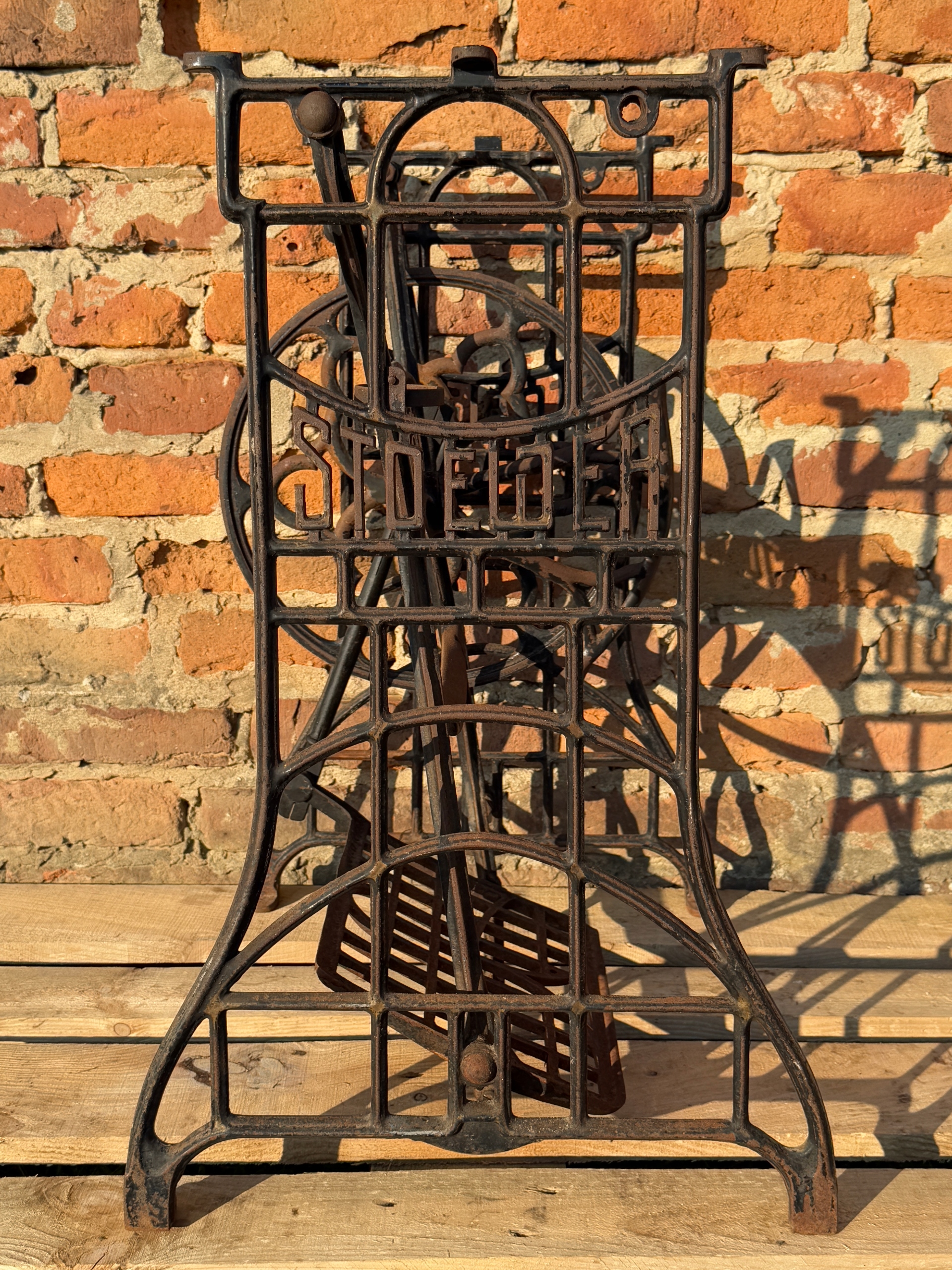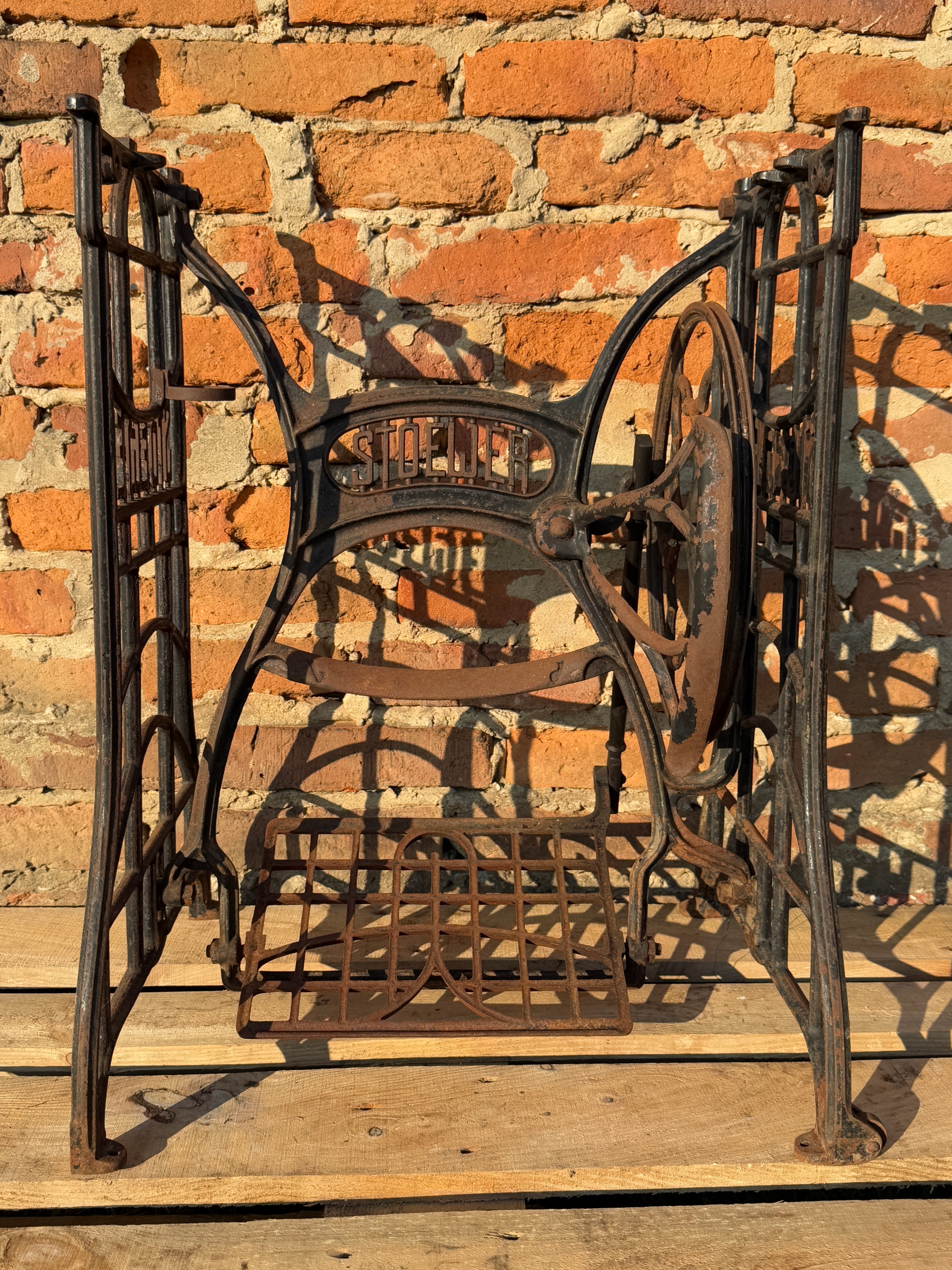Тема продажу - це стара чавунна основа з швейної машини Stoewer. Дуже приємний малюнок, рідше. Основа була створена в довоєнному сцекіні (Stettin). Напис з логотипом компанії з боків. У ньому є обидва колеса в нижній частині.