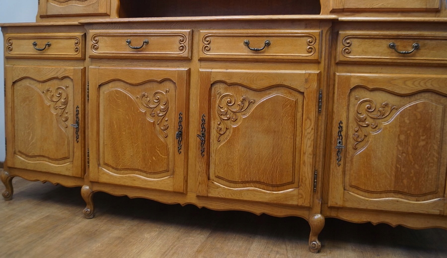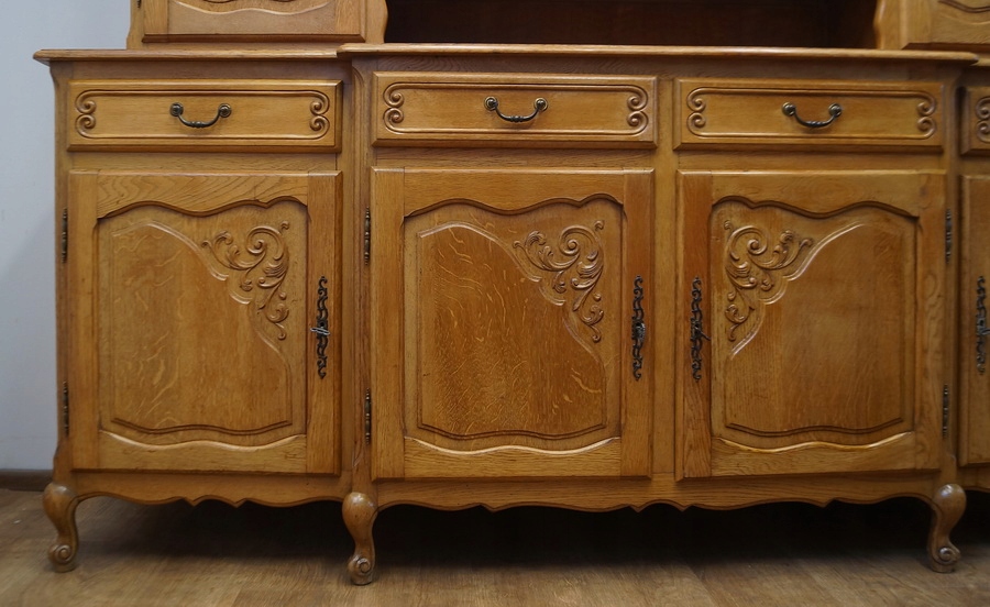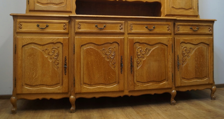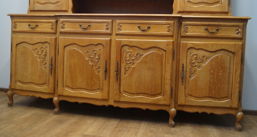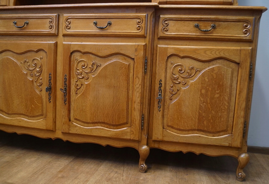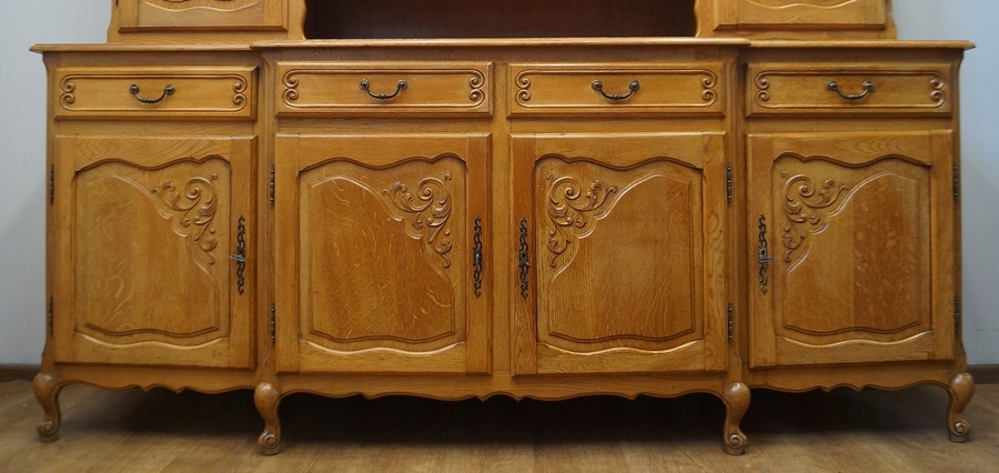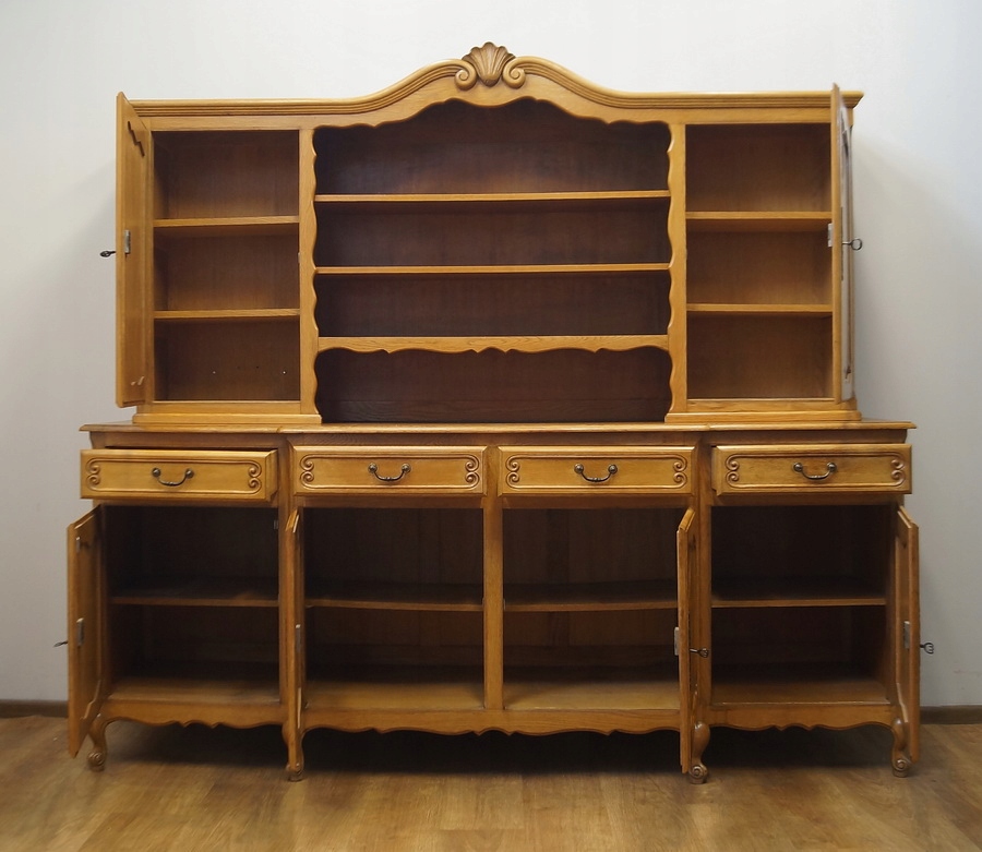 Предмет меблів має чотири дверцята та ящики в нижній частині, дві дверцята у верхній частині та полицю в середині. Предмет меблів прикрашений різьбленням і спирається на красиві ніжки кабріоля. Низ оброблений декоративною оборкою.