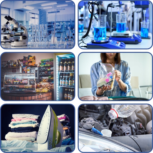 - Застосування: установки центрального опалення, системи підігріву підлоги, промислові контури, парові котли, охолодження та кондиціонування повітря, як сировина в промисловості, як зволожуючий агент, побутова техніка, промислові пральні та прасування приміщення, Автомобільний сектор і промисловість, Виробництво електроніки, Лабораторії, Як лабораторний реагент, Як розчинник
