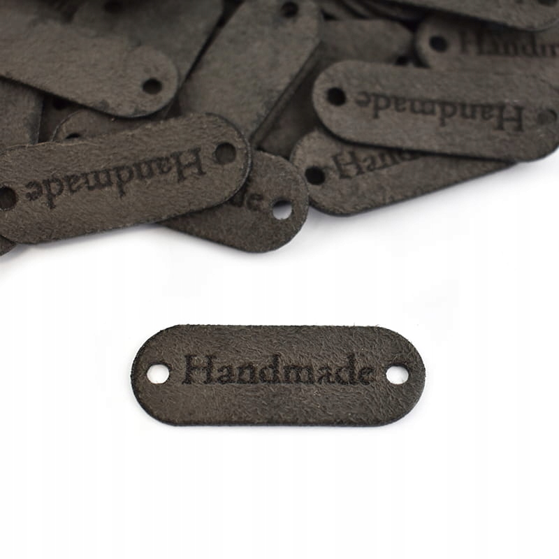 Бирка з нубуку з написом "Handmade" і двома отворами для пришивання.