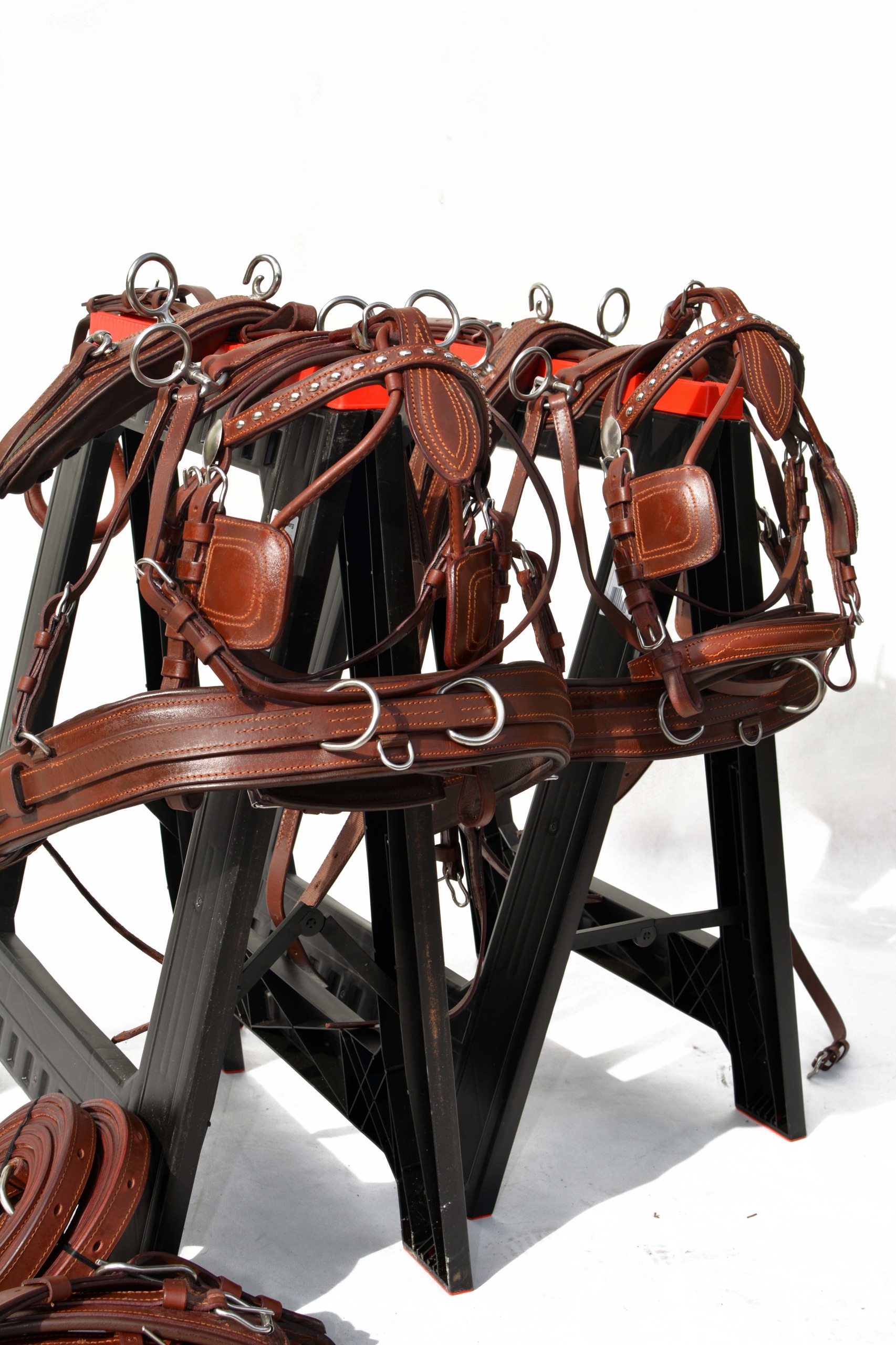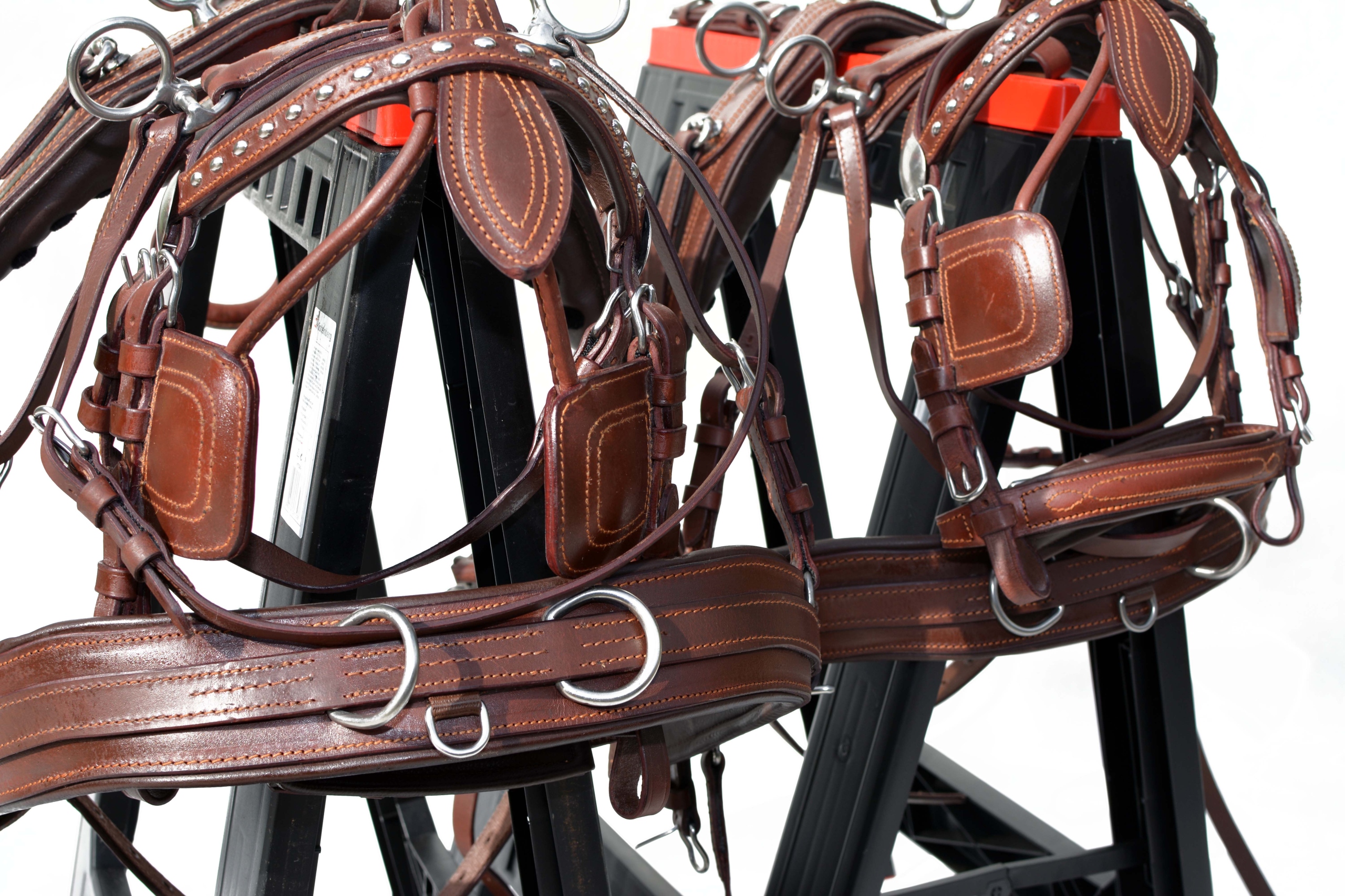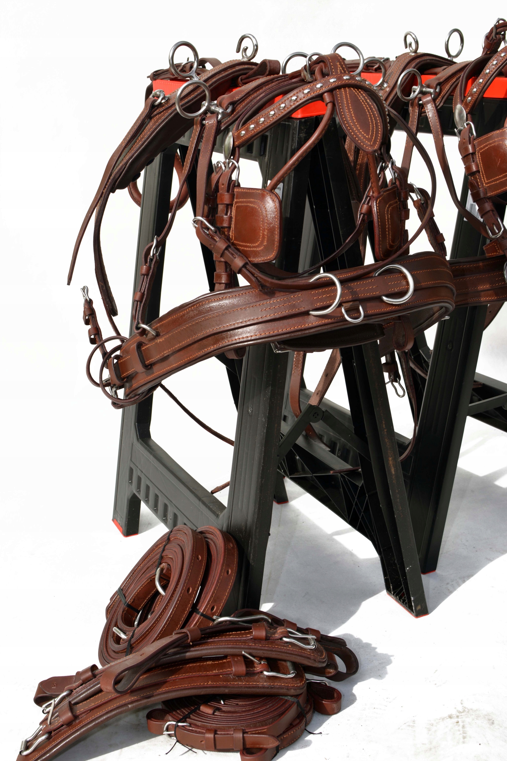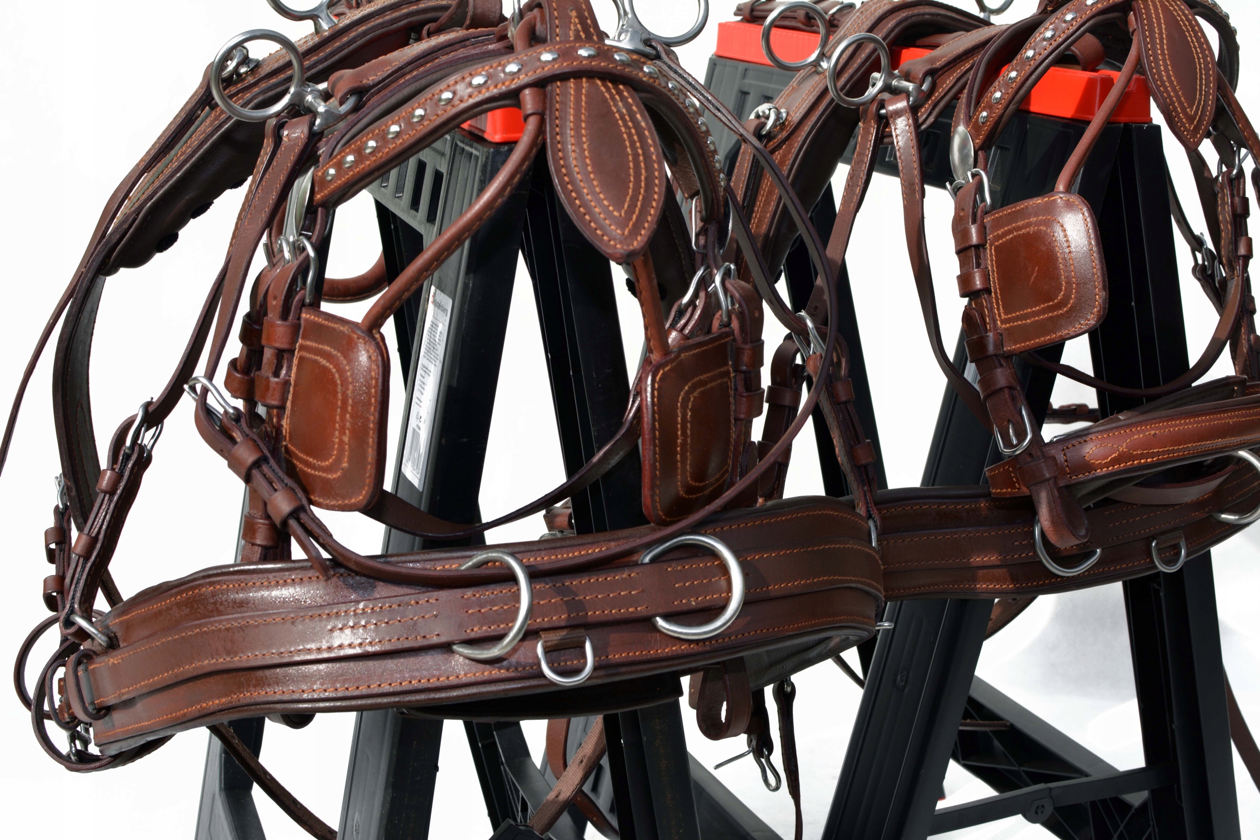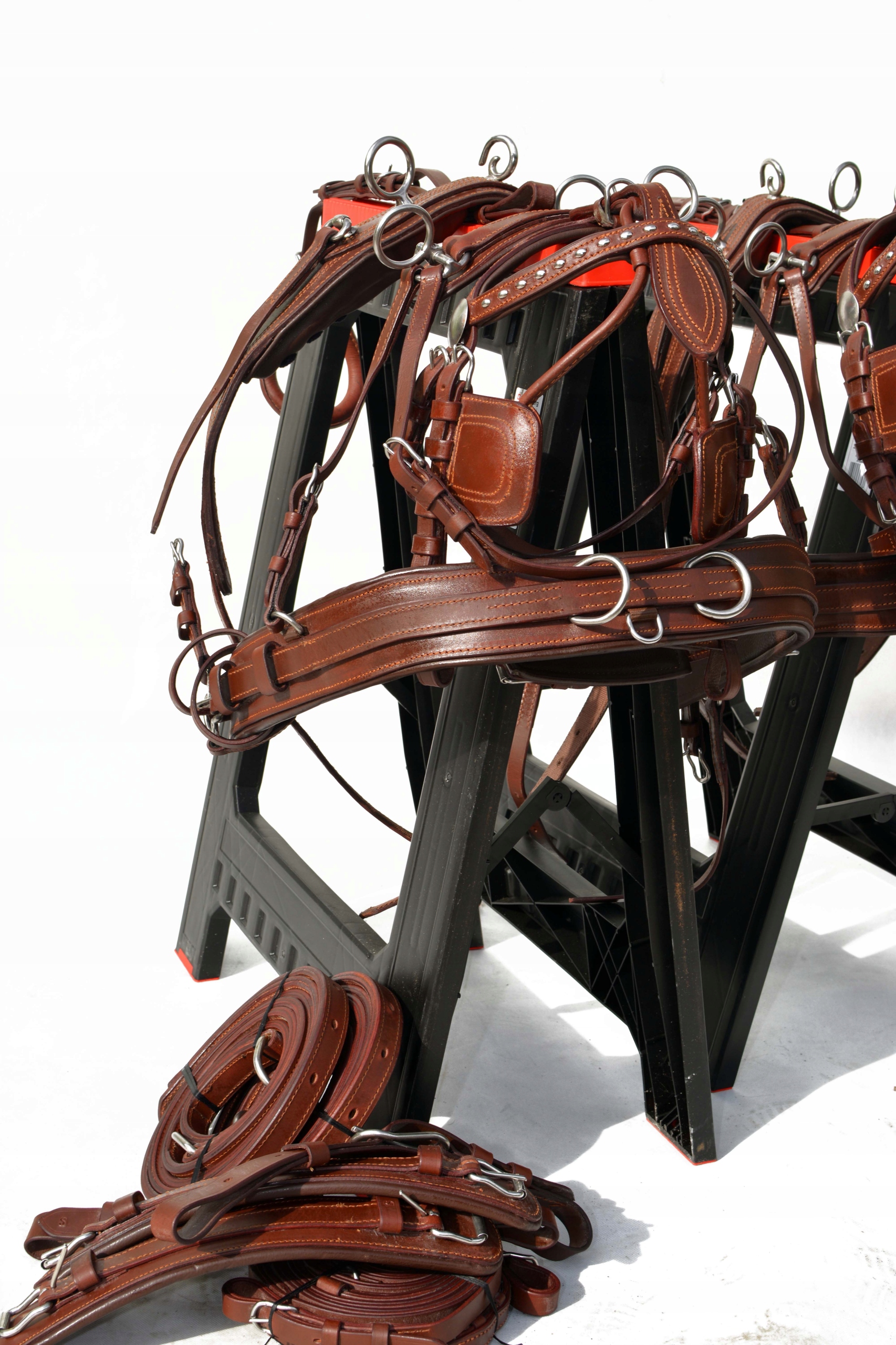 Збруя для пари поні. Упряж виготовлений повністю з дуже якісної, добірної суцільнозернистої шкіри преміум-класу, дуже м'якої та приємної на дотик, з вшитою стрічкою у всі елементи упряжі для зміцнення шкіри в потиличній частині і м'яка фурнітура з неіржавіючої сталі на ринку, ідеально виконана в коричневому або чорному кольорі.