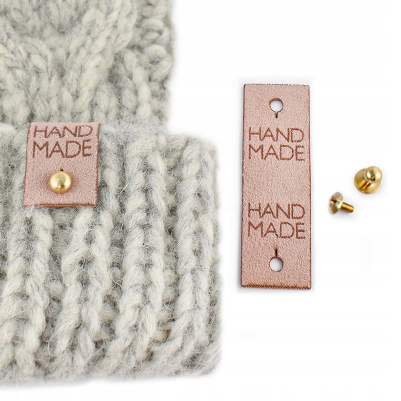 Ярлик з нубуку з написом "HAND MADE" для шапки. Щоб встановити його, складіть тег навпіл і вставте одну частину металевої заклепки через два отвори, а потім загвинтіть іншу частину. Також можна використовувати плоску викрутку. Рекомендуємо зняти бірку перед пранням. Напис розроблено таким чином, щоб його було легко читати незалежно від способу кріплення етикетки. Капелюх на фото зроблено з пряжі Drops Wish.