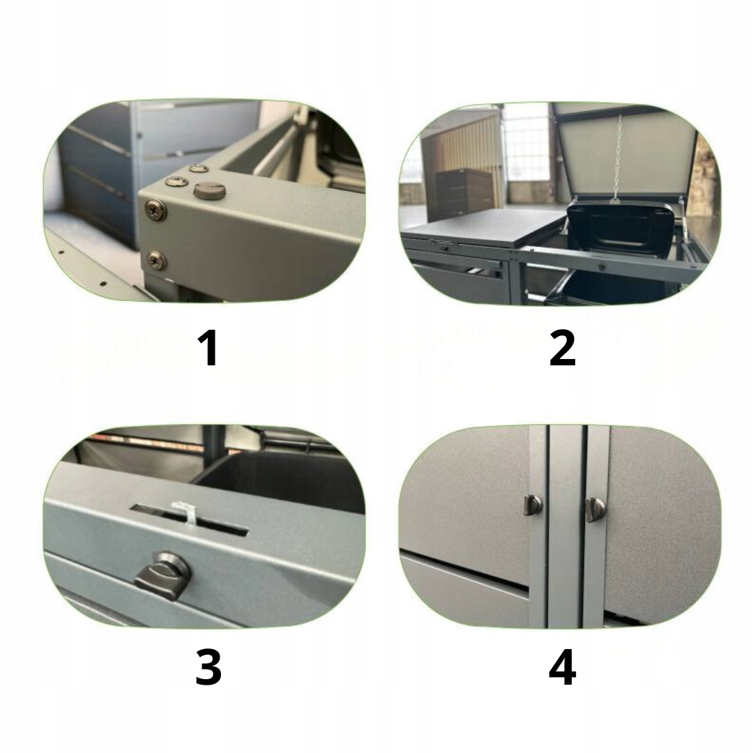 ♻ клаптя на циліндрах із блокуванням висоти, , виготовленим з гарячого -DIP -оцинкованого листа з товщиною 0,5 мм . Оснащений ланцюгом , який може бути прикріплений до контейнера, щоб відкрити смітник безконтактним.